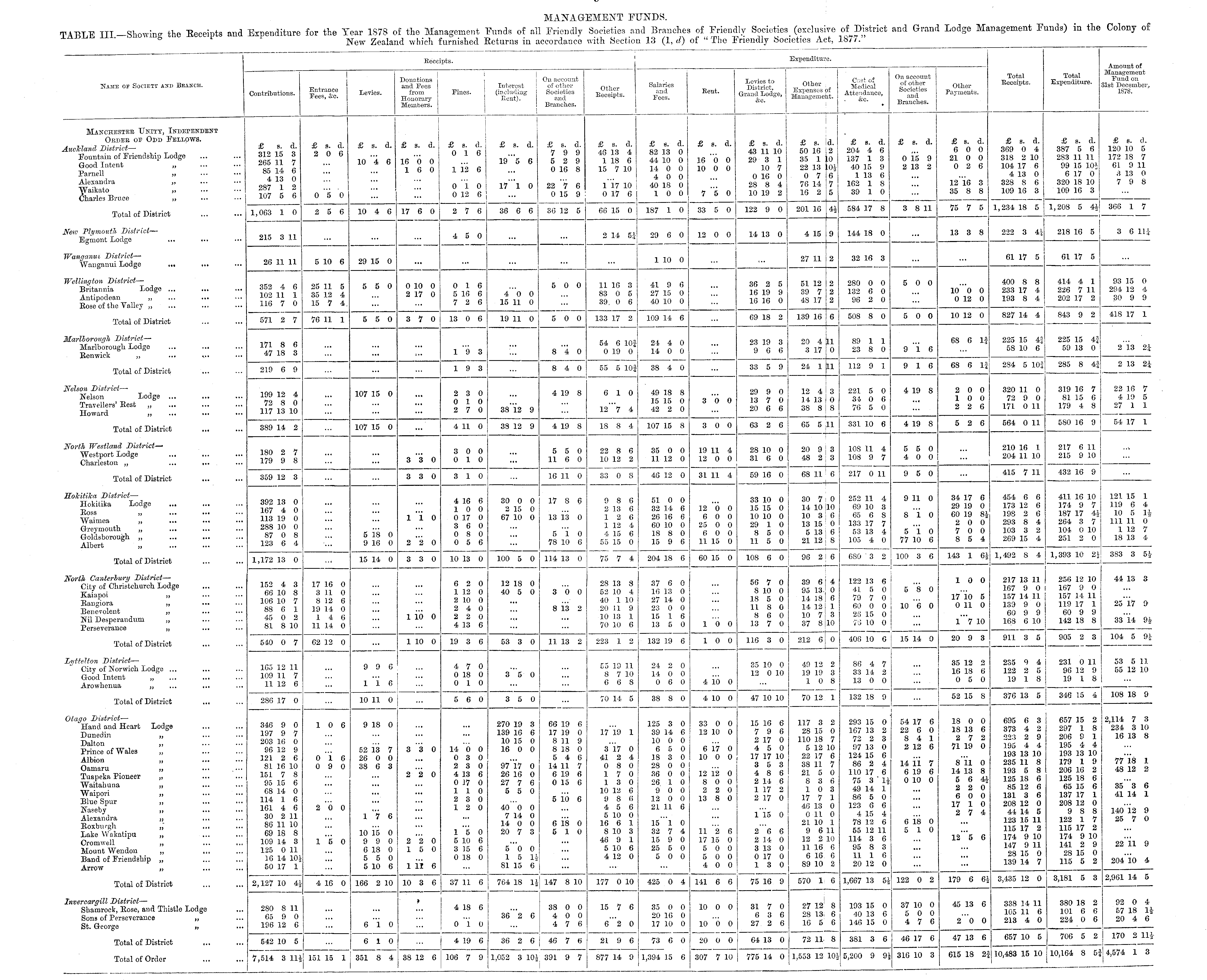 MANAGEMENT FUNDS. TABLE III.— Showing the Receipts and Expenditure for the Year IS78 of the Management Funds of all Friendly Societies and Branches of Friendly Societies (exclusive of District and Grand Lodge Management Funds) in the Colony of New Zealand which furnished Returns in accordance with Section 13 (1, d) of "The Friendly Societies Act, 1877."