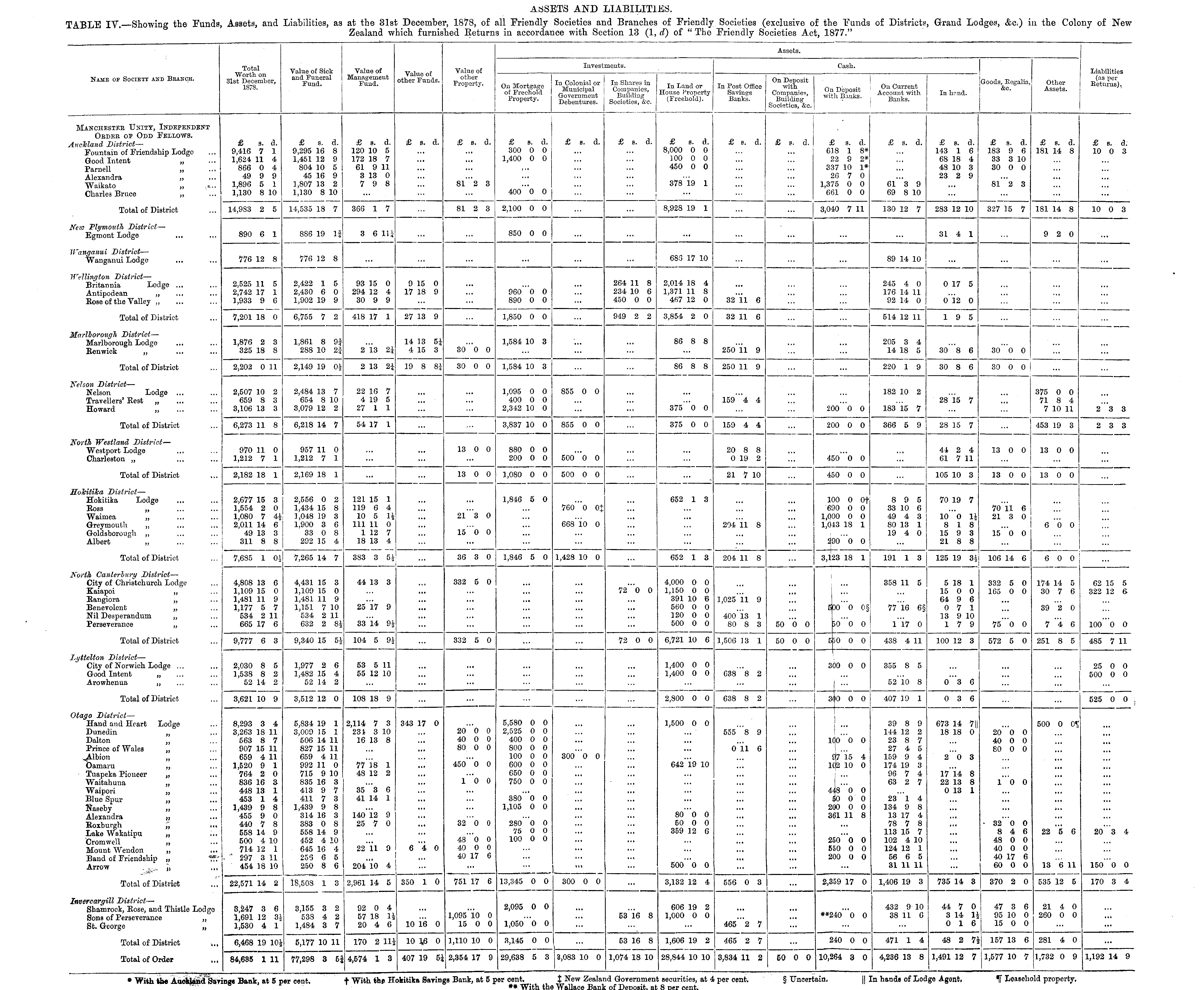 ASSETS AND LIABILITIES. TABLE IV. Showing the Funds, Assets, and Liabilities, as at the 31st December, 1878, of all Friendly Societies and Branches of Friendly Societies (exclusive of the Funds of Districts, Grand Lodges, &c.) in the Colony of New Zealand which furnished Returns in accordance with Section 13 (1, d) of "The Friendly Societies Act, 1877."