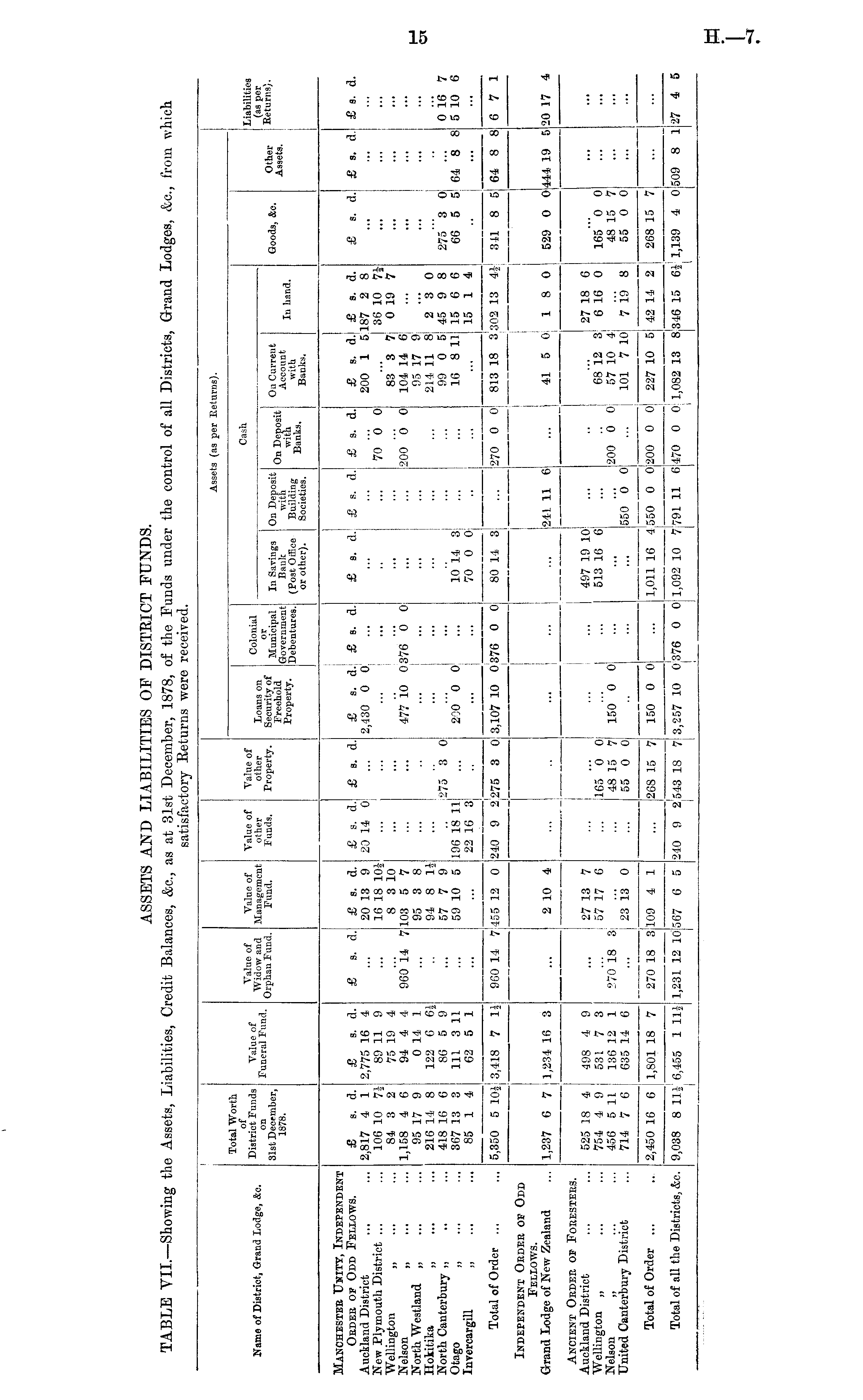 ASSETS AND LIABILITIES OF DISTRICT FUNDS. TABLE VII.—Showing the Assets, Liabilities, Credit Balances, &c., as at 31st December, 1878, of the Funds under the control of all Districts, Grand Lodges, &c., from which. satisfactory Returns were received.