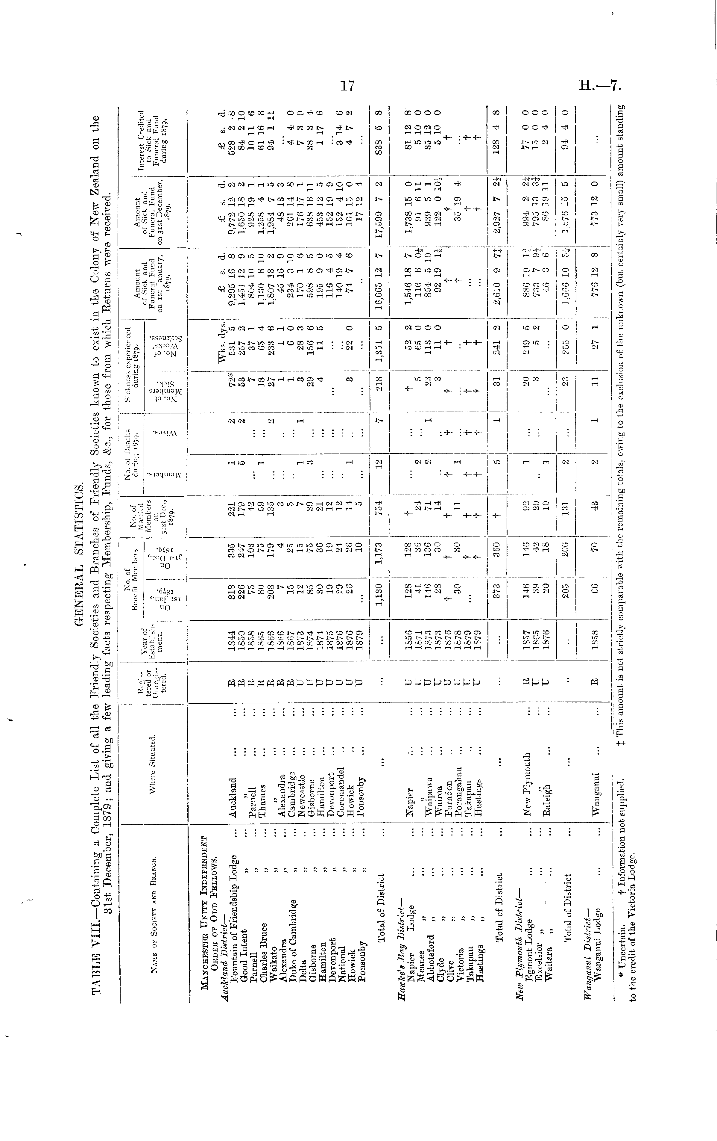 GENERAL STATISTICS. TABLE VIII.—Containing a Complete List of all the Friendly Societies and Branches of Friendly Societies known to exist in the Colony of New Zealand on the 31st December, 1879; and giving a few leading facts respecting Membership, Funds, &c., for those from which Returns were received.