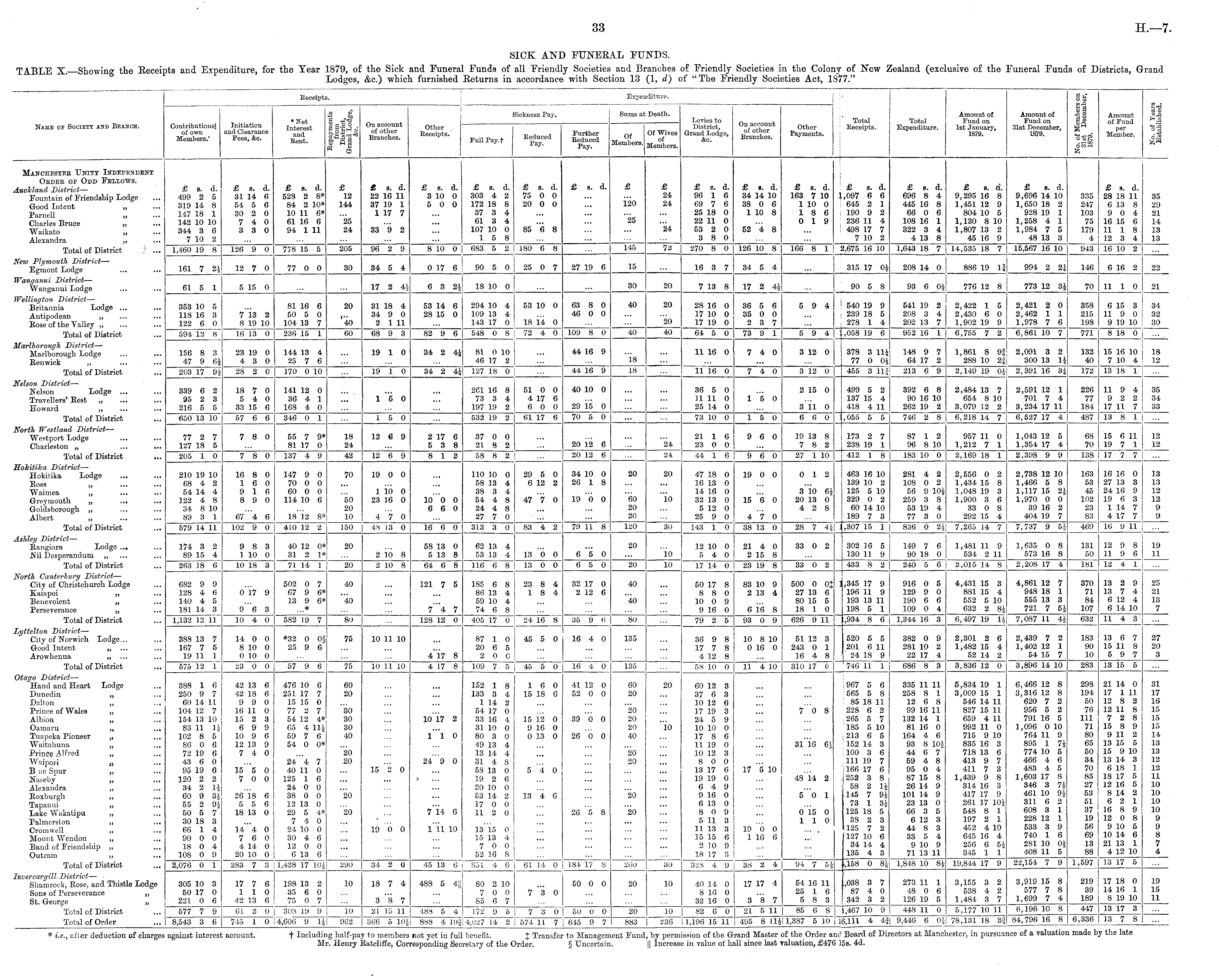 SICK AND FUNERAL FUNDS. TABLE X. Showing the Receipts and Expenditure, for the Year 1879, of the Sick and Funeral Funds of all Friendly Societies and Branches of Friendly Societies in the Colony of New Zealand (exclusive of the Funeral Funds of Districts, Grand Lodges, &c.) which furnished Returns in accordance with Section 13 (1, d) of "The Friendly Societies Act, 1877."