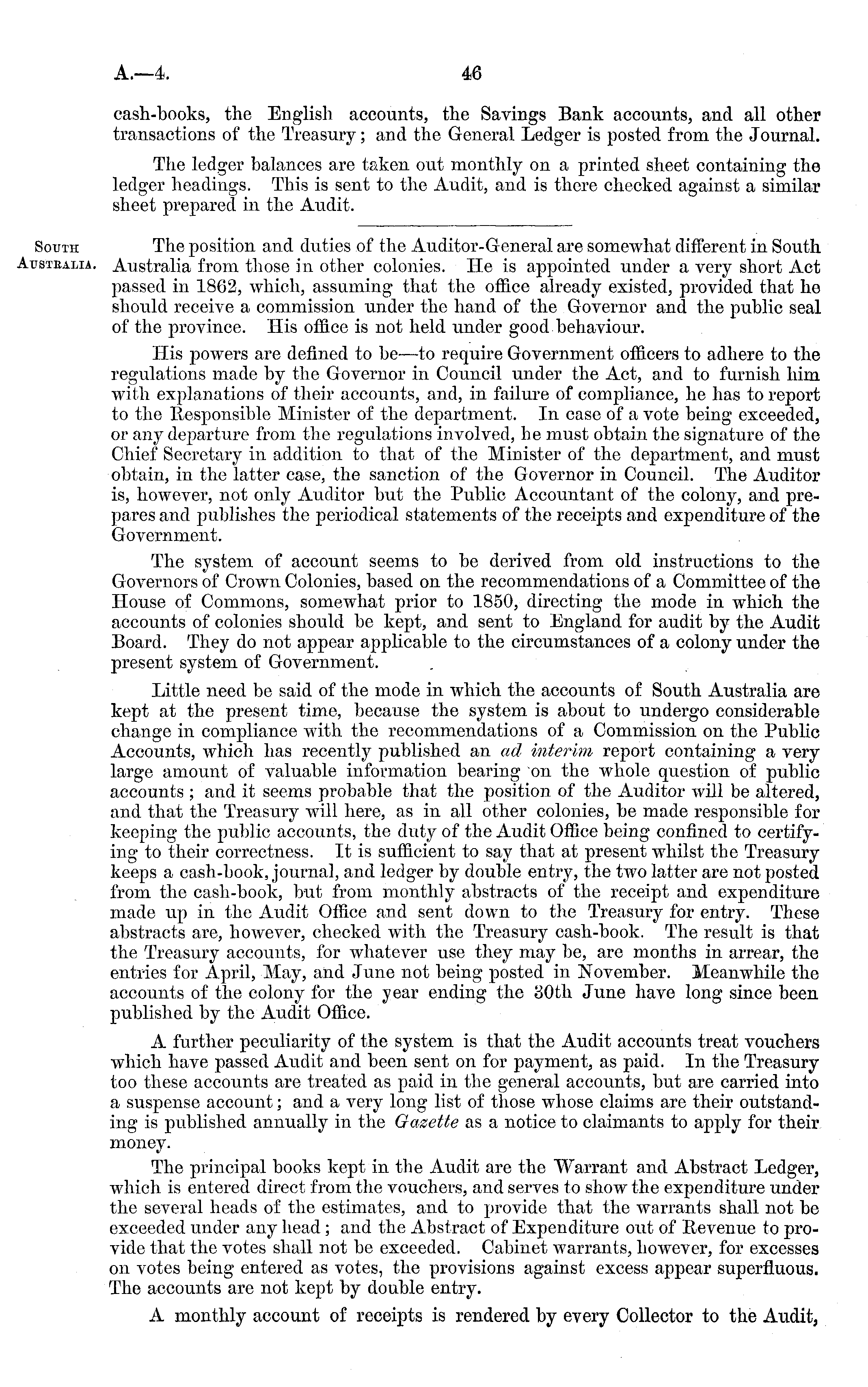 The position and duties of the Auditor-General are somewhat different in South Australia from those in other colonies. He is appointed under a very short Act passed in 1862, which, assuming that the office already existed, provided that he should receive a commission under the hand of the Governor and the public seal of the province. His office is not held under good behaviour. His powers are denned to be—to require Government officers to adhere to the regulations made by the Governor in Council under the Act, and to furnish him with explanations of their accounts, and, in failure of compliance, he has to report to the Responsible Minister of the department. In case of a vote being exceeded, or any departure from the regulations involved, he must obtain the signature of the Chief Secretary in addition to that of the Minister of the department, and must obtain, in the latter case, the sanction of the Governor in Council. The Auditor is, however, not only Auditor but the Public Accountant of the colony, and prepares and publishes the periodical statements of the receipts and expenditure of the Government. The system of account seems to be derived from old instructions to the Governors of Crown Colonies, based on the recommendations of a Committee of the House of Commons, somewhat prior to 1850, directing the mode in which the accounts of colonies should be kept, and sent to England for audit by the Audit Board. They do not appear applicable to the circumstances of a colony under the present system of Government. Little need be said of the mode in which the accounts of South Australia are kept at the present time, because the system is about to undergo considerable change in compliance with the recommendations of a Commission on the Public Accounts, which has recently published an ad interim report containing a very large amount of valuable information bearing on the whole question of public accounts ; and it seems probable that the position of the Auditor will be altered, and that the Treasury will here, as in all other colonies, be made responsible for keeping the public accounts, the duty of the Audit Office being confined to certifying to their correctness. It is sufficient to say that at present whilst the Treasury keeps a cash-book, journal, and ledger by double entry, the two latter are not posted from the cash-book, but from monthly abstracts of the receipt and expenditure made up in the Audit Office and sent down to the Treasury for entry. These abstracts are, however, checked with the Treasury cash-book. The result is that the Treasury accounts, for whatever use they may be, are months in arrear, the entries for April, May, and June not being posted in November. Meanwhile the accounts of the colony for the year ending the 30th June have long since been published by the Audit Office. A further peculiarity of the system is that the Audit accounts treat vouchers which have passed Audit and been sent on for payment, as paid. In the Treasury too these accounts are treated as paid in the general accounts, but are carried into a suspense account; and a very long list of those whose claims are their outstanding is published annually in the Gazette as a notice to claimants to apply for their money. The principal books kept in the Audit are the Warrant and Abstract Ledger, which is entered direct from the vouchers, and serves to show the expenditure under the several heads of the estimates, and to provide that the warrants shall not be exceeded under any head; and the Abstract of Expenditure out of Revenue to provide that the votes shall not be exceeded. Cabinet warrants, however, for excesses on votes being entered as votes, the provisions against excess appear superfluous. The accounts are not kept by double entry. A monthly account of receipts is rendered by every Collector to the Audit,