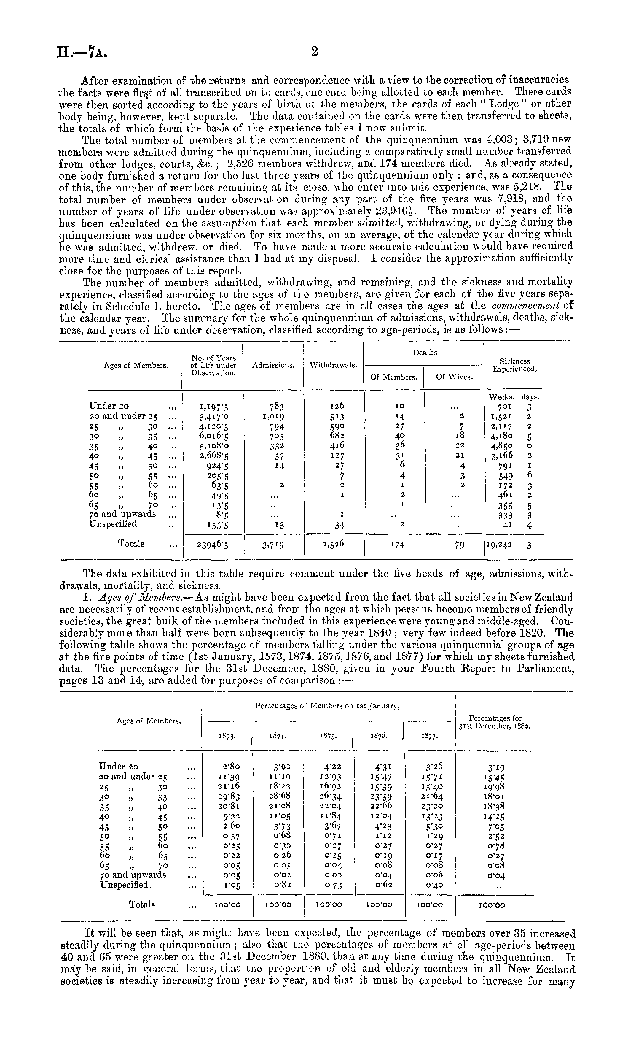 The data exhibited in this table require comment under the five heads of age, admissions, withdrawals, mortality, and sickness. 1. Ages of Members. —As might have been expected from the fact that all societies in New Zealand are necessarily of recent establishment, and from the ages at which persons become members of friendly societies, the great bulk of the members included in this experience were young and middle-aged. Considerably more than half were born subsequently to the year 1840 ; very few indeed before 1820. The following table shows the percentage of members falling under the various quinquennial groups of age at the five points of time (Ist January, 1873,1874,1875,1870, and 1877) for which my sheets furnished data. The percentages for the 31st December, 1880, given in your Fourth Eeport to Parliament, pages 13 and 14, are added for purposes of comparison : —