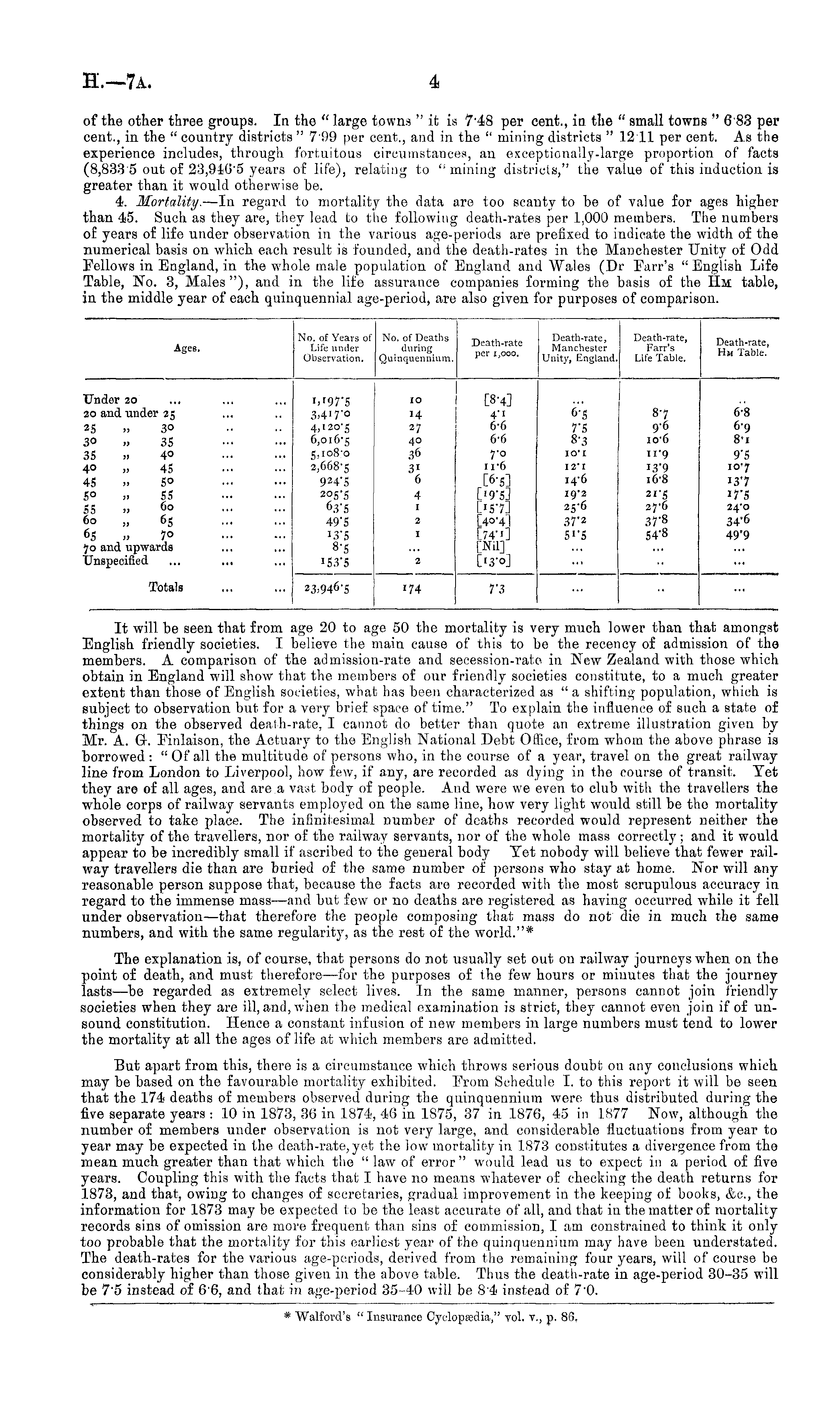 It will be seen that from age 20 to age 50 the mortality is very much, lower than that amongst English friendly societies. I believe the main cause of this to be the recency of admission of the members. A comparison of the admission-rate and secession-rate in New Zealand with those which obtain in England will show that the members of our friendly societies constitute, to a much greater extent than those of English societies, what has been characterized as " a shifting population, which is subject to observation but for a very brief space of time." To explain the influence of such a state of things on the observed death-rate, I cannot do better than quote an extreme illustration given by Mr. A. Gγ. Finlaison, the Actuary to the English National Debt Office, from whom the above phrase is borrowed : " Of all the multitude of persons who, in the course of a year, travel on the great railway line from London to Liverpool, how few, if any, are recorded as dying in the course of transit. Tet they are of all ages, and are a vast body of people. And were we even to club with the travellers the whole corps of railway servants employed on the same line, how very light would still be the mortality observed to take place. The infinitesimal number of deaths recorded would represent neither the mortality of the travellers, nor of the railway servants, nor of the whole mass correctly; and it would appear to be incredibly small if ascribed to the general body Tet nobody will believe that fewer railway travellers die than are buried of the same number of persons who stay at home. Nor will any reasonable person suppose that, because the facts are recorded with the most scrupulous accuracy in regard to the immense mass—and but few or no deaths are registered as having occurred while it fell under observation —that therefore the people composing that mass do not die in much the same numbers, and with the same regularity, as the rest of the world."* The explanation is, of course, that persons do not usualhy set out on railway journeys when on the point of death, and must therefore —for the purposes of Ihe few hours or minutes that the journey lasts —be regarded as extremely select lives. In the same manner, persons cannot join friendly societies when they are ill, and, when the medical examination is strict, they cannot even join if of unsound constitution. Hence a constant infusion of new members in large numbers must tend to lower the mortality at all the ages of life at which members are admitted. But apart from this, there is a circumstance which throws serious doubt on any conclusions which may be based on the favourable mortality exhibited. Prom Schedule I. to this report it will be seen that the 174 deaths of members observed during the quinquennium were thus distributed during the five separate years ;10 in 1873, 36 in 1874, 48 in 1875, 37 in 1876, 45 in 1.877 Now, although the number of members under, observation is not very large, and considerable fluctuations from year to year may be expected in the death-rate, yet the low mortality in 1873 constitutes a divergence from the mean much greater than that which the " law of error" would lead us to expect in a period of five years. Coupling this with the facts that I have no means whatever of checking the death returns for 1873, and that, owing to changes of secretaries, gradual improvement in the keeping of books, &c, the information for 1873 may be expected to be the least accurate of all, and that in the matter of mortality records sins of omission are more frequent than sins of commission, I am constrained to think it only too probable that the mortality for this earliest year of the quinquennium may have been understated. The death-rates for the various age-periods, derived from the remaining four years, will of course be considerably higher than those given in the above table. Thus the death-rate in age-period 30-35 will be 75 instead of 66, and that in age-period 35-40 will be B'4 instead of 7'o.