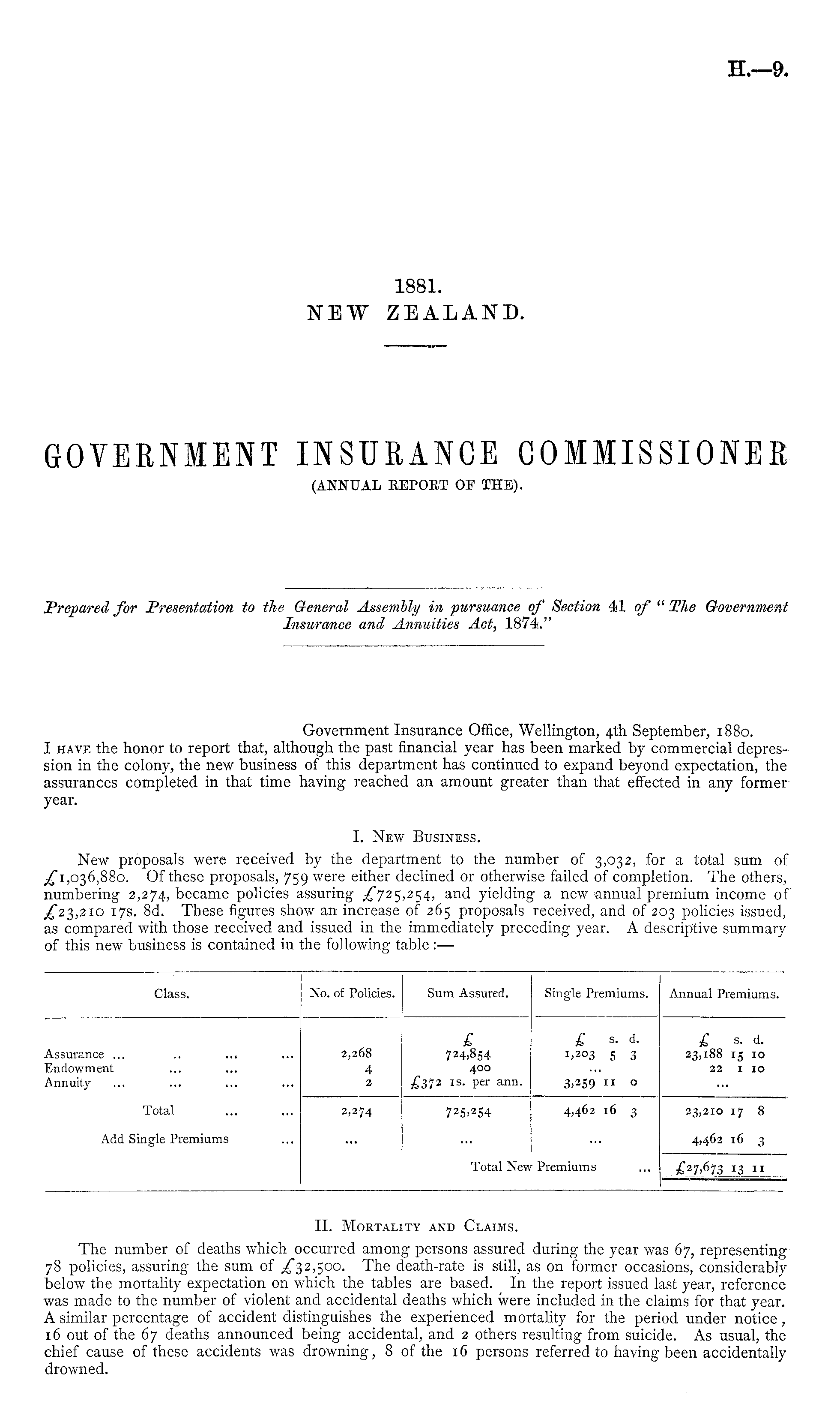 Government Insurance Office, Wellington, 4th September, 1880. I have the honor to report that, although the past financial year has been marked by commercial depression in the colony, the new business of this department has continued to expand beyond expectation, the assurances completed in that time having reached an amount greater than that effected in any former year. I. New Business. New proposals were received by the department to the number of 3,032, for a total sum of Of these proposals, 759 were either declined or otherwise failed of completion. The others, numbering 2,274, became policies assuring and yielding a new annual premium income of 17s. Bd. These figures show an increase of 265 proposals received, and of 203 policies issued, as compared with those received and issued in the immediately preceding year. A descriptive summary of this new business is contained in the following table : —