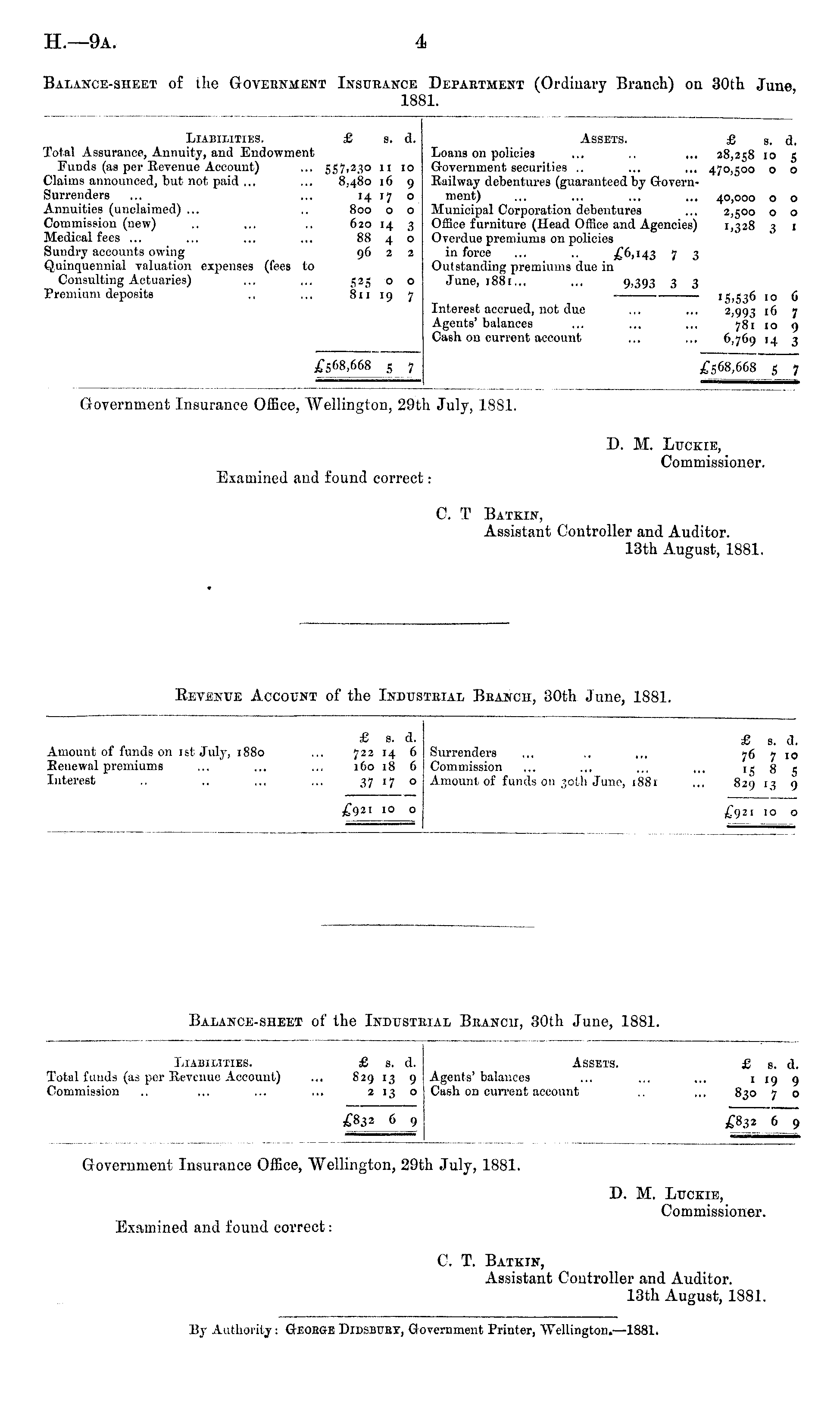 Government Insurance Office, Wellington, 29th July, 1881. D. M. Luckie, Commissioner. Examined and found correct: C. T. Batkin, Assistant Controller and Auditor. 13th August, 1881.