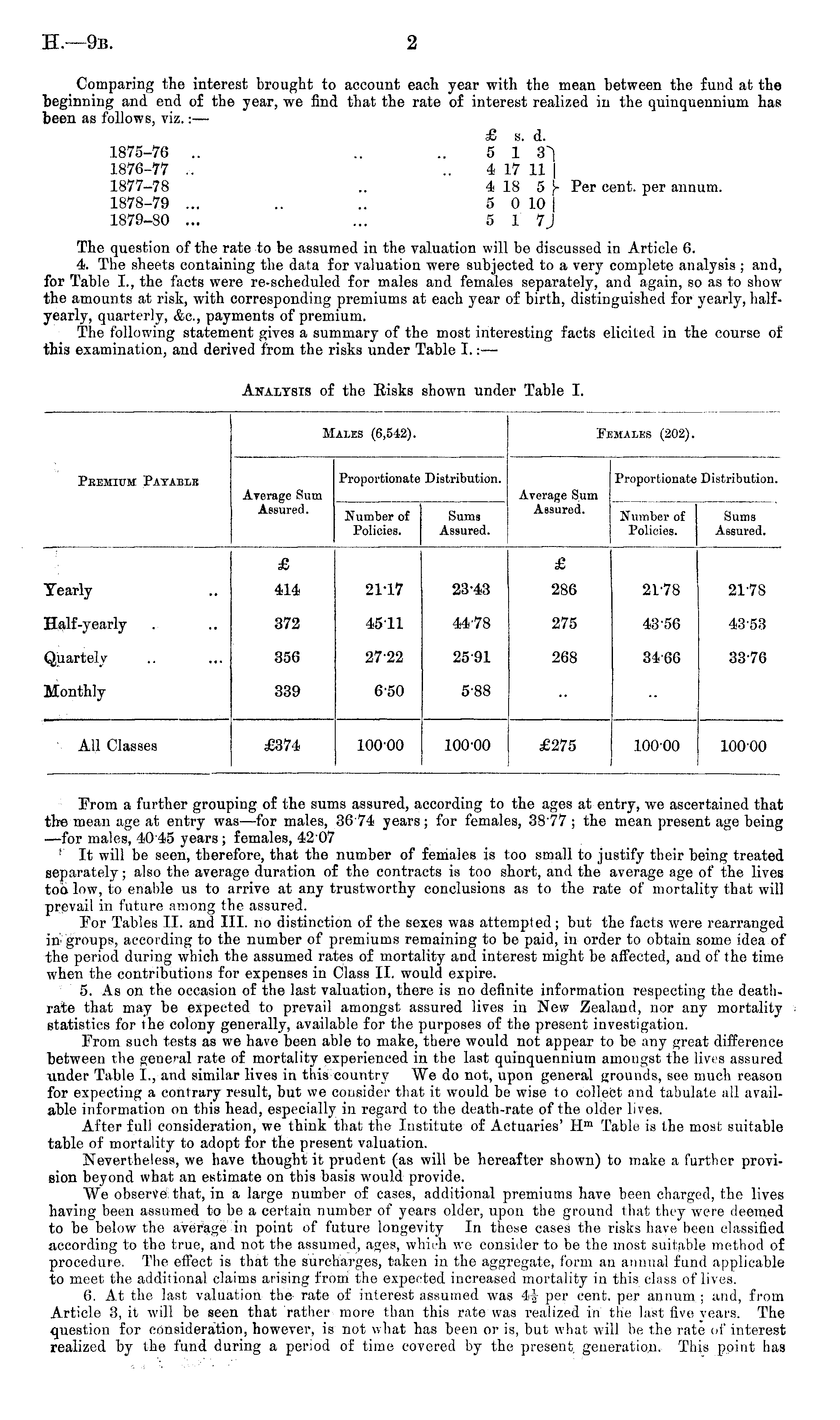 From a further grouping of the sums assured, according to the ages at entry, we ascertained that tbe mean age at entry was —for males, 36 74 years; for females, 3877 ; the mean present age being —for males, 40 45 years ; females, 4207 ; It will be seen, therefore, that the number of females is too small to justify their being treated separately; also the average duration of the contracts is too short, and the average age of the lives tod low, to enable us to arrive at any trustworthy conclusions as to the rate of mortality that will prevail in future among the assured. For Tables 11. and 111. no distinction of the sexes was attempted; but the facts were rearranged in groups, according to the number of premiums remaining to be paid, in order to obtain some idea of the period during which the assumed rates of mortality and interest might be affected, and of the time when the contributions for expenses in Class 11. would expire. 5. As on the occasion of the last valuation, there is no definite information respecting the deathrate that may be expected to prevail amongst assured lives in New Zealand, nor any mortality statistics for the colony generally, available for the purposes of the present investigation. From such tests as we have been able to make, there would not appear to be any great difference between the general rate of mortality experienced in the last quinquennium amongst the lives assured under Table 1., and similar lives in this country We do not, upon general grounds, see much reason for expecting a contrary result, but we consider that it would be wise to collect and tabulate all available information on this head, especially in regard to the death-rate of the older lives. After full consideration, we think that the Institute of Actuaries' H m Table is the most suitable table of mortality to adopt for the present valuation. Nevertheless, we have thought it prudent (as will be hereafter shown) to make a further provision beyond what an estimate on this basis would provide. We observe: that, in a large number of cases, additional premiums have been charged, the lives having been assumed to be a certain number of years older, upon the ground that they were deemed to be below the average in point of future longevity In these cases the risks have been classified according to the true, and not the assumed, ages, which we consider to be the most suitable method of procedure. The effect is that the surcharges, taken in the aggregate, form an annual fund applicable to meet the additional claims arising from the expected increased mortality in this class of lives. 6. At the last valuation the> rate of interest assumed was 4f per cent, per annum ; and, from Article 3, it will be seen that rather more than this rate was realized in the last five years. The question for consideration, however, is not what has been or is, but what will be the rate of interest realized by the fund during a period of time covered by the present, generation. This point has