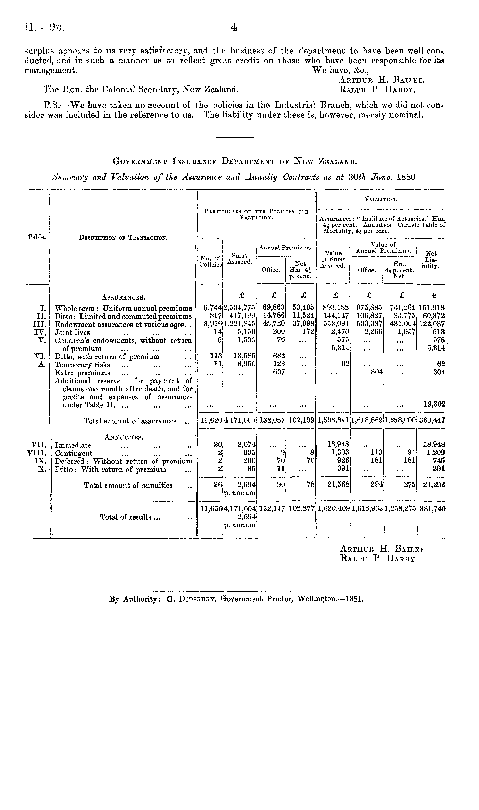 Government Insurance Department of New Zealand. Summary and Valuation of the Assurance and Annuity Contracts as at 30th June, 1880.