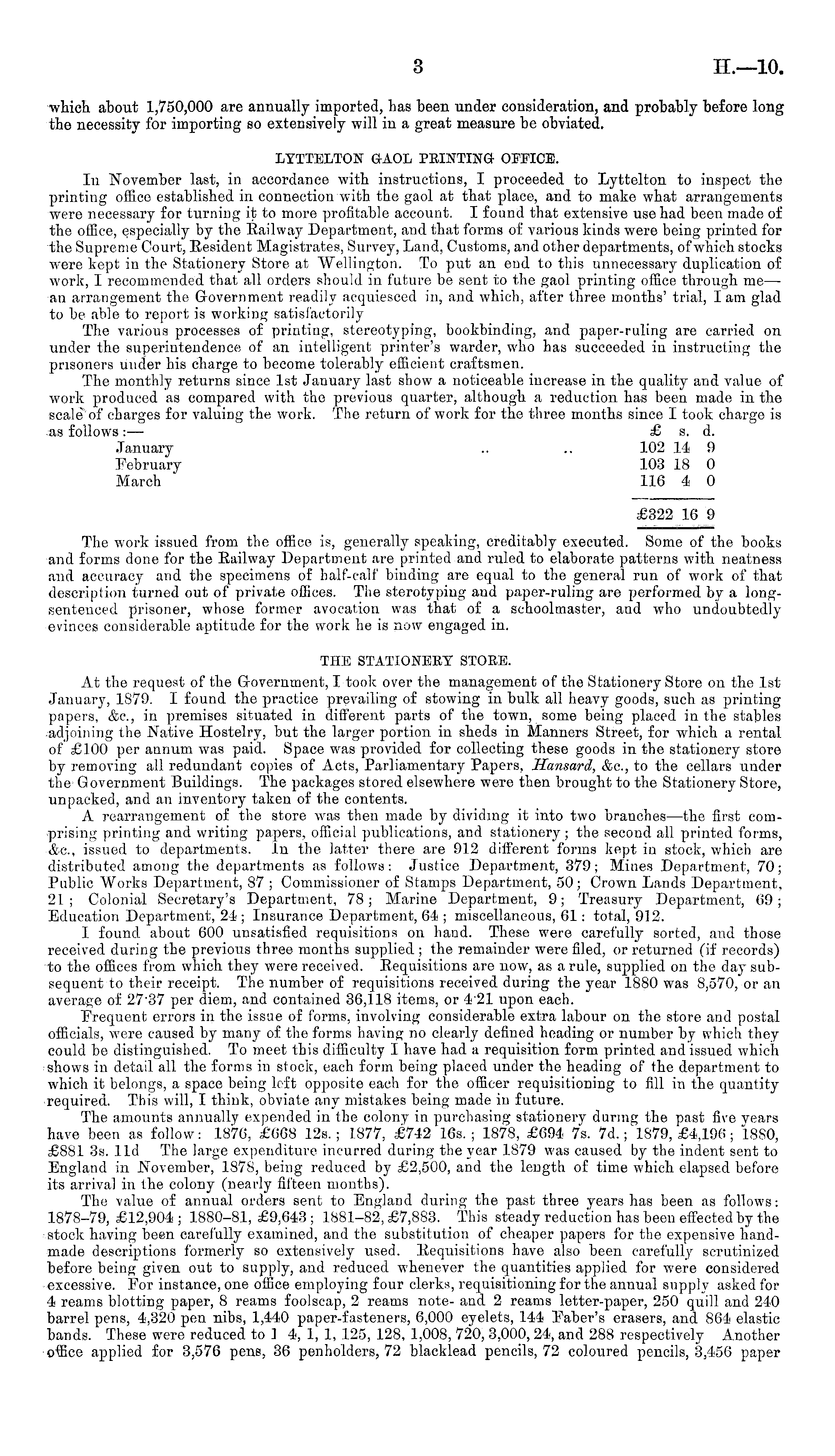 which about 1,750,000 are annually imported, has been under consideration, and probably before long the necessity for importing so extensively will in a great measure be obviated. LYTTELTON GAOL PRINTING OFFICE. In November last, in accordance with instructions, I proceeded to Lyttelton to inspect the printing office established in connection with the gaol at that place, and to make what arrangements were necessary for turning it to more profitable account. I found that extensive use had been made of the office, especially by the Railway Department, and that forms of various kinds were being printed for the Supreme Court, Resident Magistrates, Survey, Land, Customs, and other departments, of which stocks were kept in the Stationery Store at Wellington. To put an end to this unnecessary duplication of work, I recommended that all orders should in future be sent to the gaol printing office through me — an arrangement the Government readily acquiesced in, and which, after three months' trial, I am glad to be able to report is working satisfactorily The various processes of printing, stereotyping, bookbinding, and paper-ruling are carried on under the superintendence of an intelligent printer's warder, who has succeeded in instructing the prisoners under his charge to become tolerably efficient craftsmen. The monthly returns since Ist January last show a noticeable increase in the quality and value of work produced as compared with the previous quarter, although a reduction has been made in the scale of charges for valuing the work. The return of work for the three months since I took charge is as follows :— £ s. d. January .. .. 102 14 9 February 103 18 0 March 116 4 0 £322 16 9 The work issued from the office is, generally speaking, creditably executed. Some of the books and forms done for the Railway Department are printed and ruled to elaborate patterns with neatness and accuracy and the specimens of half-calf binding are equal to the general run of work of that description turned out of private offices. The sterotyping and paper-ruling are performed by a longsentenced prisoner, whose former avocation was that of a schoolmaster, and who undoubtedly evinces considerable aptitude for the work he is now engaged in. THE STATIONERY STORE. At the request of the G-overnmcnt, I took over the management of the Stationery Store on the Ist January, 1879. I found the practice prevailing of stowing in bulk all heavy goods, such as printing papers, &c., in premises situated in different parts of the town, some being placed in the stables adjoining the Native Hostelry, but the larger portion in sheds in Manners Street, for which a rental of £100 per annum was paid. Space was provided for collecting these goods in the stationery store by removing all redundant copies of Acts, Parliamentary Papers, Hansard, &c, to the cellars under the Government Buildings. The packages stored elsewhere were then brought to the Stationery Store, unpacked, and an inventory taken of the contents. A rearrangement of the store was then made by dividing it into two branches —the first comprising printing and writing papers, official publications, and stationery ; the second all printed forms, &c, issued to departments. In the latter there are 912 diiferent forms kept in stock, which are distributed among the departments as follows: Justice Department, 379; Mines Department, 70; Public Works Department, 87 ; Commissioner of Stamps Department, 50; Crown Lands Department, 21; Colonial Secretary's Department, 78; Marine Department, 9; Treasury Department, 69; Education Department, 24 ; Insurance Department, 64 ; miscellaneous, 61: total, 912. I found about 600 unsatisfied requisitions on hand. These were carefully sorted, and those received during the previous three months supplied; the remainder were filed, or returned (if records) to the offices from which they were received. Requisitions are now, as a rule, supplied on the day subsequent to their receipt. The number of requisitions received during the year 1880 was 8,570, or an average of 2737 per diem, and contained 36,118 items, or 421 upon each. Frequent errors in the issue of forms, involving considerable extra labour on the store and postal officials, were caused by many of the forms having no clearly defined heading or number by which they could bo distinguished. To meet this difficulty I have had a requisition form printed and issued which shows in detail all the forms in stock, each form being placed under the heading of the department to which it belongs, a space being left opposite each for the officer requisitioning to fill in the quantity required. This will, I think, obviate any mistakes being made in future. The amounts annually expended in the colony in purchasing stationery during the past five years have been as follow: 1876, £668 125.; 1877, £7-42 16s. ; 1878, £694 7s. 7d.; 1879, £4,196 \ 18S0, £881 3s. lid The large expenditure incurred during the year 1879 was caused by the indent sent to England in November, 1878, being reduced by £2,500, and the length of time which elapsed before its arrival in the colony (nearly fifteen months). The value of annual orders sent to England during the past three years has been as follows: 1878-79, £12,904 ; 1880-81, £9,643 ; 1881-82, £7,883. This steady reduction has been effected by the stock having been carefully examined, and the substitution of cheaper papers for the expensive handmade descriptions formerly so extensively used. Requisitions have also been carefully scrutinized before being given out to supply, and reduced whenever the quantities applied for were considered excessive. For instance, one office employing four clerks, requisitioning for the annual supply asked for 4 reams blotting paper, 8 reams foolscap, 2 reams note- and 2 reams letter-paper, 250 quill and 240 barrel pens, 4,820 pen nibs, 1,440 paper-fasteners, 6,000 eyelets, 144 Eaber's erasers, and. 864 elastic bands. These were reduc