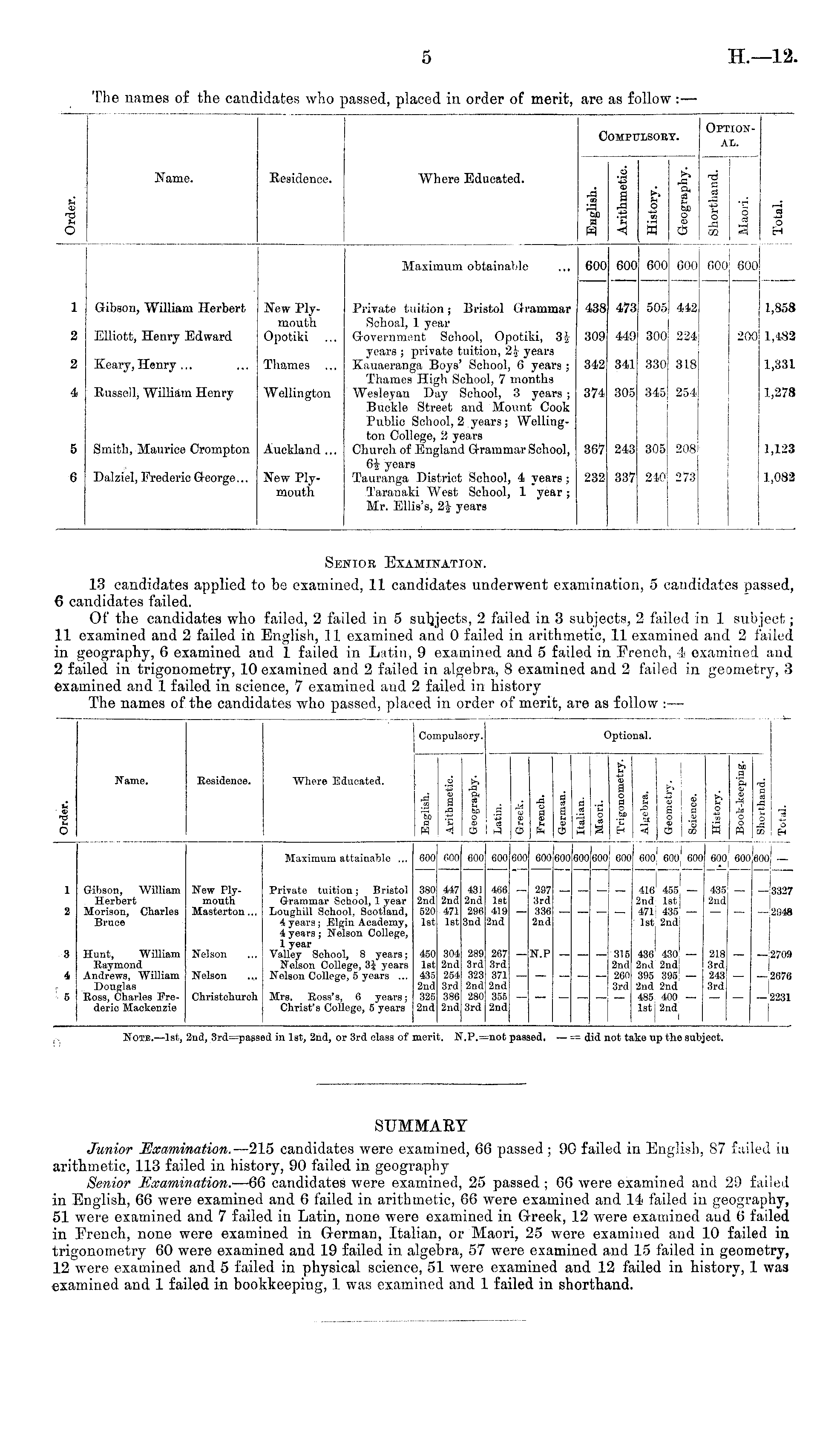 Senior Examination. 13 candidates applied to be examined, 11 candidates underwent examination, 5 candidates passed, 6 candidates failed. Of the candidates who failed, 2 failed in 5 subjects, 2 failed in 3 subjects, 2 failed in 1 subject; 11 examined and 2 failed in English, ] 1 examined and 0 failed in arithmetic, 11 examined and 2 failed in geography, 6 examined and 1 failed in Latin, 9 examined and 5 failed in French, i examined and 2 failed in trigonometry, 10 examined and 2 failed in algebra, 8 examined and 2 failed in geometry, 3 examined and 1 failed in science, 7 examined aud 2 failed in history The names of the candidates who passed, placed in order of merit, are as follow : —