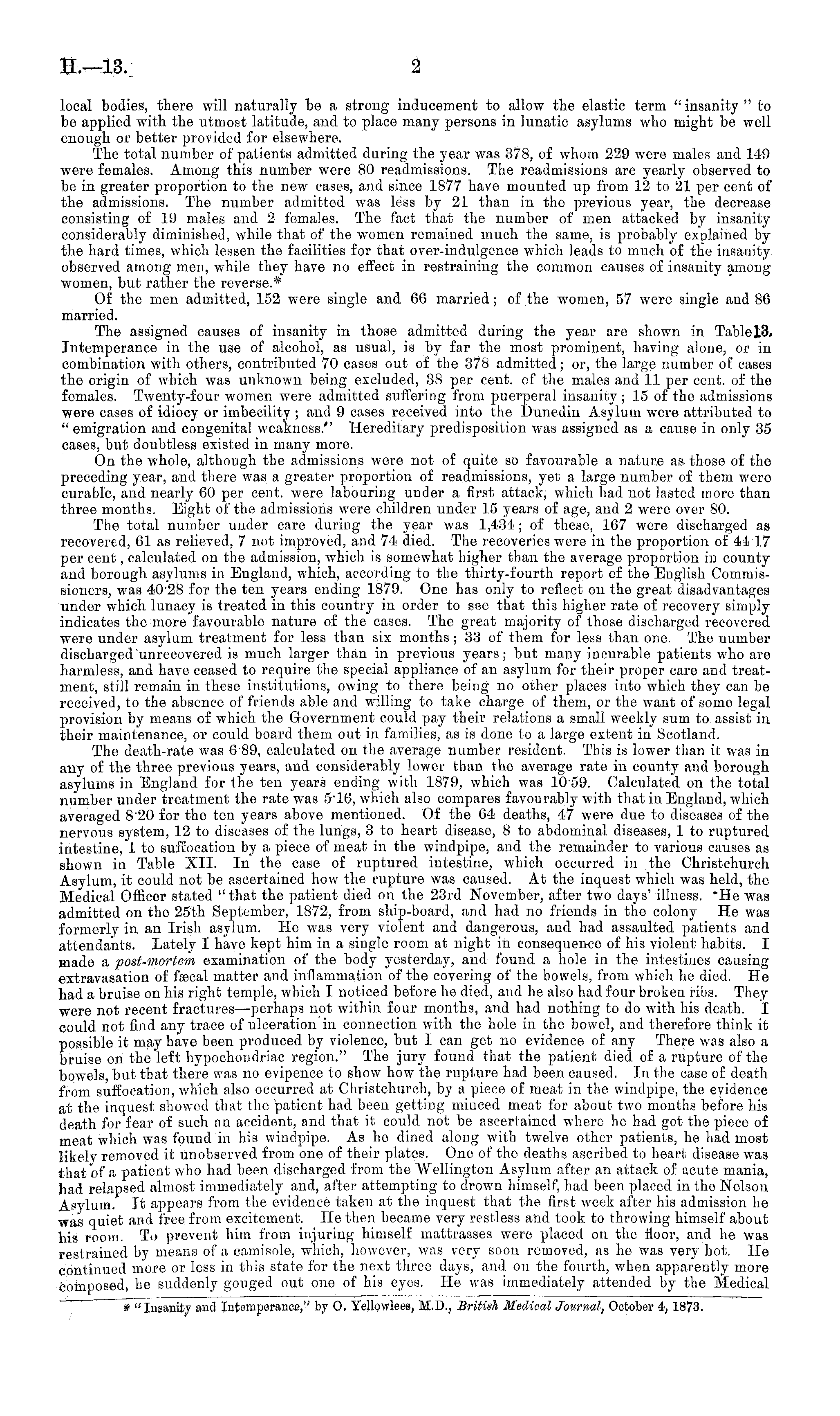 local bodies, there will naturally be a strong inducement to allow the elastic term " insanity " to be applied with the utmost latitude, and to place many persons in lunatic asylums who might be well enough or better provided for elsewhere. The total number of patients admitted during the year was 378, of whom 229 were males and 149 were females. Among this number were 80 readmissions. The readmissions are yearly observed to be in greater proportion to the new cases, and since 1877 have mounted up from 12 to 21 per cent of the admissions. The number admitted was less by 21 than in the previous year, the decrease consisting of 19 males and 2 females. The fact that the number of men attacked by insanity considerably diminished, while that of the women remained much the same, is probably explained by the hard times, which lessen the facilities for that over-indulgence which leads to much of the insanity observed among men, while they have no effect in restraining the common causes of insanity among women, but rather the reverse.* Of the men admitted, 152 were single and 66 married; of the women, 57 were single and 86 married. The assigned causes of insanity in those admitted during the year are shown in TableJ.3. Intemperance in the use of alcohol, as usual, is by far the most prominent, having alone, or in combination with others, contributed 70 cases out of the 378 admitted; or, the large number of cases the origin of which was unknown being excluded, 38 per cent, of the males and 11 per cent, of the females. Twenty-four women were admitted suffering from puerperal insanity; 15 of the admissions were cases of idiocy or imbecility ; and 9 cases received into the Dunedin Asylum were attributed to " emigration and congenital weakness." Hereditary predisposition was assigned as a cause in only 35 cases, but doubtless existed in many more. On the whole, although the admissions were not of quite so favourable a nature as those of the preceding year, and there was a greater proportion of readmissions, yet a large number of them were curable, and nearly 60 per cent, were labouring under a first attack, which had not lasted more than three months. Eight of the admissions were children under 15 years of age, and 2 were over 80. The total number under care during the year was 1,434 ; of these, 167 were discharged as recovered, 61 as relieved, 7 not improved, and 74 died. The recoveries were in the proportion of 4117 percent., calculated on the admission, which is somewhat higher than the average proportion in county and borough asylums in England, which, according to the thirty-fourth report of the English Commissioners, was 4028 for the ten years ending 1879. One has only to reflect on the great disadvantages under which lunacy is treated in this country in order to see that this higher rate of recovery simply indicates the more favourable nature of the cases. The great majority of those discharged recovered were under asylum treatment for less than six months; 33 of them for less than one. The number discharged unrecovered is much larger than in previous years; but many incurable patients who are harmless, and have ceased to require the special appliance of an asylum for their proper care and treatment, still remain in these institutions, owing to there being no other places into which they can be received, to the absence of friends able and willing to take charge of them, or the want of some legal provision by means of which the Government could pay their relations a small weekly sum to assist in their maintenance, or could board them out in families, as is done to a large extent in Scotland. The death-rate was 689, calculated on the average number resident. This is lower than it was in any of the three previous years, and considerably lower than the average rate in county and borough asylums in England for the ten years ending with 1879, which was 1059. Calculated on the total number under treatment the rate was 516, which also compares favourably with that in England, which averaged B'2o for the ten years above mentioned. Of the 0-1 deaths, 47 were due to diseases of the nervous system, 12 to diseases of the lungs, 3 to heart disease, 8 to abdominal diseases, 1 to ruptured intestine, 1 to suffocation by a piece of meat in the windpipe, and the remainder to various causes as shown in Table XII. In the case of ruptured intestine, which occurred in the Christchurch. Asylum, it could not be ascertained how the rupture was caused. At the inquest which was held, the Medical Officer stated " that the patient died on the 23rd November, after two days' illness. "Ho was admitted on the 25th September, 1872, from ship-board, and had no friends in the colony He waa formerly in an Irish asylum. He was very violent and dangerous, and had assaulted patients and attendants. Lately I have kept him in a single room at night in consequence of his violent habits. I made a post-mortem examination of the body yesterday, and found a hole in the intestines causing extravasation of fsecal matter and inflammation of the covering of the bowels, from which he died. He had a bruise on his right temple, which I noticed before he died, and he also had four broken ribs. They were not recent fractures —perhaps not within four months, and had nothing to do with his der.th. I could not find any trace of uleeration in connection with the hole in the bowel, and therefore think it possible it may have been produced by violence, but I can get no evidence of any There was also a bruise on the left hypochondriac region." The jury found that the patient died of a rupture of the bowels but that there was no evipence to show how the rupture had been caused. In the case of death from suffocation, which also occurred at Christchurch, by a piece of meat in the windpipe, the evidence at tho inquest showed that the patient had been getting minced meat for about two months before his death for fear of such an accident, and that it could not 