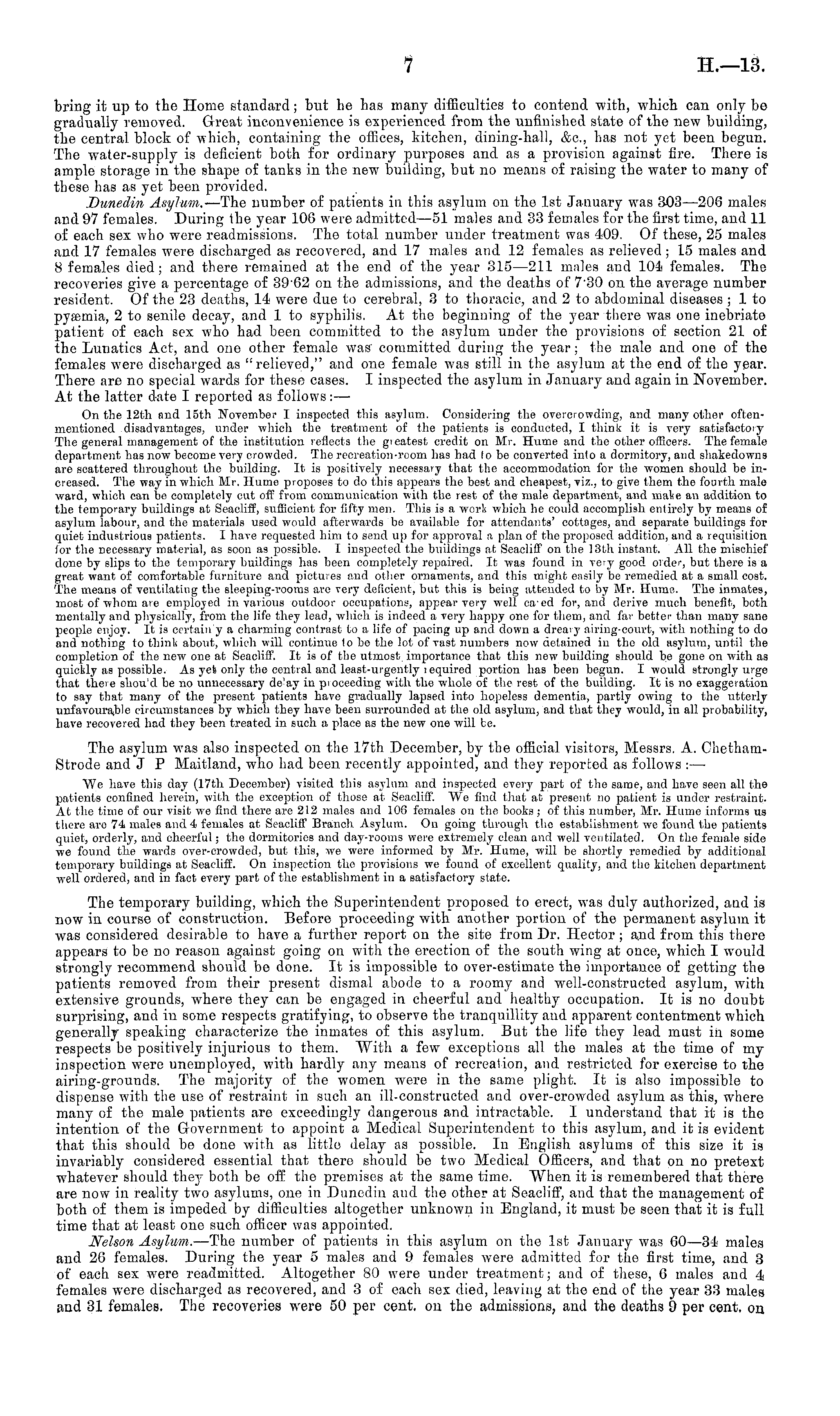 bring it up to the Home standard; but be has many difficulties to contend with, which can only bo gradually removed. Great inconvenience is experienced from the unfinished state of the new building, the central block of which, containing the offices, kitchen, dining-hall, &c, has not yet been begun. The water-supply is deficient both for ordinary purposes and as a provision against fire. There is ample storage in the shape of tanks in the new building, but no means of raising the water to many of these has as yet been provided. Dunedin Asylum. —The number of patients in this asylum on the Ist January was 303 —206 males and 97 females. During the year 10G were admitted —51 males and 83 females for the first time, and 11 of each sex who were readmissions. The total number under treatment was 409. Of these, 25 males and 17 females were discharged as recovered, and 17 males and 12 females as relieved ; 15 males and 8 females died; and there remained at the end of the year 315 —211 males and 104 females. The recoveries give a percentage of 3962 on the admissions, and the deaths of 730 on the average number resident. Of the 23 deaths, 14 were due to cerebral, 3to thoracic, and 2to abdominal diseases ; Ito pyaemia, 2to senile decay, and Ito syphilis. At the beginning of the year there was one inebriate patient of each sex who had been committed to the asylum under the provisions of section 21 of the Lunatics Act, and one other female was committed during the year; the male and one of the females were discharged as "relieved," and one female was still in the asylum at the end of the year. There are no special wards for these cases. I inspected the asylum in January and again in November. At the latter date I reported aa follows:— On the 12th and 15th November I inspected this asylum. Considering the overcrowding, and many other oftenmentioned disadvantages, under which the treatment of the patients is conducted, I think it is very satisfactory Tlie general management of the institution reflects the gicatest credit on Mr. Hume and the other officers. The female department has now become very crowded. The recreation-room has had to be converted into a dormitory, and shakedowns are scattered throughout the building. It is positively necessary that the accommodation for the women should be increased. The way in which Mr. Hume proposes to do this appears the best and cheapest, viz., to give them the fourth male ward, which can be completely cut off from communication with the rest of the male department, and male an addition to the temporary buildings at Seacliff, sufficient for fifty men. This is a work which he could accomplish entirely by means of asylum labour, and the materials used would afterwards bo available for attendants' cottages, and separate buildings for quiet industrious patients. I have requested him to send up for approval a plan of the proposed addition, and a requisition lor the necessary material, as soon as possible. I inspected the buildings at Seacliff on the 13th instant. All the mischief done by slips to the temporary buildings has been completely repaired. It was found in very good older, but there is a great want of comfortable furniture and pictures and other ornaments, and this might easily be remedied at a small cost. The means of ventilating the sleeping-rooms are very deficient, but this is being attended to by Mr. Hume. The inmates, most of "whom ate employed in various outdoor occupations, appear very well ca'ed for, and derive much benefit, both mentally and physically, from the life they lead, which is indeed a very happy one for them, and far better than many sane people enjoy. It is certain y a charming contrast to a life of pacing up and down a dreaiy airing-court, with nothing to do and nothing to think about, which will continue to be the lot of vast numbers now detained in the old asylum, until the completion of the new one at Seacliff. It is of the utmost importance that this new building should be gone on with as quickly as possible. As yet only the central and least-urgently required portion has been begun. I would strongly urge that there shou'd bo no unnecessary de'ay in pioceeding with the whole of the rest of the building. It is no exaggeration to say that many of the present patients have gradually lapsed into hopeless dementia, partly owing to the utterly unfavourable circumstances by which they have been surrounded at the old asylum, and that they would, in all probability, have recovered had they been treated in such a place as the new one will be. The asylum was also inspected on the 17th December, by the official visitors, Messrs. A. ChethamStrode and J P Maitland, who had been recently appointed, and they reported as follows : — We have this day (17th December) visited this asylum and inspected every part of the same, and have seen all the patients confined herein, with the exception of those at Seacliff. We find that at present no patient is under restraint. At the time of our visit we find there are 212 males and 106 females on the books; of this number, Mr. Hume informs us there are 74 males and 4 females at Seacliff Branch Asylum. On going through the establishment we found the patients quiet, orderly, and cheerful; the dormitories and day-rooms were extremely clean and well ventilated. On the female side we found the wards over-crowded, but this, we were informed by Mr. Hume, will be shortly remedied by additional temporary buildings at Seacliff. On inspection the provisions we found of excellent quality, and the kitchen department well ordered, and in fact every part of the establishment in a satisfactory state. The temporary building, which the Superintendent proposed to erect, was duly authorized, and is now in course of construction. Before proceeding with another portion of the permanent asylum it was considered desirable to have a further report on the site from Dr. Hector ; and from this there appears to be no reason aga