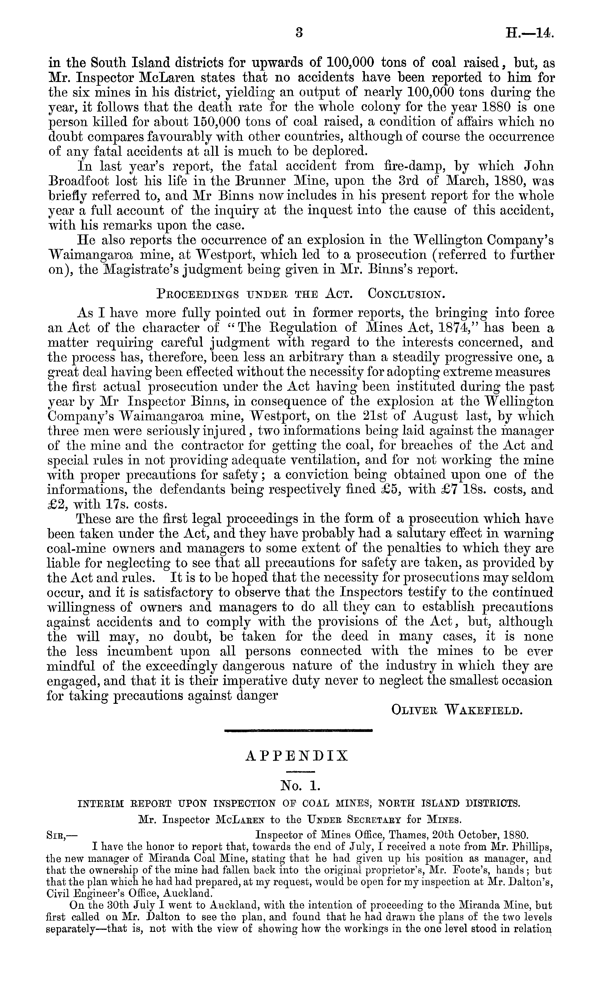 in the South Island districts for upwards of 100,000 tons of coal raised, but, as Mr. Inspector McLaren states that no accidents have been reported to him for the six mines in his district, yielding an output of nearly 100,000 tons during the year, it follows that the death rate for the whole colony for the year 1880 is one person killed for about 150,000 tons of coal raised, a condition of affairs which no doubt compares favourably with other countries, although of course the occurrence of any fatal accidents at all is much to be deplored. In last year's report, the fatal accident from fire-damp, by which John Broadfoot lost his life in the Brunner Mine, upon the 3rd of March, 1880, was briefly referred to, and Mr Binns now includes in his present report for the whole year a full account of the inquiry at the inquest into the cause of this accident, with his remarks upon the case. He also reports the occurrence of an explosion in the Wellington Company's Waimangaroa mine, at Westport, which led to a prosecution (referred to further on), the Magistrate's judgment being given in Mr. Binns's report. Proceedings under, the Act. Conclusion. As I have more fully pointed out in former reports, the bringing into force an Act of the character of "The Regulation of Mines Act, 1874," has been a matter requiring careful judgment with regard to the interests concerned, and the process has, therefore, been less an arbitrary than a steadily progressive one, a great deal having been effected without the necessity for adopting extreme measures the first actual prosecution under the Act having been instituted during the past year by Mr Inspector Binns, in consequence of the explosion at the Wellington Company's Waimangaroa mine, Westport, on the 21st of August last, by which three men were seriously injured, two informations being laid against the manager of the mine and the contractor for getting the coal, for breaches of the Act and special rules in not providing adequate ventilation, and for not working the mine with proper precautions for safety; a conviction being obtained upon one of the informations, the defendants being respectively fined £5, with £7 18s. costs, and £2, with 17s. costs. These are the first legal proceedings in the form of a prosecution which have been taken under the Act, and they have probably had a salutary effect in warning coal-mine owners and managers to some extent of the penalties to which they are liable for neglecting to see that all precautions for safety are taken, as provided by the Act and rules. It is to be hoped that the necessity for prosecutions may seldom occur, and it is satisfactory to observe that the Inspectors testify to the continued willingness of owners and managers to do all they can to establish precautions against accidents and to comply with the provisions of the Act, but, although the will may, no doubt, be taken for the deed in many cases, it is none the less incumbent upon all persons connected with the mines to be ever mindful of the exceedingly dangerous nature of the industry in which they are engaged, and that it is their imperative duty never to neglect the smallest occasion for taking precautions against danger Oliver Wakefield.