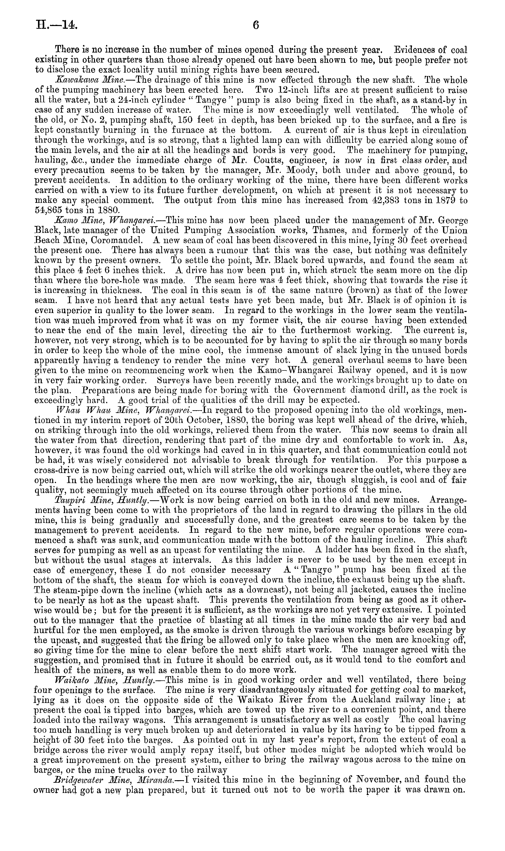 There is no increase in the number of mines opened during the present year. Evidences of coal existing in other quarters than those already opened out have been shown to me, but people prefer not to disclose the exact locality until mining rights have been secured. Kawakawa Mine. —The drainage of this mine is now effected through the new shaft. The whole of the pumping machinery has been erected here. Two 12-inch lifts are at present sufficient to raise all the water, but a 24-inch cylinder " Tangye " pump is also being fixed in the shaft, as a stand-by in case of any sudden increase of water. The mine is now exceedingly well ventilated. The whole of the old, or No. 2, pumping shaft, 150 feet in depth, has been bricked up to the surface, and a fire is kept constantly burning in the furnace at the bottom. A current of air is thus kept in circulation through the workings, and is so strong, that a lighted lamp can with difficulty be carried along some of the main levels, and the air at all the headings and bords is very good. The machinery for pumping, hauling, &c, under the immediate charge of Mr. Coutts, engineer, is now in first class order, and every precaution seems to be taken by the manager, Mr. Moody, both under and above ground, to prevent accidents. In addition to the ordinary working of the mine, there have been different works carried on with a view to its future further development, on which at present it is not necessary to make any special comment. The output from this mine has increased from 42,383 tons in 1879 to 54,865 tons in 1880. Kamo Mine, Whangarei. —This mine has now been placed under the management of Mr. George Black, late manager of the United Pumping Association works, Thames, and formerly of the Union Beach Mine, Coromandel. A new seam of coal has been discovered in this mine, lying 30 feet overhead the present one. There has always been a rumour that this was the case, but nothing was definitely known by the present owners. To settle the point, Mr. Black bored upwards, and found the seam at this place 4 feet 6 inches thick. A drive has now been put in, which struck the seam more on the dip than where the bore-hole was made. The seam here was 4 feet thick, showing that towards the rise it is increasing in thickness. The coal in this seam is of the same nature (brown) as that of the lower seam. I have not heard that any actual tests have yet been made, but Mr. Black is of opinion it is even superior in quality to the lower seam. In regard to the workings in the lower seam the ventilation was much improved from what it was on my former visit, the air course having been extended to near the end of the main level, directing the air to the furthermost working. The current is, however, not very strong, which is to be accounted for by having to split the air through so many bords in order to keep the whole of the mine cool, the immense amount of slack lying in the unused bords apparently having a tendency to render the mine very hot. A general overhaul seems to have been given to the mine on recommencing work when the Kamo-Whangarei Railway opened, and it is now in very fair working order. Surveys have been recently made, and the workings brought up to date on the plan. Preparations are being made for boring with the Government diamond drill, as the rock is exceedingly hard. A good trial of the qualities of the drill may be expected. Whau Whau Mine, Whangarei. —ln regard to the proposed opening into the old workings, mentioned in my interim report of 20th October, 1880, the boring was kept well ahead of the drive, which, on striking through into the old workings, relieved them from the water. This now seems to drain all the water from that direction, rendering that part of the mine dry and comfortable to work in. As, however, it was found the old workings had caved in in this quarter, and that communication could not be had, it was wisely considered not advisable to break through for ventilation. For this purpose a cross-drive is now being carried out, which will strike the old workings nearer the outlet, where they are open. In the headings where the men are now working, the air, though sluggish, is cool and of fair quality, not seemingly much affected on its course through other portions of the mine. Taupiri Mine, Suntly. —Work is now being carried on both in the old and new mines. Arrangements having been come to with the proprietors of the land in regard to drawing the pillars in the old mine, this is being gradually and successfully done, and the greatest care seems to be taken by the management to prevent accidents. In regard to the new mine, before regular operations were commenced a shaft was sunk, and communication made with the bottom of the hauling incline. This shaft serves for pumping as well as an upcast for ventilating the mine. A ladder has been fixed in the shaft, but without the usual stages at intervals. As this ladder is never to be used by the men except in case of emergency, these I do not consider necessary A " Tangye " pump has been fixed at the bottom of the shaft, the steam for which is conveyed down the incline, the exhaust being up the shaft. The steam-pipe down the incline (which acts as a downcast), not being all jacketed, causes the incline to be nearly as hot as the upcast shaft. This prevents the ventilation from being as good as it otherwise would be; but for the present it is sufficient, as the workings are not yet very extensive. I pointed out to the manager that the practice of blasting at all times in the mine made the air very bad and hurtful for the men employed, as the smoke is driven through the various workings before escaping by the upcast, and suggested that the firing be allowed only to take place when the men are knocking off, so giving time for the mine to clear before the next shift start work. The manager agreed with the suggestion, and promised that in future it should be carried out, as it would tend to the co