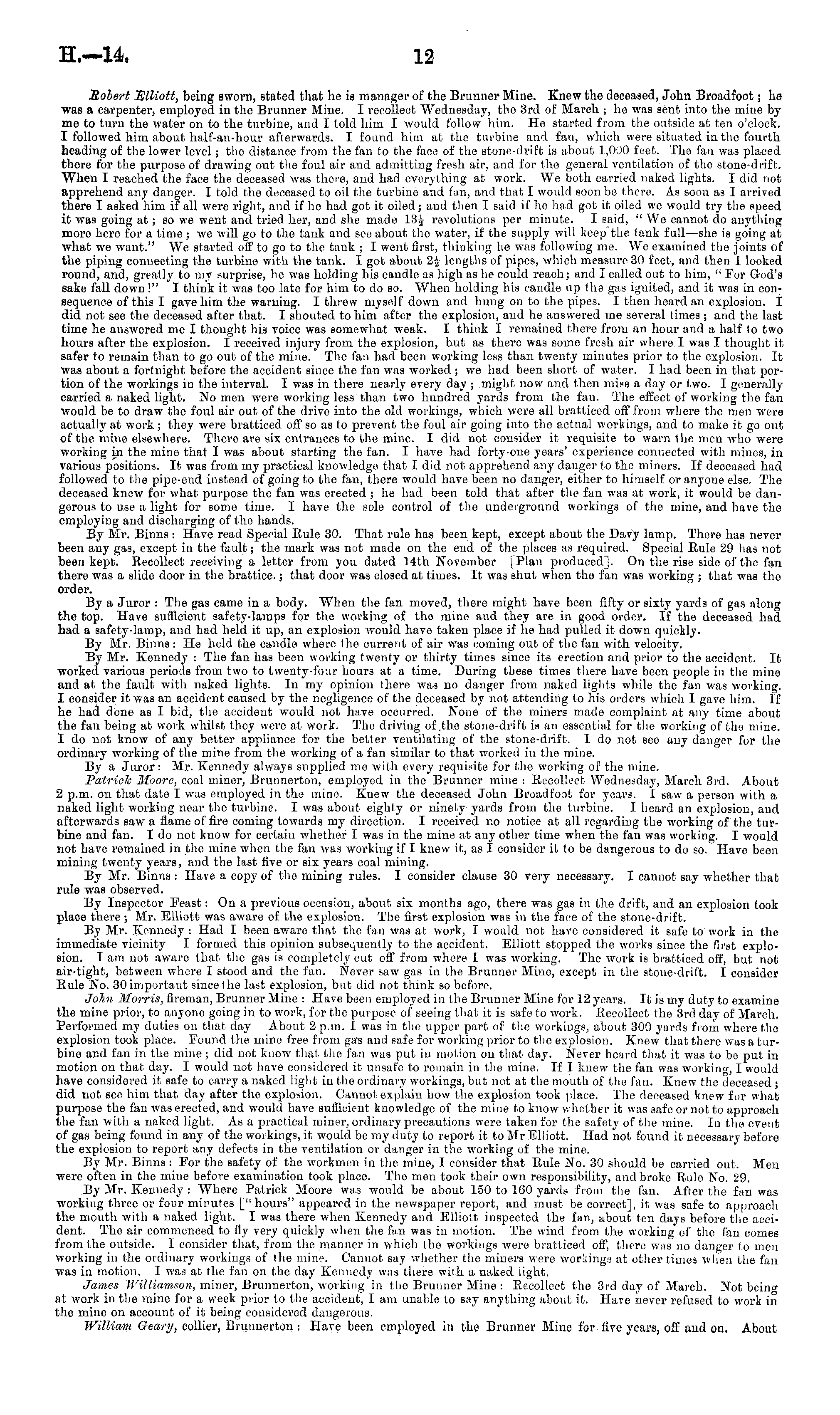 Bobert Elliott, being sworn, stated that he is manager of the Brainier Mine. Knew the deceased, John Broadfoot; he was a carpenter, employed in the Brunner Mine. I recollect Wednesday, the 3rd of March ;he was sent into the mine by me to turn the water on to the turbine, and I told him I would follow him. He started from the outside at ten o'clock. I followed him about half-an-hour afterwards. I found him at the turbine and fan, which were situated in the fourth heading of the lower level; the distance from the fan to the facs of the stone-drift is about 1,000 feet. The fan was placed there for the piirpose of drawing out the foul air and admitting fresh air, and for the general ventilation of the stone-drift. When I reached the face the deceased was there, and had everything at work. We both carried naked lights. I did not apprehend any danger. I told the deceased to oil the turbine and fan, and that I woidd soon be there. As soon as I arrived there I asked him if all were right, and if he had got it oiled; and then I said if he had got it oiled we would try the speed it was going at; so we went and tried her, and she made 13^ revolutions per minute. I said, "We cannot do anything more here for a lime ; wo will go to the tank and see about the water, if the supply will keep the tank full—she is going at what we want." We started off to go to the tank ; I went first, thinking he was following me. We examined the joints of the piping connecting the turbine with the tank. I got about 2| lengths of pipes, which measure 30 feet, and then I looked round, and, greatly to my surprise, he was holding his candle as high as he could reach; and I called out to him, " For Grod's sake fall down I" I think it was too late for him to do so. When holding his caudle up the gas ignited, and it was in consequence of this 1 gave him the warning. I threw myself down and hung on to the pipes. I then heard an explosion. I did not see the deceased after that. I shouted to him after the explosion, and he answered me several limes ; and the last time he answered me I thought his voice was somewhat weak. I think I remained there from an hour and a half lo two hours after the explosion. I received injury from the explosion, but as there was some fresh air where I was I thought it safer to remain than to go out of the mine. The fan had been working less than twenty minutes prior to the explosion. It was about a fortnight before the accident since the fan was worked ; we had been short of water. I had been in that portion of the workings in the interval. I was in there nearly every day; might now and then miss a day or two. I generally carried a naked light. No men were working less than two hundred yards from the fan. The effect of working the fan would be to draw the foul air out of the drive into the old workings, which were all bratticed off from where the men were actually at work; they were bratticed off so as to prevent the foul air going into the actual workings, and to make it go out of the mine elsewhere. There are six entrances to the mine. I did not consider it requisite to warn the men who were working in the mine that I was about starting the fan. I have had forty-one years' experience connected with mines, in various positions. It was from my practical knowledge that I did not apprehend any danger to the miners. If deceased had followed to the pipe-end instead of going to the fan, there would have been no danger, either to himself or anyone else. The deceased knew for what purpose the fan was erected ; he had been told that after the fan was at work, it would be dangerous to use a light for some time. I have the sole control of the underground workings of the mine, and have the employing and discharging of the hands. By Mr. Binns: Have read Special Rule 30. That rule has been kept, except about the Davy lamp. There has never been any gas, except in the fault; the mark was not made on the end of the places as required. Special Rule 29 has not been kept. Recollect receiving a letter from you dated Htli November [Plan produced]. On the rise side of the fan there was a slide door in the brattice.; that door was closed at times. It was shut when the fan was working ; that was the order. By a Juror : The gas came in a body. When the fan moved, there might have been fifty or sixty yards of gas along the top. Have sufficient safety-lamps for the working of the mine and they are in good order. If the deceased had had a safety-lamp, and had held it up, an explosion would have tuken place if he had pulled it down quickly. By Mr. Binns : He held the candle where (ho current of air was coming out of the fan with velocity. By Mr. Kennedy : The fan has been working twenty or thirty times since its erection and prior to the accident. It worked various periods from two to twenty-four hours at a time. During these times there have been people in the mine and at the fault with naked lights. In my opinion there was no danger from naked lights while the fan was working. I consider it was an accident caused by the negligence of the deceased by not attending lo his orders which I gave him. If he had done as I bid, the accident would not have occurred. None of the miners made complaint at any time about the fan being at work whilst they were at work. The driving of .the stone-drift is an essential for the working of the mine. 1 do not know of any belter appliance for the better ventilating of the stone-drift. I do not see any danger for the ordinary working of the mine from the working of a fan similar to that worked in the mine. By a Juror: Mr. Kennedy always supplied me with every requisite for the working of the mine. Patrick Moore, coal miner, Brunnerton, employed in the Brunner mine : Recollect Wednesday, March 3rd. About 2 p.m. on that date I was employed in the mine. Knew the deceased John Broadfoot for years. I saw a person with a naked light working near the turbine. I was about eighty or ninety yards from the turb