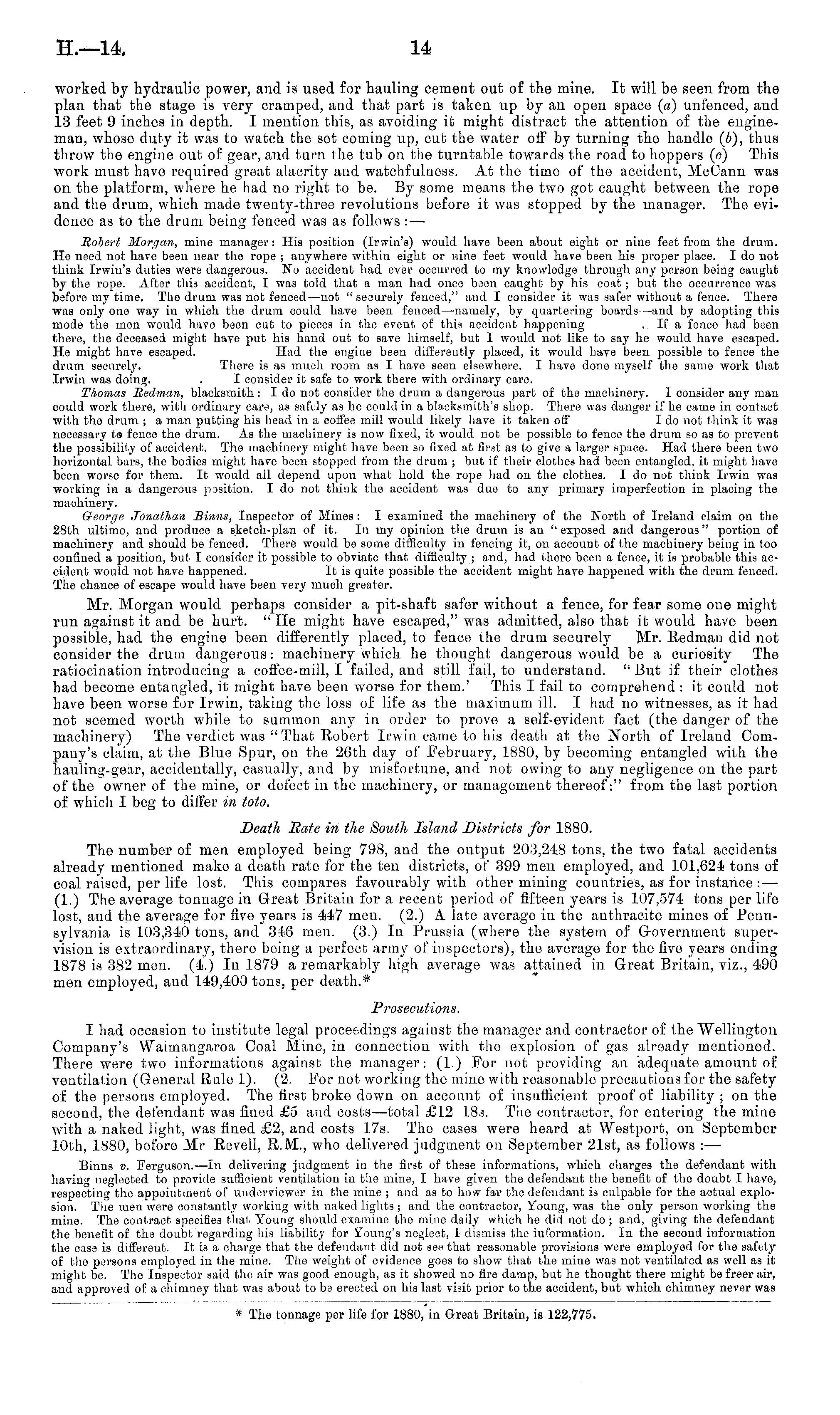 worked by hydraulic power, and is used for hauling cement out of the mine. It will be seen from the plan that the stage is very cramped, and that part is taken up by an open space (a) unfenced, and 13 feet 9 inches in depth. I mention this, as avoiding it might distract the attention of the engineman, whose duty it was to watch the set coming up, cut the water off by turning the handle (J), thus throw the engine out of gear, and turn the tub on the turntable towards the road to hoppers (c) This work must have required great alacrity and watchfulness. At the time of the accident, McCann was on the platform, where he had no right to be. By some means the two got caught between the rope and the drum, which made twenty-three revolutions before it was stopped by the manager. The evidence as to the drum being fenced was as follows : —■ Robert Morgan, mine manager: His position (Irwin's) would have been abovit eight or nine feat from the drum. He need not have been near the rope ; anywhere within eight or nine feet would have been his proper place. Ido not think Irwin's duties were dangerous. No accident had ever occurred to my knowledge through any person being caught by the rope. After this accident, I was told that a man had once been caught by his coat; but the occurrence was before my time. The drum was not fenced —not "securely fenced," and I consider it was safer without a fence. There was only one way in which the dram could have been fenced —namely, by quartering boards —and by adopting this mode the men would have been cut to pieces in the event of this accident happening . If a fence had been there, the deceased might have put his hand out to save himself, but I would not like to say he would have escaped. He might have escaped. Had the engine been differently placed, it would have been possible to fence the drum securely. There is as much room as I have seen elsewhere. I have done myself the same work that Irwin was doing. . I consider it safe to work there with ordinary care. Thomas Redman, blacksmith :I do not consider the drum a dangerous part of the machinery. I consider any man could work there, with ordinary care, as safely as he could in a blacksmith's shop. There was danger if he came in contact with the drum ; a man putting his head in a coffee mill would likely have it taken off Ido not think it was necessary t® fence the drum. As the machinery is now fixed, it would not be possible to fence the drum so as to prevent the possibility of accident. The machinery might have been so fixed at first as to give a larger space. Had there been two horizontal bars, the bodies might have been stopped from the drum ; but if their clothes had been entangled, it might have been worse for them. It would all depend upon what hold the rope had on the clothes. I do not think Irwin was working in a dangerous position. I do not think the accident was due to any primary imperfection in placing the machinery. George Jonathan JBinns, Inspector of Mines: I examined the machinery of the North of Ireland claim on the 28th ultimo, and produce a sketch-plan of it. In my opinion the drum is an " exposed and dangerous" portion of machinery and should be fenced. There would be some difficulty in fencing it, on account of the machinery being in too confined a position, but I consider it possible to obviate that difficulty ; and, had there been a fence, it is probable this accident would not have happened. It is quite possible the accident might have happened with the drum fenced. The chance of escape would have been very much greater. Mr. Morgan would perhaps consider a pit-shaft safer without a fence, for fear some one might run against it and be hurt. "He might have escaped," was admitted, also that it would have been possible, had the engine been differently placed, to fence the dram securely Mr. Redman did not consider the drum dangerous: machinery which he thought dangerous would be a curiosity The ratiocination introducing a coffee-mill, I failed, and still fail, to understand. " But if their clothes had become entangled, it might have been worse for them.' This I fail to comprehend :it could not have been worse for Irwin, taking the loss of life as the maximum ill. I had no witnesses, as it had not seemed worth while to summon any in order to prove a self-evident fact (the danger of the machinery) The verdict was "That Robert Irwin came to his death at the North of Ireland Company's claim, at the Blue Spur, on the 26th day of February, 1880, by becoming entangled with the hauling-gear, accidentally, casually, and by misfortune, and not owing to any negligence on the part of the ow rner of the mine, or defect in the machinery, or management thereof:" from the last portion of which I beg to differ in toto. Death Sate in the South Island Districts for 1880. The number of men employed being 798, and the output 203,248 tons, the two fatal accidents already mentioned make a death rate for the ten districts, of 399 men employed, and 101,624 tons of coal raised, per life lost. This compares favourably with other mining countries, as for instance : —• (1.) The average tonnage in Great Britain for a recent period of fifteen years is 107,574 tons per life lost, and the average for five years is 447 men. (2.) A. late average in the anthracite mines of Pennsylvania is 103,340 tons, and 346 men. (3.) In Prussia (where the system of Grovernrnent supervision is extraordinary, there being a perfect army of inspectors), the average for the five years ending 1878 is 382 men. (4.) In 1879 a remarkably high average was attained in Great Britain, viz., 490 men employed, and 149,400 tons, per death.* Prosecutions. I had occasion to institute legal proceedings against the manager and contractor of the Wellington Company's Waimangaroa Coal Mine, in connection with the explosion of gas already mentioned. There were two informations against the manager: (1.) For not providing an adequate amount of ventilation 