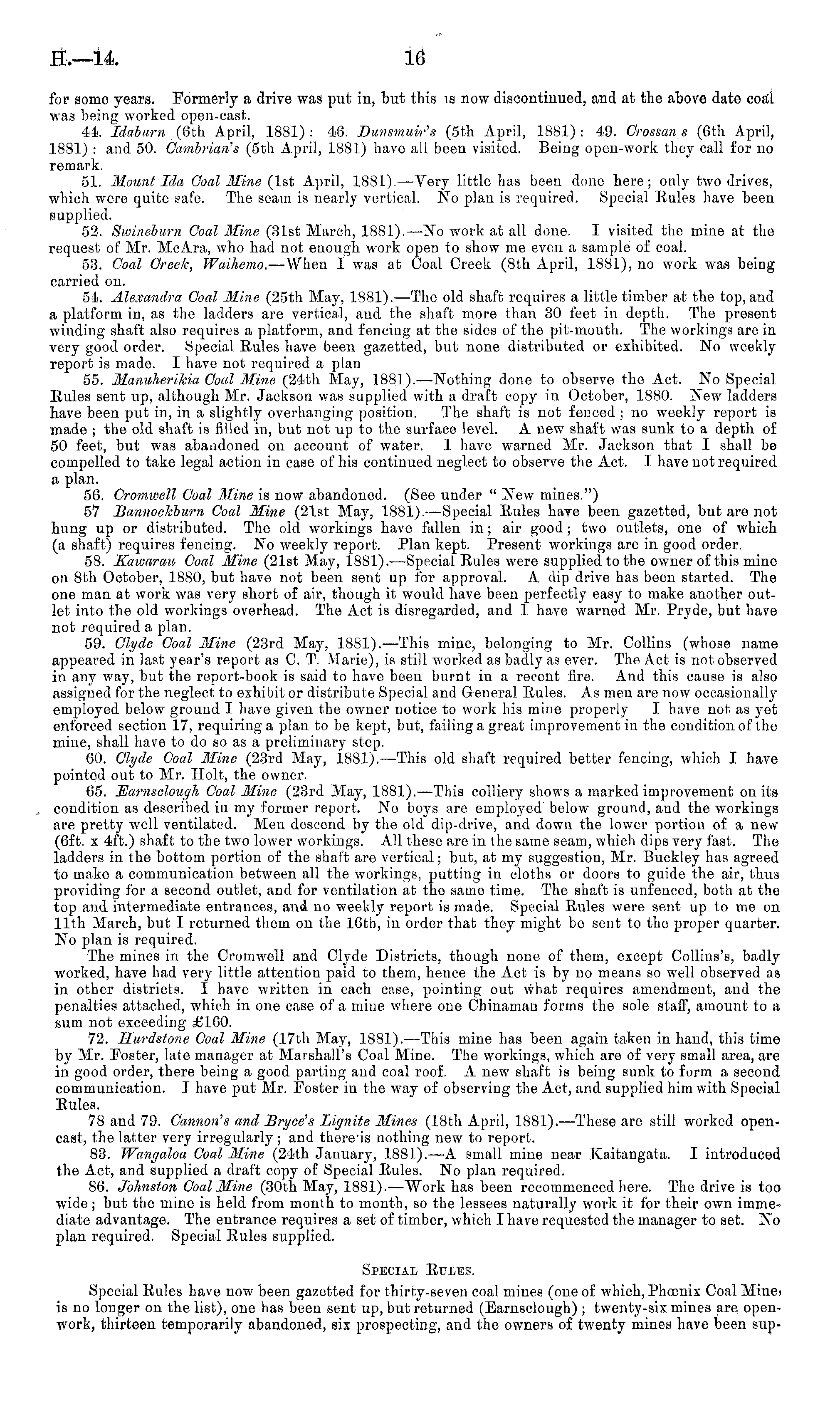 for some years. Formerly a drive was put in, but this is now discontinued, and at the above date coal was being worked open-cast. 44. Idaburn (6th April, 1881) : 46. Dunsmuir's (sth April, 1881) : 49. Crosum s (6th April, 1881) : and 50. Cambrian's (sth April, 1881) have all been visited. Being open-work they call for no remark. 51. Mount Ida Coal Mine (Ist April, 1881). —Very little has been done here; only two drives, which were quite safe. The seam is nearly vertical. No plan is required. Special Rules have been supplied. 52. Swineburn Coal Mine (3Lst March, 1881). —No work at all done. I visited the mine at the request of Mr. McAra, who had not enough work open to show me even a sample of coal. 53. Coal Creek, Waihemo. —When I was at Goal Creek (Bth April, 1881), no work was being carried on. 54. Alexandra Coal Mine (25th May, 1881). —The old shaft requires a little timber at the top, and a platform in, as the ladders are vertical, and the shaft more than 30 feet in depth. The present winding shaft also requires a platform, and fencing at the sides of the pit-mouth. The workings are in very good order. Special Rules have been gazetted, but none distributed or exhibited. No weekly report is made. I have not required a plan 55. ManuheriJcia Coal Mine (24th May, 1881).- —Nothing done to observe the Act. No Special Rules sent up, although Mr. Jackson was supplied with a draft copy in October, 1880. New ladders have been put in, in a slightly overhanging position. The shaft is not fenced ;no weekly report is made ; the old shaft is filled in, but not up to the surface level. A new shaft was sunk to a depth of 50 feet, but was abandoned on account of water. 1 have warned Mr. Jackson that I shall be compelled to take legal action in case of his continued neglect to observe the Act. I have not required a plan. 56. Cromwell Coal Mine is now abandoned. (See under " New mines.") 57 Bannockburn Coal Mine (21st May, 1881).' —Special Rules have been gazetted, but are not hung up or distributed. The old workings have fallen in; air good ; two outlets, one of which (a shaft) requires fencing. No weekly report. Plan kept. Present workings are in good order. 58. Kawarau Coal Mine (21st Majr, 1881).' —Special Rules were supplied to the owner of this mine on Bth October, 1880, but have not been sent up for approval. A dip drive has been started. The one man at work was very short of air, though it would have been perfectly easy to make another outlet into the old workings overhead. The Act is disregarded, and I have warned Mr. Prydc, but have not required a plan. 59. Clyde Coal Mine (23rd May, 1881). —This mine, belonging to Mr. Collins (whose name appeared in last year's report as C. T. Marie), is still worked as badly as ever. The Act is not observed in any way, but the report-book is said to have been burnt in a recent fire. And this cause is also assigned for the neglect to exhibit or distribute Special and General Rules. As men are now occasionally employed below ground I have given the owner notice to work his mine properly I have not as yet enforced section 17, requiring a plan to be kept, but, failing a great improvement in the condition of the mine, shall have to do so as a preliminary step. 60. Clyde Coal Mine (23rd May, 1881).—This old shaft required better fencing, which I have pointed out to Mr. Holt, the owner. 65. Earnsclongli Coal Mine (23rd May, 1881). —This colliery shows a marked improvement on its condition as described iv my former report. No boys are employed below ground, and the workings are pretty well ventilated. Men descend by the old dip-drive, and down the lower portion of a new (6ft. x 4ft.) shaft to the two lower workings. All these are in the same seam, which dips very fast. The ladders in the bottom portion of the shaft are vertical; but, at my suggestion, Mr. Buckley has agreed to make a communication between all the workings, putting in cloths or doors to guide the air, thus providing for a second outlet, and for ventilation at the same time. The shaft is unfenced, both at the top and intermediate entrances, and no weekly report is made. Special Rules were sent up to me on 11th March, but I returned them on the 16th, in order that they might be sent to the proper quarter. No plan is required. The mines in the Cromwell and Clyde Districts, though none of them, except Collins's, badly worked, have had very little attention paid to them, hence the Act is by no means so well observed as in other districts. I have written in each case, pointing out what requires amendment, and the penalties attached, which in one case of a mine where one Chinaman forms the sole staff, amount to a sum not exceeding £160. 72. Hurdstone Goal Mine (17th May, 1881). —This mine has been again taken in hand, this time by Mr. Poster, late manager at Marshall's Coal Mine. The workings, which are of very small area, are in good order, there being a good parting and coal roof. A new shaft is being sunk to form a second communication. I have put Mr. Poster in the way of observing the Act, and supplied him with Special Eules. 78 and 79. Cannon's and Bryce's Lignite Mines (18th April, 1881). —These are still worked opencast, the latter very irregularly; and there'is nothing new to report. 83. Wanr/aloa Coal Mine (24th January, 188 L). —A small mine near Kaitangata. I introduced the Act, and supplied a draft copy of Special Rules. No plan required. 86. Johnston Coal Mine (30th May, 1881). —Work has been recommenced here. The drive is too wide; but the mine is held from month to month, so the lessees naturally work it for their own immediate advantage. The entrance requires a set of timber, which I have requested the manager to set. No plan required. Special Rules supplied. Special RtrjVES. Special Rules have now been gazetted for thirty-seven coal mines (one of which, Phcenix Coal Mine; is no longer ou the list), one has been sent up, but returned (Barnsclough) ; twenty-six mi