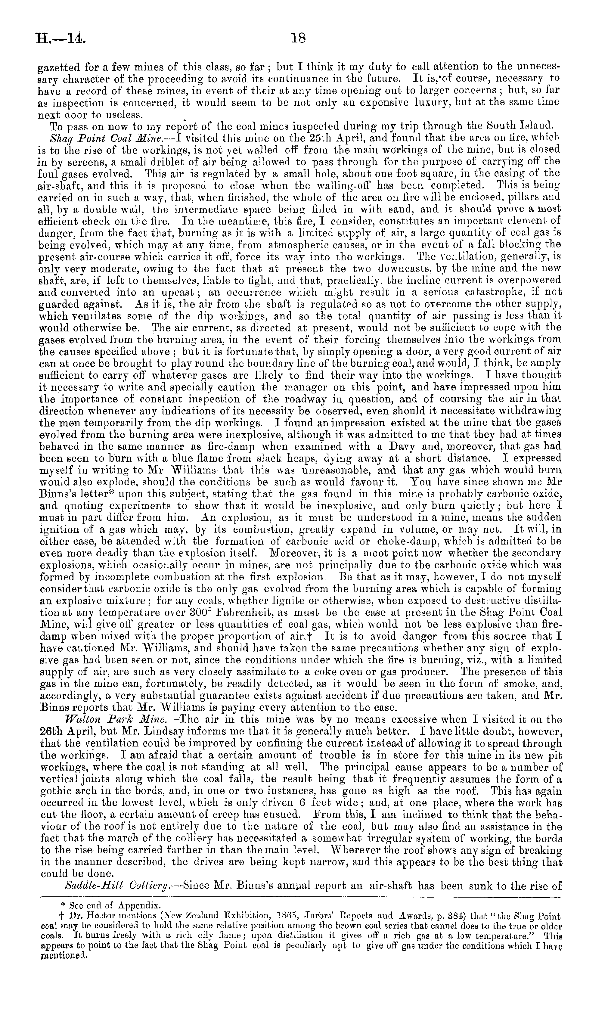 * See end of Appendix. f Dr. Heutor mentions (New Zealand Exhibition, 1863, Jurors' Reports aud Awards, p. 38i) that " the Shag Point ecal may be considered to hold the same relative position among the brown coal series that oannel does to the true or older coals. Xt burns freely with a rich oily flame; upon distillation it gives off a rich gas at a low temperature." This appears to point to the fact that the Shag Point coal is peculiarly apt to give off gas under the conditions which I have jnentioned.
