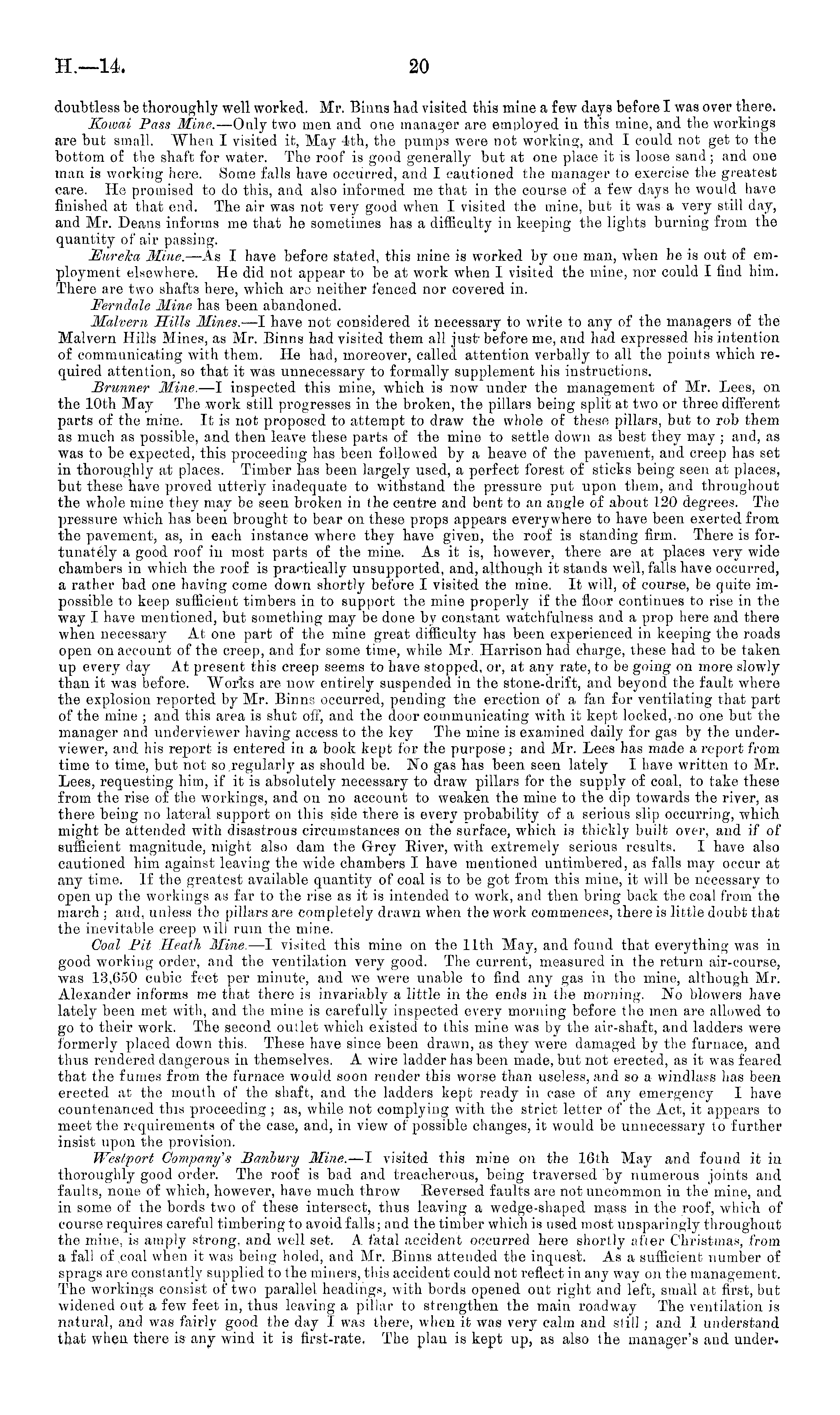 doubtless be thoroughly well worked. Mr. Binns had visited this mine a few days before I was over there. Kowai Pass Minn. —Only two men and one manager are employed in this mine, and the workings are but small. When I visited it, May 4th, the pumps were not working, and I could not get to the bottom of the shaft for water. The roof is good generally but at one place it is loose sand ; and one man is working here. Some falls have occurred, and I cautioned the manager to exercise the greatest care. lie promised to do this, and also informed me that in the course of a few days ho would have finished at that end. The air was not very good when I visited the mine, but it was a very still day, and Mr. Deans informs me that he sometimes has a difficulty in keeping the lights burning from the quantity of air passing. JSurelca Mine. —As I have before stated, this mine is worked by one man, when he is out of employment elsewhere. He did not appear to be at work when I visited the mine, nor could I find him. There are two shafts here, which arc neither fenced nor covered in. Ferndale Mine has been abandoned. Malvorn Sills Mines. —I have not considered it necessary to write to any of the managers of the Malvern Hills Mines, as Mr. Binns had visited them all just before me, and had expressed his intention of communicating with them. He had, moreover, called attention verbally to all the points which required attention, so that it was unnecessary to formally supplement his instructions. Brunner Mine. —l inspected this mine, which is now under the management of Mr. Lees, on the 10th May The work still progresses in the broken, the pillars being split at two or three different parts of the mine. It is not proposed to attempt to draw the whole of these pillars, but to rob them as much as possible, and then leave these parts of the mine to settle down as best they may ; and, as was to be expected, this proceeding has been followed by a heave of the pavement, and creep has set in thoroughly at places. Timber has been largely used, a perfect forest of sticks being seen at places, but these have proved utterly inadequate to withstand the pressure put upon them, and throughout the whole mine they may be seen broken in the centre and bent to an angle of about 120 degrees. The pressure which has been brought to bear on these props appears everywhere to have been exerted from the pavement, as, in each instance where they have given, the roof is standing firm. There is fortunately a good roof in most parts of the mine. As it is, however, there are at places very wide chambers in which the roof is practically unsupported, and, although it stands well, falls have occurred, a rather bad one having come down shortly before I visited the mine. It will, of course, be quite impossible to keep sufficient timbers in to support the mine properly if the floor continues to rise in the way I have mentioned, but something may be done by constant watchfulness and a prop here and there when necessary At one part of the mine great difficulty has been experienced in keeping the roads open on account of the creep, and for some time, while Mr. Harrison had charge, these had to be taken up every day At present this creep seems to have stopped, or, at any rate, to be going on more slowly than it was before. Works are now entirely suspended in the stone-drift, and beyond the fault where the explosion reported by Mr. Binns occurred, pending the erection of a fan for ventilating that part of the mine ; and this area is shut off, and the door communicating with it kept locked, no one but the manager and underviewer having access to the key The mine is examined daily for gas by the underviewer, and his report is entered in a book kept for the purpose; and Mr. Lees has made a report from time to time, but not so regular!}' as should be. No gas has been seen lately I have written to Mr. Lees, requesting him, if it is absolutely necessary to draw pillars for the supply of coal, to take these from the rise of the workings, and on no account to weaken the mine to the dip towards the river, as there being no lateral support on this side there is every probability of a serious slip occurring, which might be attended with disastrous circumstances ou the surface, which is thickly built over, and if of sufficient magnitude, might also dam the Grey Eiver, with extremely serious results. I have also cautioned him against leaving the wide chambers I have mentioned untimbered, as falls may occur at any time. If the greatest available quantity of coal is to be got from this mine, it will be necessary to open up the workings as far to the rise as it is intended to work, and then bring back the coal from the march ; and, unless the pillars are completely drawn when the work commences, there is little doubt that the inevitable creep v\ ill rum the mine. Coal Pit Heath Mine. —I visited this mine on the 11th May, and found that everything was in good working order, and the ventilation very good. The current, measured in the return air-course, was 13,650 cubic feet per minute, and we were unable to find any gas in the mine, although Mr. Alexander informs me that there is invariably a little in the ends in the morning. No blowers have lately been met with, and the mine is carefully inspected every morning before the men are allowed to go to their work. The second oullet which existed to this mine was by the air-shaft, and ladders were formerly placed down this. These have since been drawn, as they were damaged by the furnace, and thus rendered dangerous in themselves. A wire ladder has been made, but not erected, as it was feared that the fumes from the furnace would soon render this worse than useless, and so a windlass has been erected at the mouth of the shaft, and the ladders kept ready in case of any emergency I have countenanced this proceeding ; as, while not complying with the strict letter of the Act, it appears to meet the requirements of th