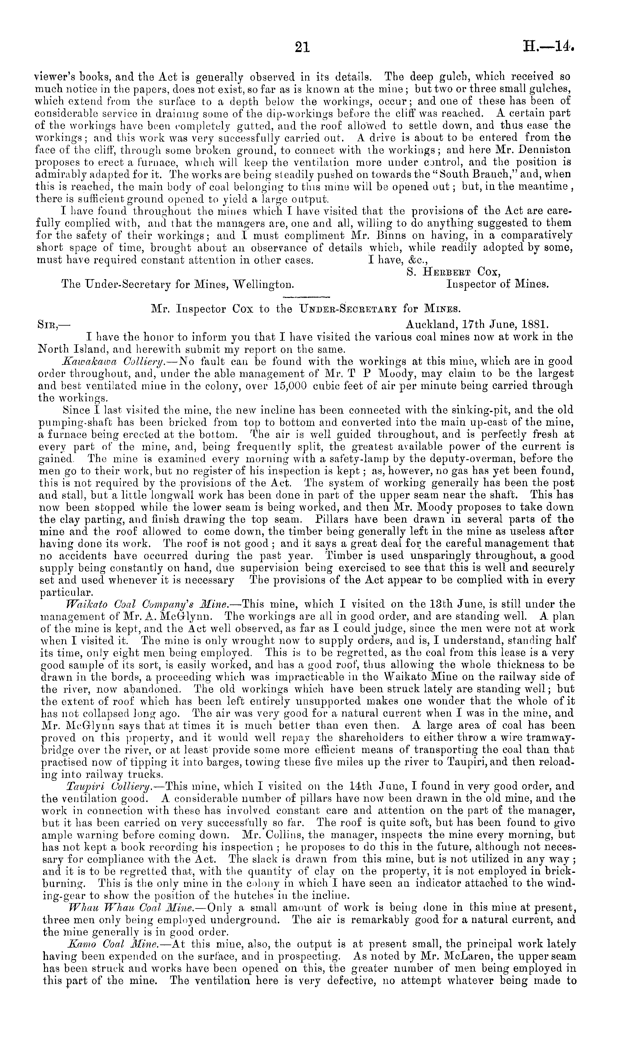 viewer's books, and the Act is generally observed in its details. The deep gulch, which received so much notice in the papers, does not exist, so far as is known at the mine; but two or three small gulches, which extend from the surface to a depth below the workings, occur; and one of these has been of considerable service in draining some of the dip-workings before the cliff was reached. A certain part of the workings have been completely gutted, and the roof allowed to settle down, and thus ease the workings; and this work was very successfully carried out. A drive is about to be entered from the face of the cliff, through some broken ground, to connect with the workings; and here Mr. Denniston proposes to erect a furnace, which will keep the ventilation more under cjntrol, and the position is admirably adapted for it. The works are being steadily pushed on towards the "South Branch," and, when this is reached, the main bocty of coal belonging to this mine will be opened out; but, in the meantime , there is sufficient ground opened to yield a large output. I have found throughout the mines which I have visited that the provisions of the Act are carefully complied with, and that the managers are, one and all, willing to do anything suggested to them for the safety of their workings; and I must compliment Mr. Binns on having, in a comparatively short space of time, brought about an observance of details which, while readily adopted by some, must have required constant attention in other cases. I have, &c, S. Heebeet Cox, The Under-Secretary for Mines, Wellington. Inspector of Mines.