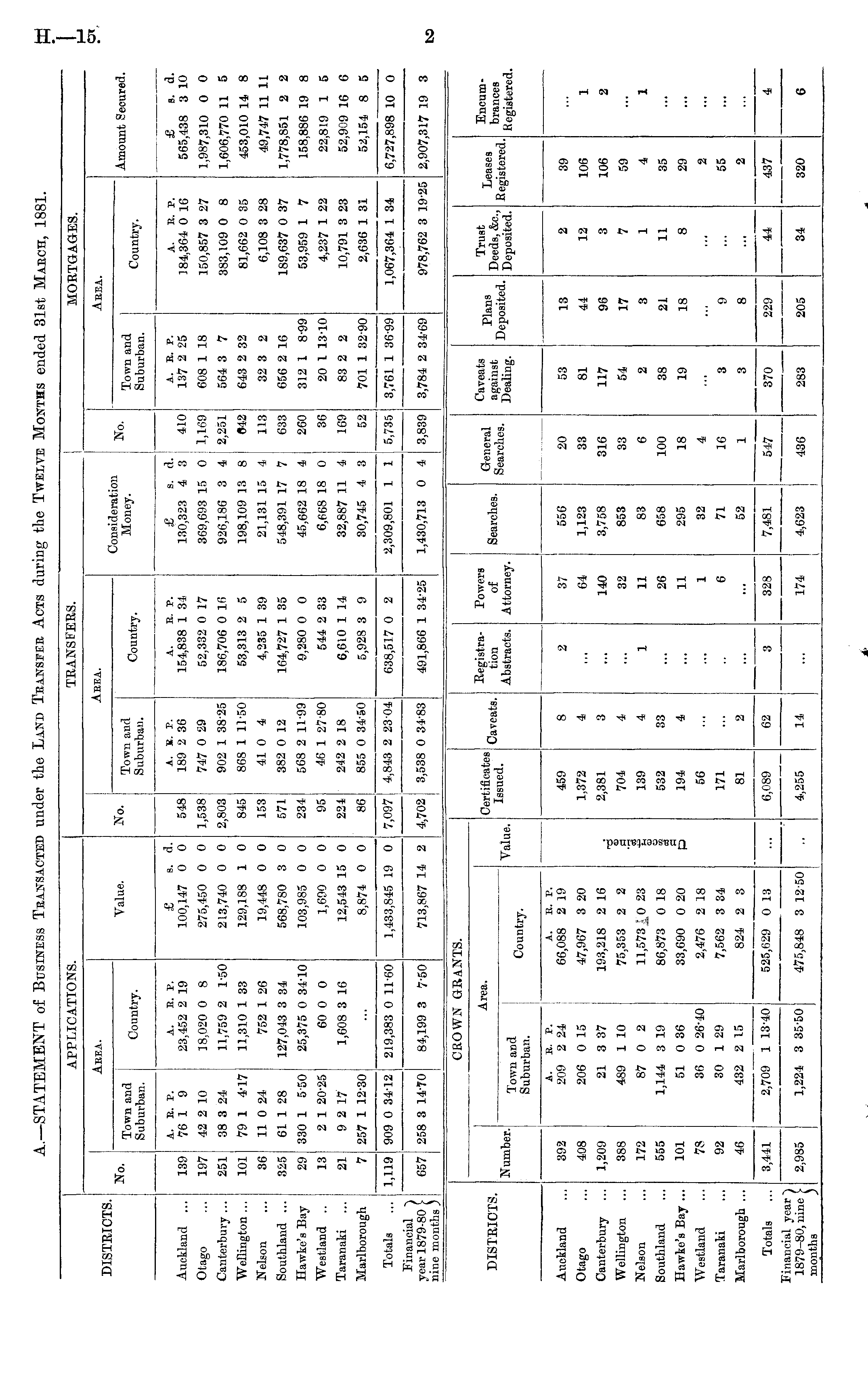A.—STATEMENT of Business Transacted under the Land Transfer Acts during the Twelve Months ended 31st March, 1881.