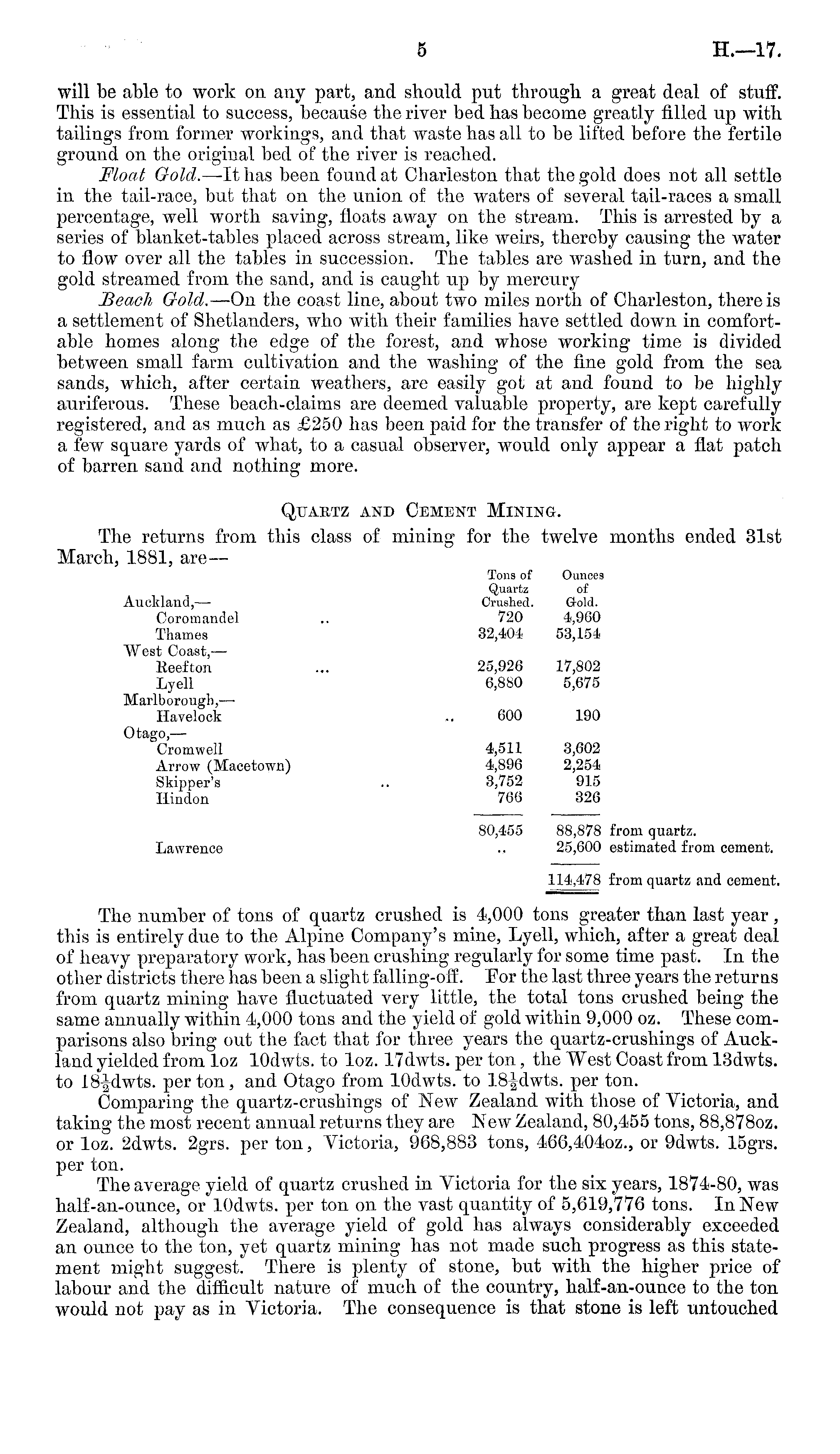 will be able to work on any part, and should put through a great deal of stuff. This is essential to success, because the river bed has become greatly filled up with tailings from former workings, and that waste has all to be lifted before the fertile ground on the original bed of the river is reached. Float Gold.— -It has been found at Charleston that the gold does not all settle in the tail-race, but that on the union of the waters of several tail-races a small percentage, well worth saving, floats away on the stream. This is arrested by a series of blanket-tables placed across stream, like weirs, thereby causing the water to flow over all the tables in succession. The tables are washed in turn, and the gold streamed from the sand, and is caught up by mercury Beach Gold. —On the coast line, about two miles north of Charleston, there is a settlement of Shetlanders, who with their families have settled down in comfortable homes along the edge of the forest, and whose working time is divided between small farm cultivation and the washing of the fine gold from the sea sands, which, after certain weathers, are easily got at and found to be highly auriferous. These beach-claims are deemed valuable property, are kept carefully registered, and as much as £250 has been paid for the transfer of the right to work a few square yards of what, to a casual observer, would only appear a flat patch of barren sand and nothing more. Quartz and Cement Mining. The returns from this class of mining for the twelve months ended 31st March, 1881, are— Tons of Ounces Quartz of Auckland, — Crushed. Gold. Ooromandel .. 720 4,960 Thames 32,404 53,154 West Coast, — Eeefton ... 25,926 17,802 Lyell 6,880 5,675 Marlborough, — Havelock .. 600 190 Otago,— Cromwell 4,511 3,602 Arrow (Macetown) 4,896 2,254 Skipper's .. 3,752 915 Ilindon 766 326 80,455 88,878 from quartz. Lawrence .. 25,600 estimated from cement. 114,478 from quartz and cement. The number of tons of quartz crushed is 4,000 tons greater than last year, this is entirely due to the Alpine Company's mine, Lyell, which, after a great deal of heavy preparatory work, has been crushing regularly for some time past. In the other districts there has been a slight falling-off. Eor the last three years the returns from quartz mining have fluctuated very little, the total tons crushed being the same annually within 4,000 tons and the yield of gold within 9,000 oz. These comparisons also bring out the fact that for three years the quartz-crushings of Auckland yielded from loz lOdwts. to loz. 17dwts. per ton, the West Coast from 13dwts. to 18-^dwts. per ton, and Otago from lOdwts. to 18-^dwts. per ton. Comparing the quartz-crushings of New Zealand with those of Victoria, and taking the most recent annual returns they are New Zealand, 80,455 tons, 88,8780z. or loz. 2dwts. 2grs. per ton, Victoria, 968,883 tons, 466,4040z., or 9dwts. 15grs. per ton. The average yield of quartz crushed in Victoria for the six years, 1874-80, was half-an-ounce, or lOdwts. per ton on the vast quantity of 5,619,776 tons. In New Zealand, although the average yield of gold has always considerably exceeded an ounce to the ton, yet quartz mining has not made such progress as this statement might suggest. There is plenty of stone, but with the higher price of labour and the difficult nature of much of the country, half-an-ounce to the ton would not pay as in Victoria. The consequence is that stone is left untouched