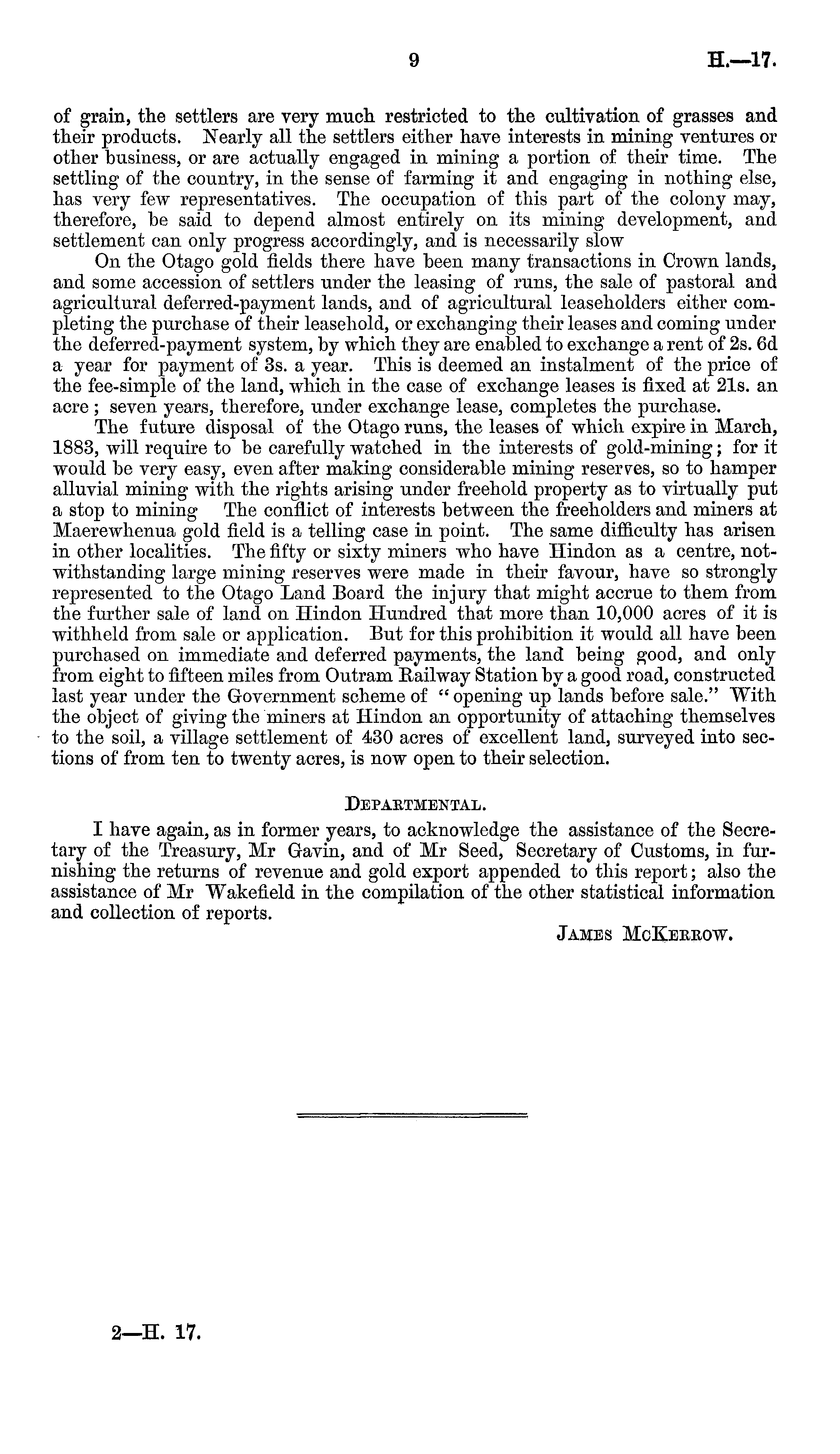 of grain, the settlers are very much restricted to the cultivation of grasses and their products. Nearly all the settlers either have interests in mining ventures or other business, or are actually engaged in mining a portion of their time. The settling of the country, in the sense of farming it and engaging in nothing else, has very few representatives. The occupation of this part of the colony may, therefore, be said to depend almost entirely on its mining development, and settlement can only progress accordingly, and is necessarily slow On the Otago gold fields there have been many transactions in Crown lands, and some accession of settlers under the leasing of runs, the sale of pastoral and agricultural deferred-payment lands, and of agricultural leaseholders either completing the purchase of their leasehold, or exchanging their leases and coming under the deferred-payment system, by which they are enabled to exchange a rent of 2s. 6d a year for payment of 3s. a year. This is deemed an instalment of the price of the fee-simple of the land, which in the case of exchange leases is fixed at 21s. an acre; seven years, therefore, under exchange lease, completes the purchase. The future disposal of the Otago runs, the leases of which expire in March, 1883, will require to be carefully watched in the interests of gold-mining; for it would be very easy, even after making considerable mining reserves, so to hamper alluvial mining with the rights arising under freehold property as to virtually put a stop to mining The conflict of interests between the freeholders and miners at Maerewhenua gold field is a telling case in point. The same difficulty has arisen in other localities. The fifty or sixty miners who have Hindon as a centre, notwithstanding large mining reserves were made in their favour, have so strongly represented to the Otago Land Board the injury that might accrue to them from the further sale of land on Hindon Hundred that more than 10,000 acres of it is withheld from sale or application. But for this prohibition it would all have been purchased on immediate and deferred payments, the land being good, and only from eight to fifteen miles from Outram Railway Station by a good road, constructed last year under the Government scheme of " opening up lands before sale." With the object of giving the miners at Hindon an opportunity of attaching themselves to the soil, a village settlement of 430 acres of excellent land, surveyed into sections of from ten to twenty acres, is now open to their selection. Departmental. I have again, as in former years, to acknowledge the assistance of the Secretary of the Treasury, Mr Gavin, and of Mr Seed, Secretary of Customs, in furnishing the returns of revenue and gold export appended to this report; also the assistance of Mr Wakefield in the compilation of the other statistical information and collection of reports. James McKerrow.
