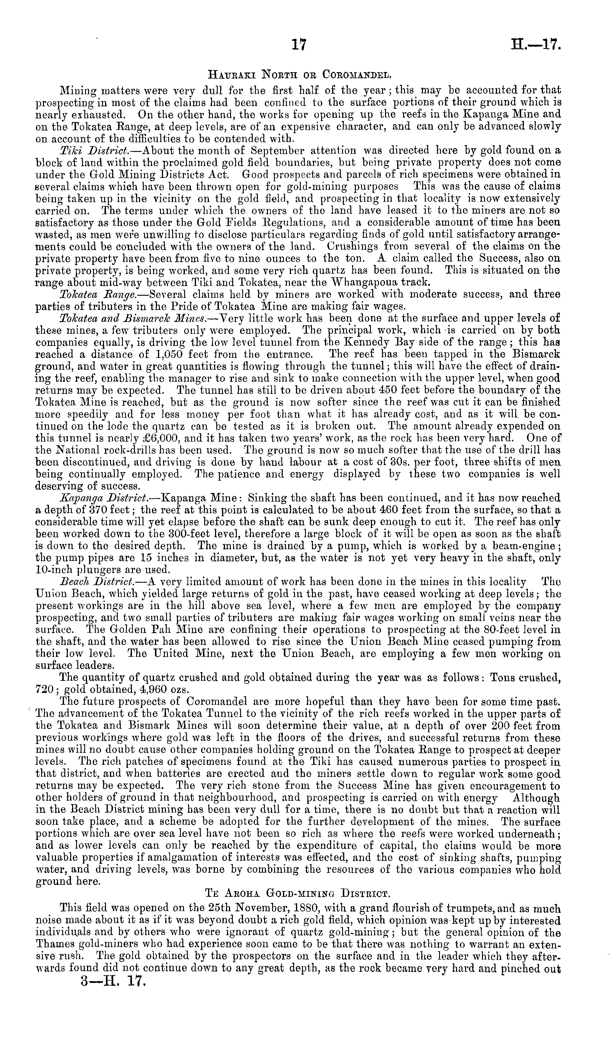 Haueaki Noeth oe Coeomandel. Mining matters were very dull for the first half of the year ; this may be accounted for that prospecting in most of the claims had been confined to the surface portions of their ground which is nearly exhausted. On the other hand, the works for opening up the reefs in the Kapanga Mine and on the Tokatea Range, at deep levels, are of an expensive character, and can only be advanced slowly on account of the difficulties to be contended with. Tiki District. —About the month of September attention was directed here by gold found on a block of land within the proclaimed gold field boundaries, but being private property does not come under the Gold Mining Districts Act. Good prospects and parcels of rich specimens were obtained in several claims which have been thrown open for gold-mining purposes This was the cause of claims being taken up in the vicinity on the gold field, and prospecting in that locality is now extensively carried on. The terms under which the owners of the land have leased it to the miners are not so satisfactory as those under the Gold Fields Regulations, and a considerable amount of time has been wasted, as men were unwilling to disclose particulars regarding finds of gold until satisfactory arrangements could be concluded with the owners of the land. Cmshings from several of the claims on the private propertj r have been from five to nine ounces to the ton. A claim called the Success, also on private property, is being worked, and some very rich quartz has been found. This is situated on the range about mid-wray between Tiki and Tokatea, near the Whangapoua track. Tokatea Range. —Several claims held by miners are worked with moderate success, and three parties of tributers in the Pride of Tokatea Mine are making fair wages. Tokatea and Bismarck Mines.— -Very little work has been done at the surface and upper levels of these mines, a few tributers only were employed. The principal work, which is carried on by both companies equally, is driving the low level tunnel from the Kennedy Bay side of the range; this has reached a distance of 1,050 feet from the entrance. The reef has been tapped in the Bismarck ground, and water in great quantities is flowing through the tunnel; this will have the effect of draining the reef, enabling the manager to rise and sink to make connection with the upper level, when good returns majr be expected. The tunnel has still to be driven about 450 feet before the boundary of the Tokatea Mine is reached, but as the ground is now softer since the reef was cut it can be finished more speedily and for less money per foot than what it has already cost, and as it will, be continued on the lode the quartz can be tested as it is broken out. The amount already expended on this tunnel is nearly £6,000, and it has taken two years' work, as the rock has been very hard. One of the National rock-drills has been used. The ground is now so much softer that the use of the drill has been discontinued, and driving is done by hand labour at a cost of 30s. per foot, three shifts of men being continually employed. The patience and energy displayed by these two companies is well deserving of success. Kapanga District. —Kapanga Mine : Sinking the shaft has been continued, and it has now reached a depth of 370 feet; the reef at this point is calculated to be about 460 feet from the surface, so that a considerable time will yet elapse before the shaft can be sunk deep enough to cut it. The reef has only been worked down to the 300-feet level, therefore a large block of it will be open as soon as the shaft is down to the desired depth. The mine is drained by a pump, which is worked by a beam-engine; the pump pipes are 15 inches in diameter, but, as the water is not yet very heavy in the shaft, only 10-inch plungers are used. Beach District. —A very limited amount of work has been done in the mines in this locality The Union Beach, which yielded large returns of gold in the past, have ceased working at deep levels; the present workings are in the hill above sea level, where a few men are employed by the company prospecting, and two small parties of tributers are making fair wages working on small veins near the surface. The Golden Pah Mine are confining their operations to prospecting at the 80-feet level in the shaft, and the water has been allowed to rise since the Union Beach Mine ceased pumping from their low level. The United Mine, next the Union Beach, are employing a few men working on surface leaders. The quantity of quartz crushed and gold obtained during the year was as follows: Tons crushed, 720 ; gold obtained, 4,960 ozs. The future prospects of Coromandel are more hopeful than they have been for some time past. The advancement of the Tokatea Tunnel to the vicinity of the rich reefs worked in the upper parts of the Tokatea and Bismark Mines will soon determine their value, at a depth of over 200 feet from previous workings where gold was left in the floors of the drives, and successful returns from these mines will no doubt cause other companies holding ground on the Tokatea Range to prospect at deeper levels. The rich patches of specimens found at the Tiki has caused numerous parties to prospect in that district, and when batteries are erected and the miners settle down to regular work some good returns may be expected. The very rich stone from the Success Mine has given encouragement to other holders of ground in that neighbourhood, and prospecting is carried on with energy Although in the Beach District mining has been very dull for a time, there is no doubt but that a reaction will soon take place, and a scheme be adopted for the further development of the mines. The surface portions which are over sea level have not been so rich as where the reefs were worked underneath; and as lower levels can only be reached by the expenditure of capital, the claims would be more valuable properties if amalgamation of interests w