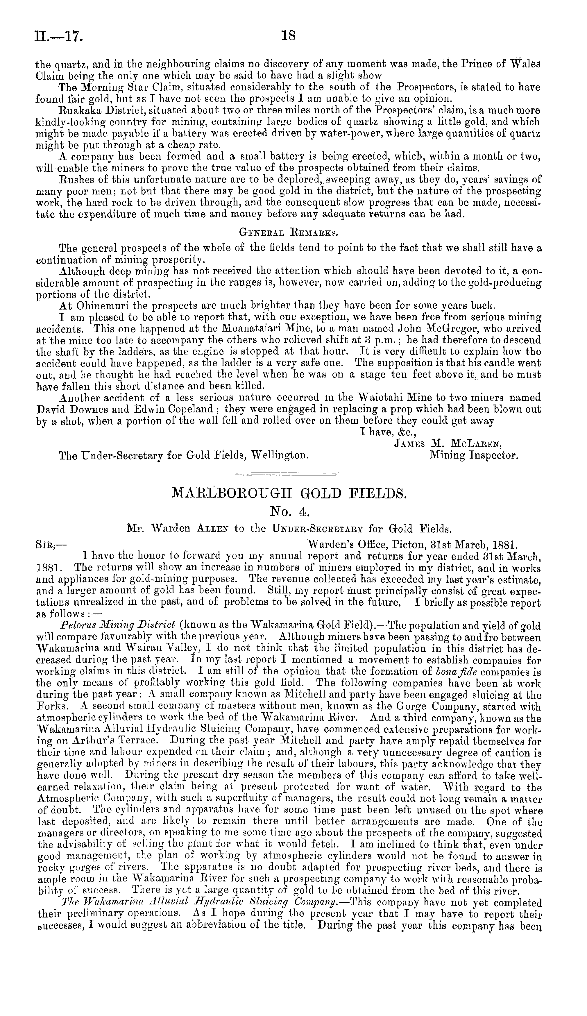 MARLBOROUGH GOLD EIELDS. No. 4. Mr. Warden Allen to the Undee-Seoeetaey for Gold Fields. Sifi,— Warden's Office, Picton, 31st March, 1881. I have the honor to forward you my annual report and returns for year ended 31st March, 1881. The returns will show an increase in numbers of miners employed in my district, and in works and appliances for gold-mining purposes. The revenue collected has exceeded my last year's estimate, and a larger amount of gold has been found. Still, my report must principally consist of great expectations unrealized in the past, and of problems to he solved in the future, I briefly as possible report as follows :— Pelorus Mining District (known as the Wakamarina Gold Field). —The population and yield of gold will compare favourably with the previous year. Although miners have been passing to and fro between Wakamarina and Wairau Valley, I do not think that the limited population in this district has decreased during the past year. In my last report I mentioned a movement to establish companies for working claims in this district. lam still of the opinion that the formation of bona fide companies is the only means of profitably working this gold field. The following companies have been at work during the past year : A small company known as Mitchell and party have been engaged sluicing at the Forks. A second small company of masters without men, known as the Gorge Company, started w-ith atmospheric cylinders to work the bed of the Wakamarina River. And a third company, known as the Wakamarina Alluvial Hydraulic Sluicing Company, have commenced extensive preparations for working on Arthur's Terrace. During the past year Mitchell and party have amply repaid themselves for their time and labour expended on their claim ; and, although a very unnecessary degree of caution is generally adopted by miners in describing the result of their labours, this party acknowledge that they have clone well. During the present dry season the members of this company can afford to take wellearned relaxation, their claim being at present protected for want of water. With regard to the Atmospheric Company, with such a superfluity of managers, the result could not long remain a matter of doubt. The cylinders and apparatus have for some time past been left unused on the spot where last deposited, and are likely to remain there until better arrangements are made. One of the managers or directors, on speaking to me some time ago about the prospects of the company, suggested the advisability of selling the plant for what it would fetch. lam inclined to think that, even under good management, the plan of working by atmospheric cylinders would not be found to answer in rocky gorges of rivers. The apparatus is no doubt adapted for prospecting river beds, and there is ample room in the Wakamarina River for such a prospecting company to work with reasonable probability of success. There is yet a large quantity of gold to be obtained from the bed of this river. The Wakamarina Alluvial Hydraulic Sluicing Company. —This company have not yet completed their preliminary operations. As I hope during the present year that I may have to report their successes, I would suggest an abbreviation of the title. During the past year this company has been