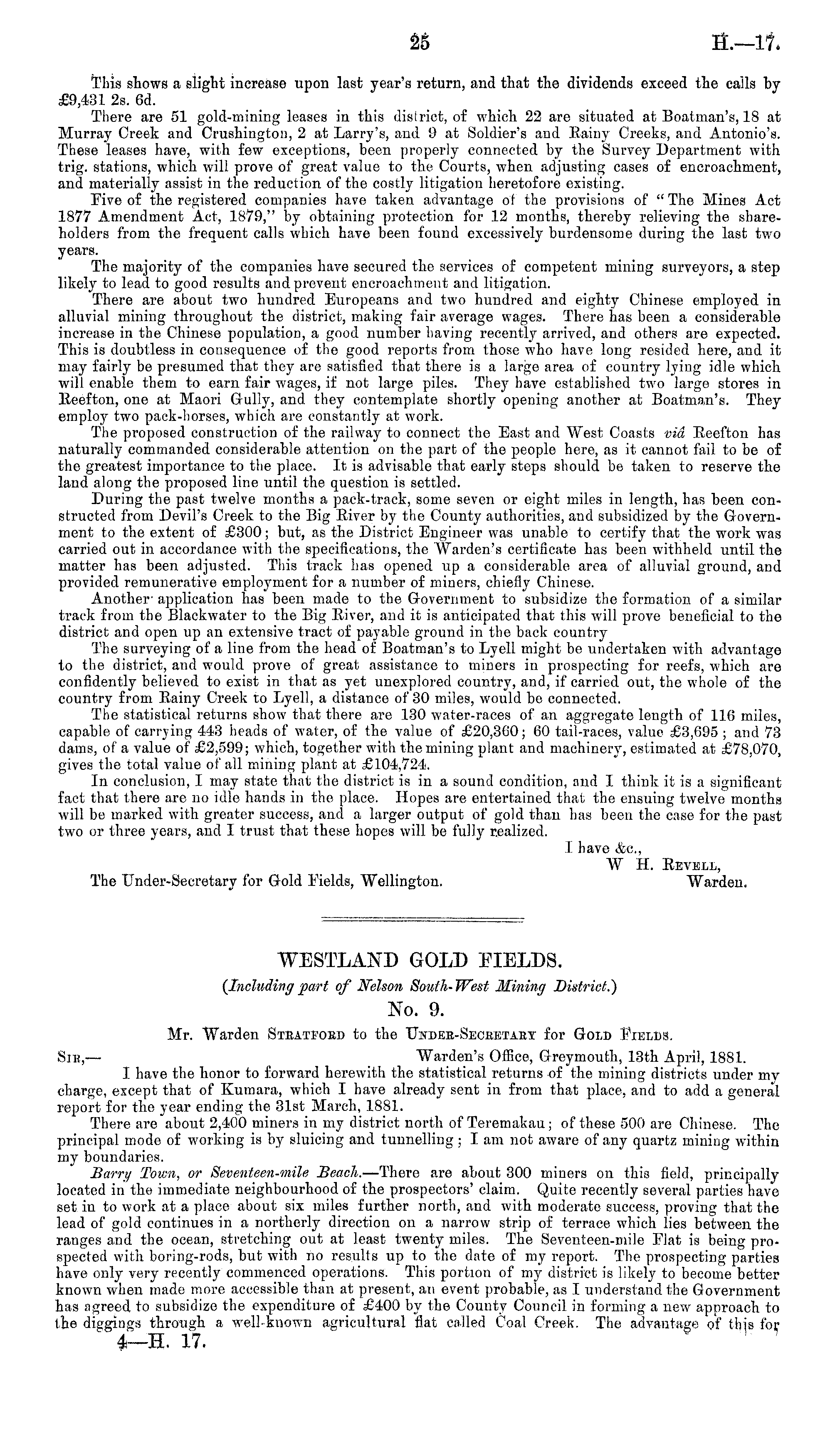 This shows a slight increase upon last year's return, and that the dividends exceed the calls by £9,431 2s. 6d. There are 51 gold-mining leases in this district, of which 22 are situated at Boatman's, 18 at Murray Creek and Crushington, 2 at Larry's, and 9 at Soldier's and Rainy Creeks, and Antonio's. These leases have, with few exceptions, been properly connected by the Survey Department with trig, stations, which will, prove of great value to the Courts, when adjusting cases of encroachment, and materially assist in the reduction of the costly litigation heretofore existing. Five of the registered companies have taken advantage of the provisions of " The Mines Act 1877 Amendment Act, 1879," by obtaining protection for 12 months, thereby relieving the shareholders from the frequent calls which have been found excessively burdensome during the last two years. The majority of the companies have secured the services of competent mining surveyors, a step likely to lead to good results and prevent encroachment and litigation. There are about tw-o hundred Europeans and two hundred and eighty Chinese employed in alluvial mining throughout the district, making fair average wages. There has been a considerable increase in the Chinese population, a good number having recently arrived, and others are expected. This is doubtless in consequence of the good reports from those who have long resided here, and it may fairly be presumed that they are satisfied that there is a large area of country lying idle which will enable them to earn fair wages, if not large piles. They have established two large stores in Reefton, one at Maori Gully, and they contemplate shortly opening another at Boatman's. They eivploj two pack-horses, which are constantly at work. The proposed construction of the railway to connect the East and West Coasts via Reefton has naturally commanded considerable attention on the part of the people here, as it cannot fail to be of the greatest importance to the place. It is advisable that early steps should be taken to reserve the land along the proposed line until the question is settled. During the past twelve months a pack-track, some seven or eight miles in length, has been constructed from Devil's Creek to the Big River by the County authorities, and subsidized by the Government to the extent of £300; but, as the District Engineer was unable to certify that the work was carried out in accordance with the specifications, the Warden's certificate has been withheld until the matter has been adjusted. This track has opened up a considerable area of alluvial ground, and provided remunerative employment for a number of miners, chiefly Chinese. Another' application has been made to the Government to subsidize the formation of a similar track from the Blackwater to the Big River, and it is anticipated that this will prove beneficial to the district and open up an extensive tract of payable ground in the back country The surveying of a line from the head of Boatman's to Lyell might be undertaken with advantage to the district, and would prove of great assistance to miners in prospecting for reefs, which are confidently believed to exist in that as yet unexplored country, and, if carried out, the whole of the country from Rainy Creek to Lyell, a distance of 30 miles, would bo connected. The statistical returns show that there are 130 water-races of an aggregate length of 116 miles, capable of carrying 443 heads of water, of the value of £20,360; 60 tail-races, value £3,695 ; and 73 dams, of a value of £2,599; which, together with the mining plant and machinery, estimated at £78,070, gives the total value of all mining plant at £104,724. In conclusion, I may state that the district is in a sound condition, and I think it is a significant fact that there are no idle hands in the place. Hopes are entertained that the ensuing twelve months will be marked with greater success, and a larger output of gold than has been the case for the past two or three years, and I trust that these hopes will be fully realized. I have &c, W H. Revell, The Under-Secretary for Gold Fields, Wellington. Warden.