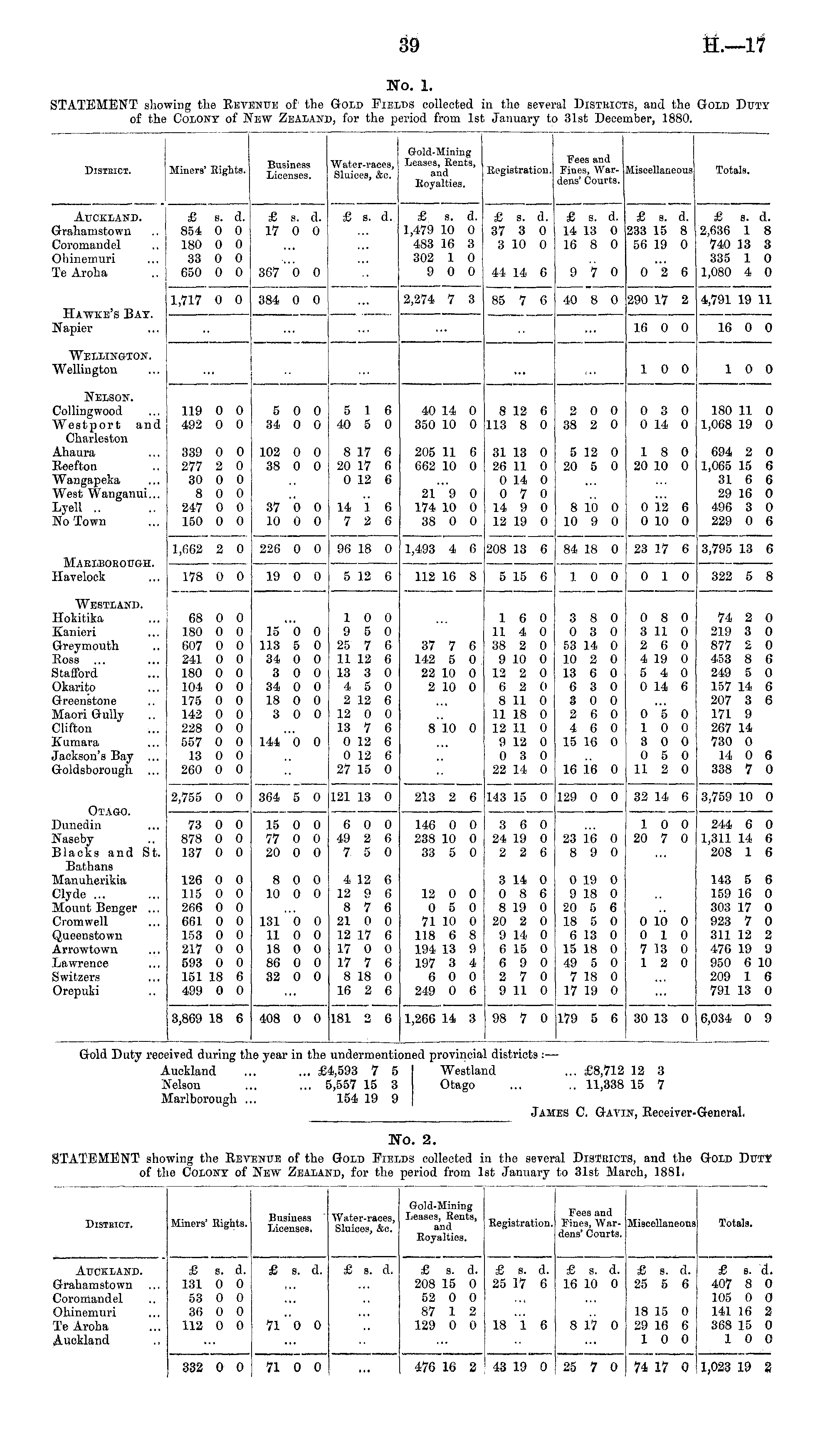 No. 1. STATEMENT showing the Revenue of the Gold Fields collected in the several Districts, and the Gold Duty of the Colony of New Zealand, for the period from 1st January to 31st December, 1880.