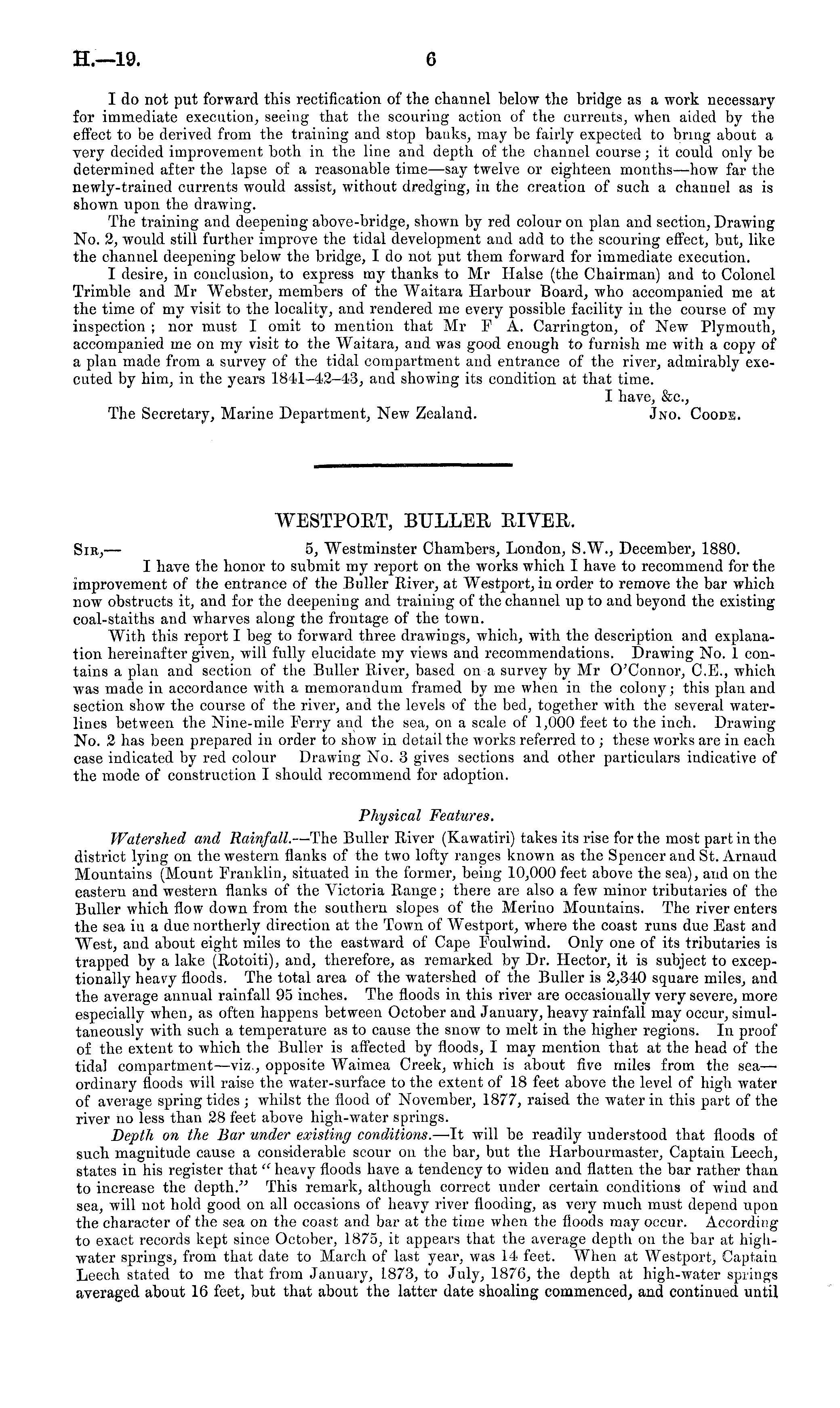 WESTPORT, BULLER RIVER. Sir, — 5, Westminster Chambers, London, S.W., December, 1880. I have the honor to submit my report on the works which I have to recommend for the improvement of the entrance of the Buller River, at Westport, in order to remove the bar which now obstructs it, and for the deepening and training of the channel up to and beyond the existing coal-staiths and wharves along the frontage of the town. With this report I beg to forward three drawings, which, with the description and explanation hereinafter given, will fully elucidate my views and recommendations. Drawing No. 1 contains a plan and section of the Buller River, based on a survey by Mr O'Connor, C.E., which was made in accordance with a memorandum framed by me when in the colony • this plan and section show the course of the river, and the levels of the bed, together with the several waterlines between the Nine-mile Ferry and the sea, on a scale of 1,000 feet to the inch. Drawing No. 2 has been prepared in order to show in detail the works referred to ; these works are in each case indicated by red colour Drawing No. 3 gives sections and other particulars indicative of the mode of construction I should recommend for adoption. Physical Features. Watershed and Rainfall. —The Buller River (Kawatiri) takes its rise for the most part in the district lying on the western flanks of the two lofty ranges known as the Spencer and St. Arnaud Mountains (Mount Franklin, situated in the former, being 10,000 feet above the sea), and on the eastern and western flanks of the Victoria Range; there are also a few minor tributaries of the Buller which flow down from the southern slopes of the Merino Mountains. The river enters the sea in a due northerly direction at the Town of Westport, where the coast runs due East and West, and about eight miles to the eastward of Cape Foulwind. Only one of its tributaries is trapped by a lake (Rotoiti), and, therefore, as remarked by Dr. Hector, it is subject to exceptionally heavy floods. The total area of the watershed of the Buller is 2,340 square miles, and the average annual rainfall 95 inches. The floods in this river are occasionally very severe, more especially when, as often happens between October and January, heavy rainfall may occur, simultaneously with such a temperature as to cause the snow to melt in the higher regions. In proof of the extent to which the Buller is affected by floods, I may mention that at the head of the tidal compartment —viz., opposite Waimea Creek, which is about five miles from the sea— ordinary floods will raise the water-surface to the extent of 18 feet above the level of high water of average springtides ; whilst the flood of November, 1877, raised the water in this part of the river no less than 28 feet above high-water springs. Depth on the Bar under existing conditions. —It will be readily understood that floods of such magnitude cause a considerable scour on the bar, but the Harbourmaster, Captain Leech, states in his register that " heavy floods have a tendency to widen and flatten the bar rather than to increase the depth." This remark, although correct under certain conditions of wind and sea, will not hold good on all occasions of heavy river flooding, as very much must depend upon the character of the sea on the coast and bar at the time when the floods may occur. According to exact records kept since October, 1875, it appears that the average depth on the bar at highwater springs, from that date to March of last year, was 14 feet. When at Westport, Captain Leech stated to me that from January, 1873, to July, 1876, the depth at high-water springs averaged about 16 feet, but that about the latter date shoaling commenced, and continued until