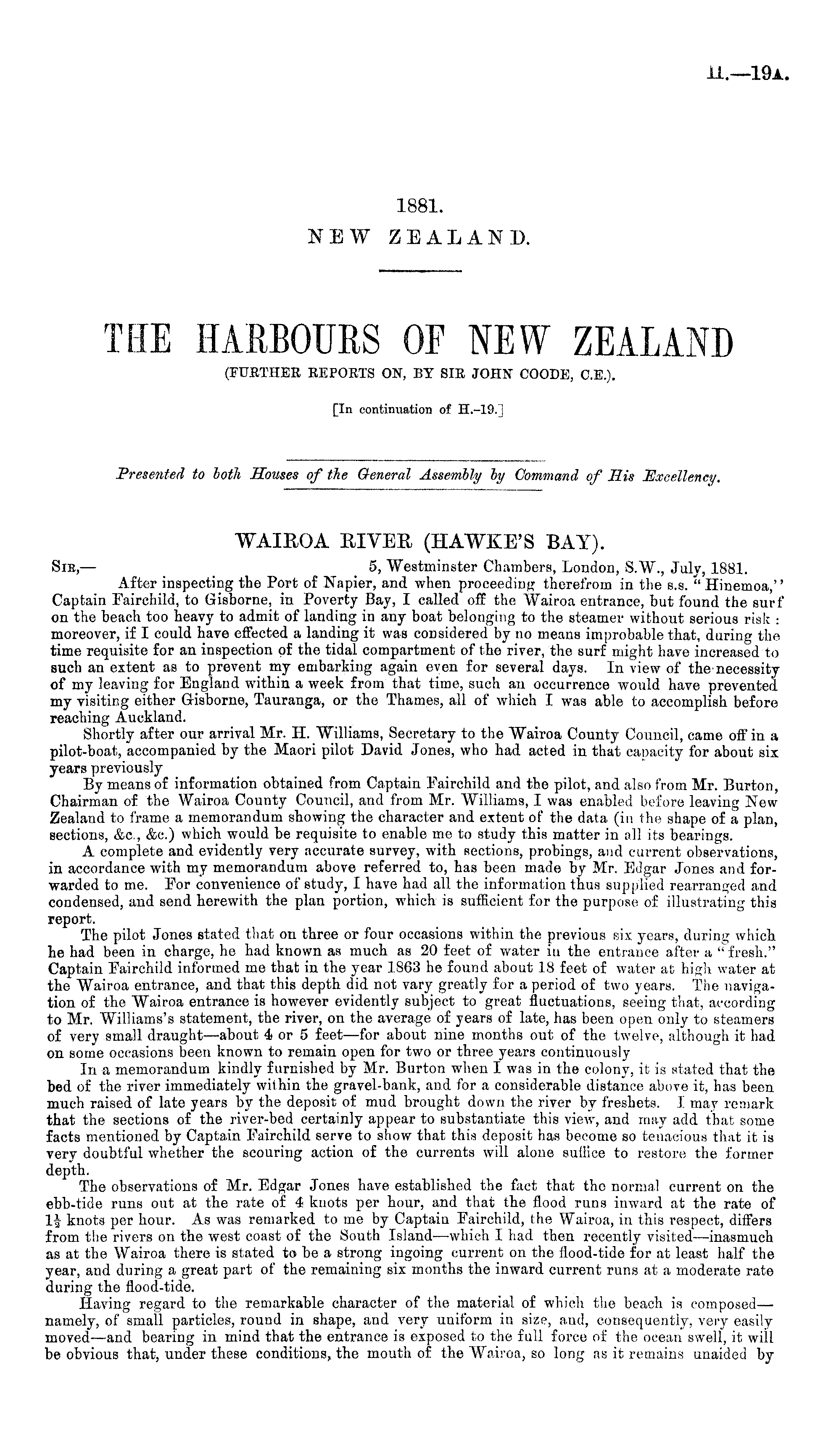 THE HARBOURS OF NEW ZEALAND (FURTHER REPORTS ON, BY SIR JOHN COODE, C.E.). [In continuation of H.-19.]