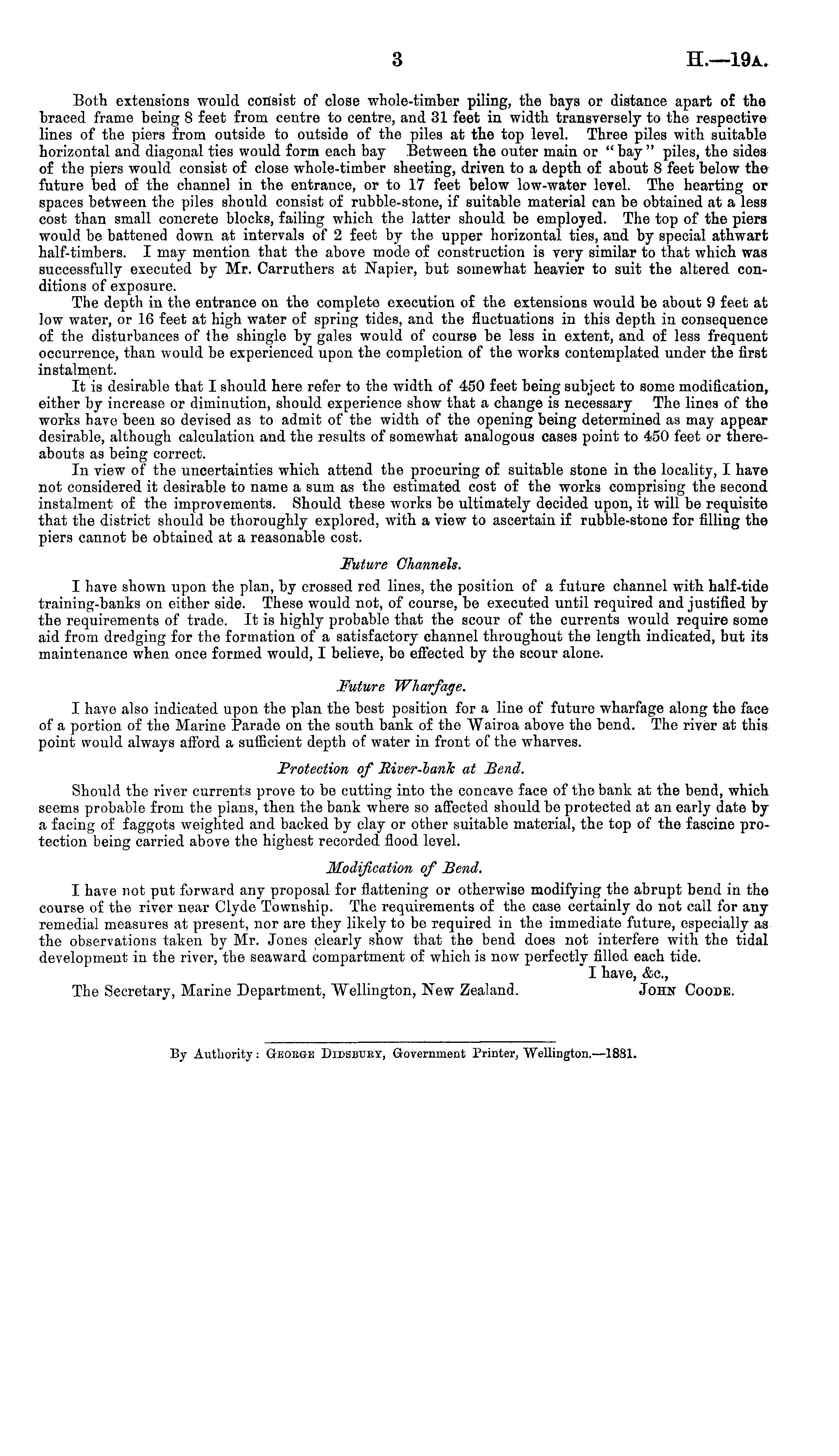 Both extensions would consist of close whole-timber piling, the bays or distance apart of the braced frame being 8 feet from centre to centre, and 31 feet in width transversely to the respective lines of the piers from outside to outside of the piles at the top level. Three piles with suitable horizontal and diagonal ties would form each bay Between the outer main or " bay " piles, the sides of the piers would consist of close whole-timber sheeting, driven to a depth of about 8 feet below the future bed of the channel in the entrance, or to 17 feet below low-water level. The hearting or spaces between the piles should consist of rubble-stone, if suitable material can be obtained at a less cost than small concrete blocks, failing which the latter should be employed. The top of the piers would be battened down at intervals of 2 feet by the upper horizontal ties, and by special athwart half-timbers. I may mention that the above mode of construction is very similar to that which was successfully executed by Mr. Carruthers at Napier, but somewhat heavier to suit the altered conditions of exposure. The depth in the entrance on the complete execution of the extensions would be about 9 feet at low water, or 16 feet at high water of spring tides, and the fluctuations in this depth in consequence of the disturbances of the shingle by gales would of course be less in extent, and of less frequent occurrence, than would be experienced upon the completion of the works contemplated under the first instalment. It is desirable that I should here refer to the width of 450 feet being subject to some modification, either by increase or diminution, should experience show that a change is necessary The lines of the works have been so devised as to admit of the width of the opening being determined as may appear desirable, although calculation and the results of somewhat analogous cases point to 450 feet or thereabouts as being correct. In view of the uncertainties which attend the procuring of suitable stone in the locality, I have not considered it desirable to name a sum as the estimated coat of the works comprising the second instalment of the improvements. Should these works be ultimately decided upon, it will be requisite that the district should be thoroughly explored, with a view to ascertain if rubble-stone for filling the piers cannot be obtained at a reasonable cost. Future Channels. I have shown upon the plan, by crossed red lines, the position of a future channel with half-tide training-banks on either side. These would not, of course, be executed until required and justified by the requirements of trade. It is highly probable that the scour of the currents would require some aid from dredging for the formation of a satisfactory channel throughout the length indicated, but its maintenance when once formed would, I believe, be effected by the scour alone. Future Wharfage. I have also indicated upon the plan the best position for a line of future wharfage along the face of a portion of the Marine Parade on the south bank of the Wairoa above the bend. The river at this point would always afford a sufficient depth of water in front of the wharves. Protection of River-Dank at Bend. Should the river currents prove to be cutting into the concave face of the bank at the bend, which seems probable from the plans, then the bank where so affected should be protected at an early date by a facing of faggots weighted and backed by clay or other suitable material, the top of the fascine protection being carried above the highest recorded flood level. Modification of Send. I have not put forward any proposal for flattening or otherwise modifying the abrupt bend in the course of the river near Clyde Township. The requirements of the case certainly do not call for any remedial measures at present, nor are they likely to be required in the immediate future, especially as the observations taken by Mr. Jones clearly show that the bend does not interfere with the tidal development in the river, the seaward compartment of which is now perfectly filled each tide. I have, &c, The Secretary, Marine Department. Wellington, New Zealand. John Coode.