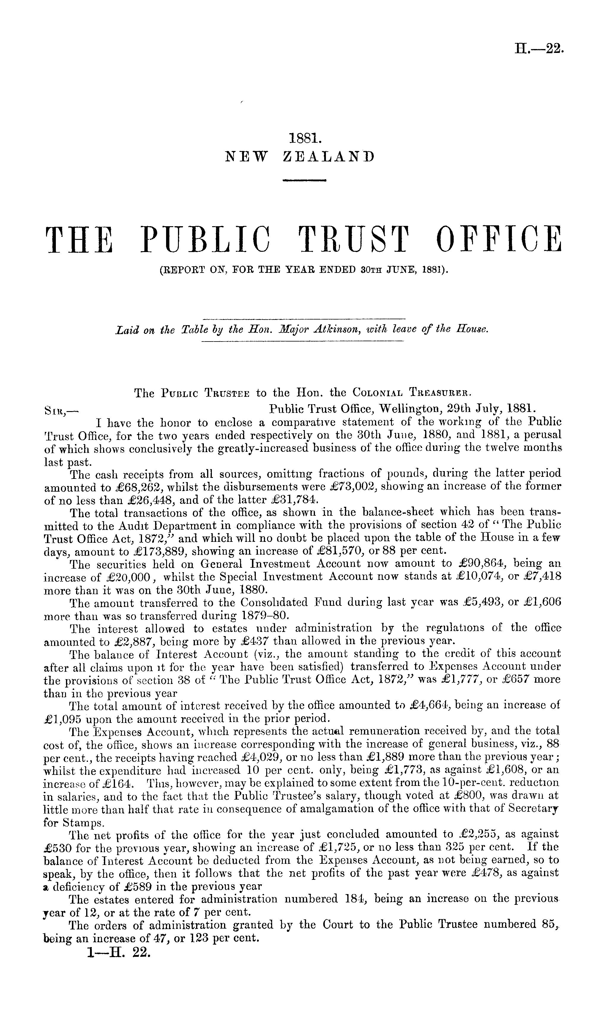 The Public Trustee to the Hon. the Colonial Treasurer. Sik,— Public Trust Office, Wellington, 29th July, 1881. I have the honor to enclose a comparative statement of the working of the Public Trust Office, for the two years ended respectively on the 30th June, 1880, and 1881, a perusal of which shows conclusively the greatly-increased business of the office during the twelve months last past. The cash receipts from all sources, omitting fractions of pounds, during the latter period amounted to £68,262, whilst the disbursements were £73,002, showing an increase of the former of no less than £26,448, and of the latter £31,784. The total transactions of the office, as shown in the balance-sheet which has been transmitted to the Audit Department in compliance with the provisions of section 42 of " The Public Trust Office Act, 1872," and which will no doubt be placed upon the table of the House in a few days, amount to £173,889, showing an increase of £81,570, or 88 per cent. The securities held on General Investment Account now amount to £90,864, being an increase of £20,000, whilst the Special Investment Account now stands at £10,074, or £7,418 more than it was on the 30th June, 1880. The amount transferred to the Consolidated Fund during last year was £5,493, or £1,606 more than was so transferred during 1879-80. The interest allowed to estates under administration by the regulations of the office amounted to £2,887, being more by £437 than allowed in the previous year. The balance of Interest Account (viz., the amount standing to the credit of this account after all claims upon it for the year have been satisfied) transferred to Expenses Account under the provisions of section 38 of " The Public Trust Office Act, 1872/' was £1,777, or £657 more than in the previous year The total amount of interest received by the office amounted to £4,664, being an increase of £1,095 upon the amount received in the prior period. The Expenses Account, which represents the actual remuneration received by, and the total cost of, the office, shows an increase corresponding with the increase of general business, viz., 88 per cent., the receipts having reached £4,029, or no less than £1,889 more than the previous year ; whilst the expenditure had increased 10 per cent, only, being £1,773, as against £1,608, or an increase of £164. This, however, may be explained to some extent from the 10-per-cent. reduction in salaries, and to the fact that the Public Trustee's salary, though voted at £800, was drawn at little more than half that rate in consequence of amalgamation of the office with that of Secretary for Stamps. The net profits of the office for the year just concluded amounted to £2,255, as against £530 for the previous year, showing an increase of £1,725, or no less than 325 per cent. If the balance of Interest Account be deducted from the Expenses Account, as not being earned, so to speak, by the office, then it follows that the net profits of the past year were £478, as against a deficiency of £589 in the previous year The estates entered for administration numbered 184, being an increase on the previous year of 12, or at the rate of 7 per cent. The orders of administration granted by the Court to the Public Trustee numbered 85, being an increase of 47, or 123 per cent. I—H. 22.