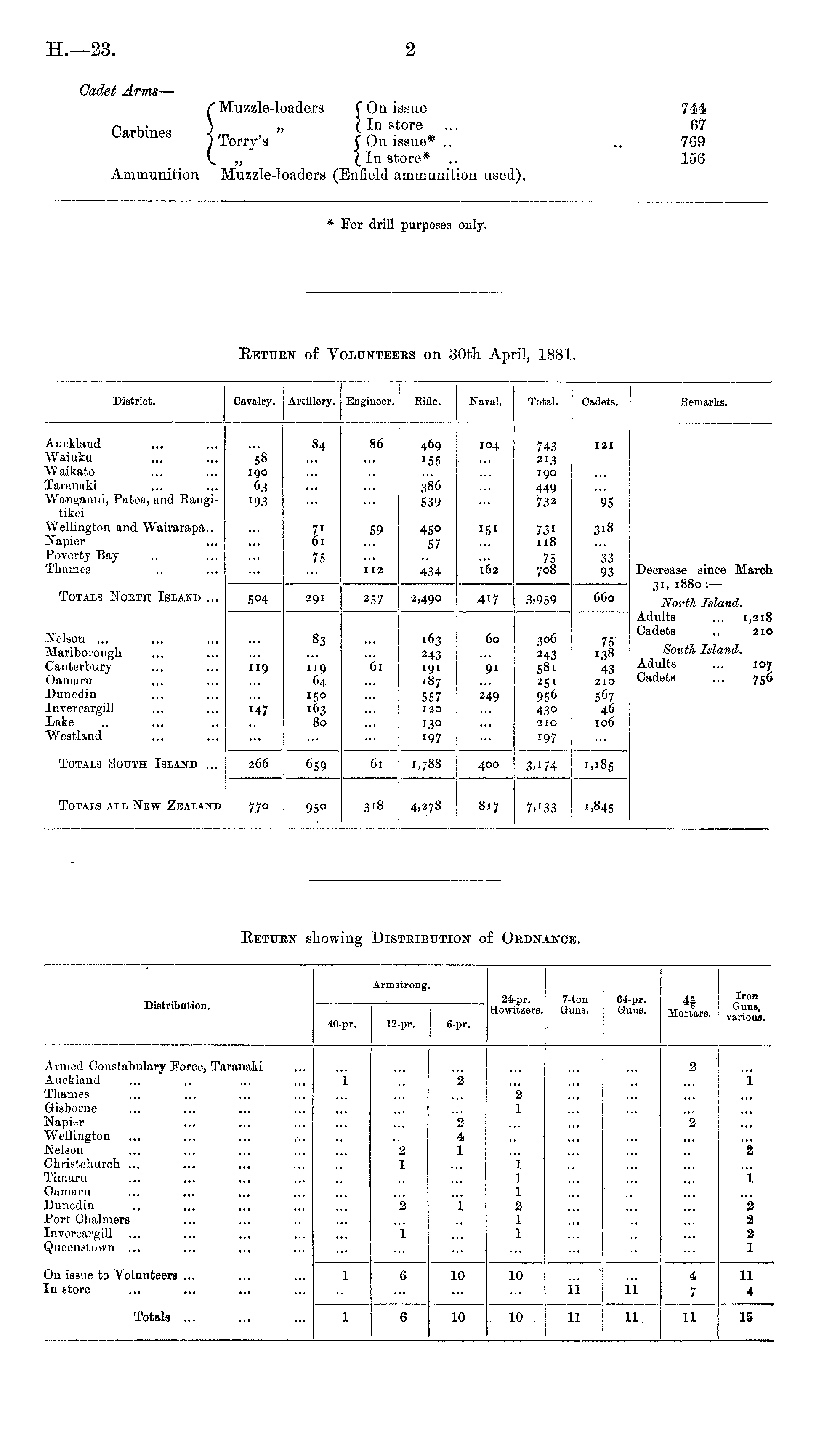 "an ile; ;( Arms — ( Muzzle-loaders f On issue Carbines ) T , » \ *n store # - ) Terry s C On issue* .. L „ (In store* Ammunition Muzzle-loaders (Enfield ammunition used). 744 67 769 156 * For drill purposes only. Retukn of Voluuteebs on 30th April, 1881. District. Cavalry. Artillery. Engineer. Eijle. Naval. Total. Cadets. Kemarks. Auckland Waiuku Waikato Taranaki Wanganui, Patea, and Rangitikei Wellington and Wairarapa.. Napier Poverty Bay Thames 84 86 469 104 743 58 ... ... 155 ... 213 190 ... .. ... ... 190 63 ... ... j 386 ... 449 193 ... ... 539 ... 732 "58 1 go 63 193 84 86 469 ■55 104 121 386 539 7 1 59 45° I5 I 73i 61 ... 57 ... 118 75 - 75 112 434 162 708 7 1 61 75 59 45° 57 ISI 95 3'8 Decrease since March 31, 1880:— 112 434 162 33 93 Totals TJokth Island ... 5°4 291 257 2,490 417 3.959 660 North Island. Adulta ... i,218 Cadets .. 210 kelson ... Marlboro u gh ... ... Canterbury 83 163 243 191 187 557 120 60 306 243 581 25' 956 43° 210 75 138 43 210 567 46 106 South Island. Adults ... 107 Cadets ... 756 119 119 64 15° 163 80 61 9i Oainaru Dnnedin Invercargill Lake Westland H7 249 130 197 197 Totals South Island ... 266 659 61 1,788 400 3.'74 1.18S Totals all New Zealand 770 95° 318 4.278 8.7 7.133 1,845 Eettjen si. owing Distbibtjticxn" o: Oedn. .NCE. Distribution. Armstrong. 24-pr. Howitzers. 7-ton Guns. 04-pr. G-una. Mortars. Iron Guns, various. 40-pr. 12-pr. J I 6-pr. Yrmed Constabulary Force, Taranaki luckland Cliames 3isborne Sfapii-r Wellington kelson ... rimaru 1 2 2 4 1 2 1 2 2 1 2 1 "a )amaru ... ... 3unedin Port Chalmers !nvercargill Jueenstown ... 9 "i 1 1 1 2 1 1 i 2 2 2 1 i )n issue to Volunteers ... n store ... ... ... 1 6 10 10 11 II 4 i 11 4 Totals ... 15 10 10 11 11 11