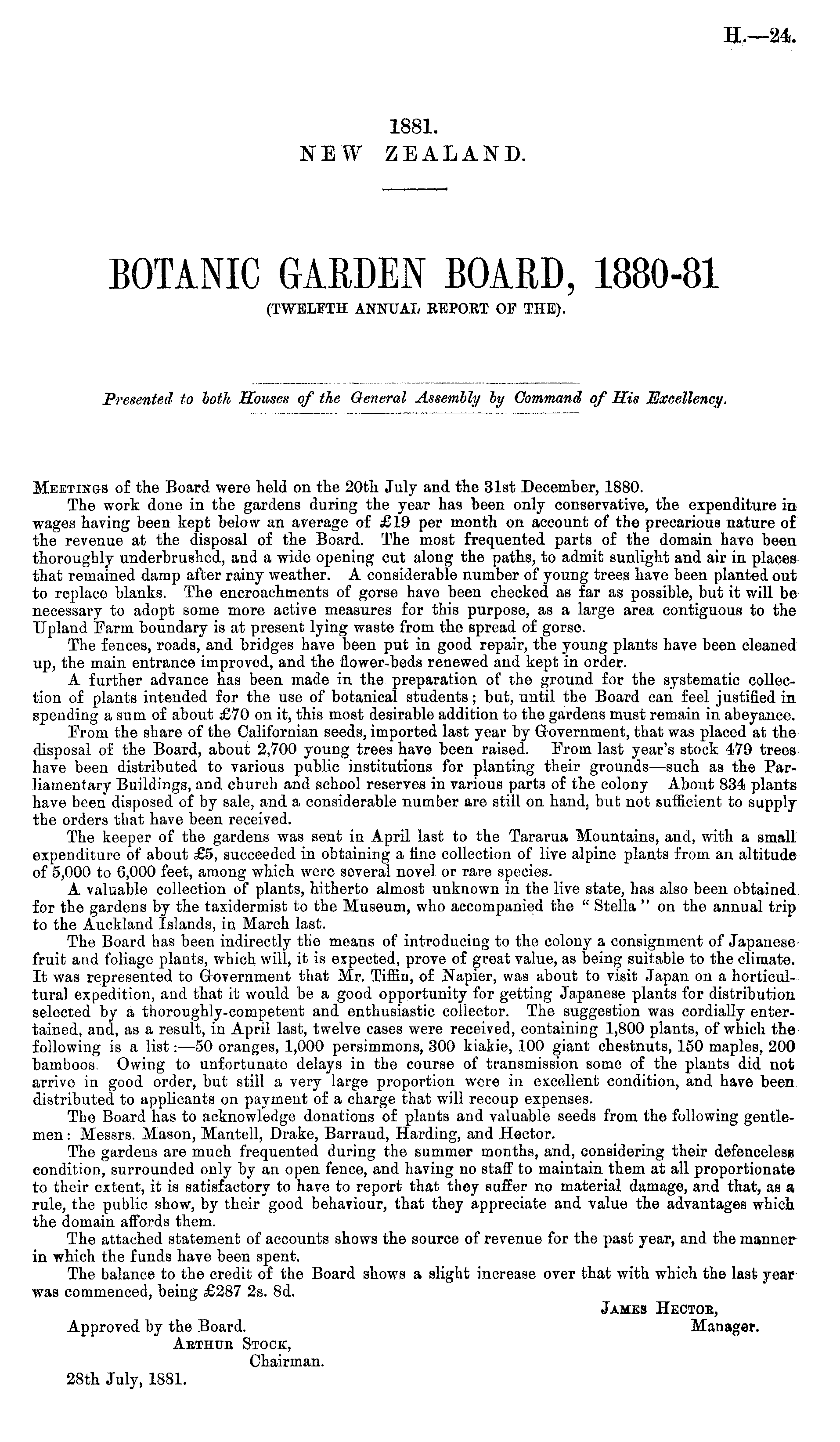 Meetings of the Board were held on the 20th July and the 31st December, 1880. The work done in the gardens during the year has been only conservative, the expenditure in wages having been kept below an average of £19 per month on account of the precarious nature of the revenue at the disposal of the Board. The most frequented parts of the domain have been thoroughly underbrushed, and a wide opening cut along the paths, to admit sunlight and air in places that remained damp after rainy weather. A considerable number of young trees have been planted out to replace blanks. The encroachments of gorse have been checked as far as possible, but it will be necessary to adopt some more active measures for this purpose, as a large area contiguous to the Upland Farm boundary is at present lying waste from the spread of gorse. The fences, roads, and bridges have been put in good repair, the young plants have been cleaned lip, the main entrance improved, and the flower-beds renewed and kept in order. A further advance has been made in the preparation of the ground for the systematic collection of plants intended for the use of botanical students; but, until the Board can feel justified in spending a sum of about £70 on it, this most desirable addition to the gardens must remain in abeyance. From the share of the Californian seeds, imported last year by Government, that was placed at the disposal of the Board, about 2,700 young trees have been raised. From last year's stock 479 trees have been distributed to various public institutions for planting their grounds—such as the Parliamentary Buildings, and church and school reserves in various parts of the colony About 834 plants have been disposed of by sale, and a considerable number are still on hand, but not sufficient to supply the orders that have been received. The keeper of the gardens was sent in April last to the Tararua Mountains, and, with a small expenditure of about £5, succeeded in obtaining a fine collection of live alpine plants from an altitude of 5,000 to 6,000 feet, among which were several novel or rare species. A valuable collection of plants, hitherto almost unknown in the live state, has also been obtained for the gardens by the taxidermist to the Museum, who accompanied the " Stella " on the annual trip to the Auckland Islands, in March last. The Board has been indirectly the means of introducing to the colony a consignment of Japanese fruit and foliage plants, which will, it is expected, prove of great value, as being suitable to the climate. It was represented to Government that Mr. Tiffin, of Napier, was about to visit Japan on a horticultural expedition, and that it would be a good opportunity for getting Japanese plants for distribution selected by a thoroughly-competent and enthusiastic collector. The suggestion was cordially entertained, and, as a result, in April last, twelve cases were received, containing 1,800 plants, of which the following is a list: —50 oranges, 1,000 persimmons, 300 kiakie, 100 giant chestnuts, 150 maples, 200 bamboos. Owing to unfortunate delays in the course of transmission some of the plants did not arrive in good order, but still a very large proportion were in excellent condition, and have been distributed to applicants on payment of a charge that will recoup expenses. The Board has to acknowledge donations of plants and valuable seeds from the following gentlemen : Messrs. Mason, Mantell, Drake, Barraud, Harding, and Hector. The gardens are much frequented during the summer months, and, considering their defenceless* condition, surrounded only by an open fence, and having no staff to maintain them at all proportionate to their extent, it is satisfactory to have to report that they suffer no material damage, and that, as a rule, the public show, by their good behaviour, that they appreciate and value the advantages which the domain affords them. The attached statement of accounts shows the source of revenue for the past year, and the manner in which the funds have been spent. The balance to the credit of the Board shows a slight increase over that with which the last year was commenced, being £287 2s. Bd. James Hectoe, Approved by the Board. Manager. Abthub Stock, Chairman. 28th July, 1881.