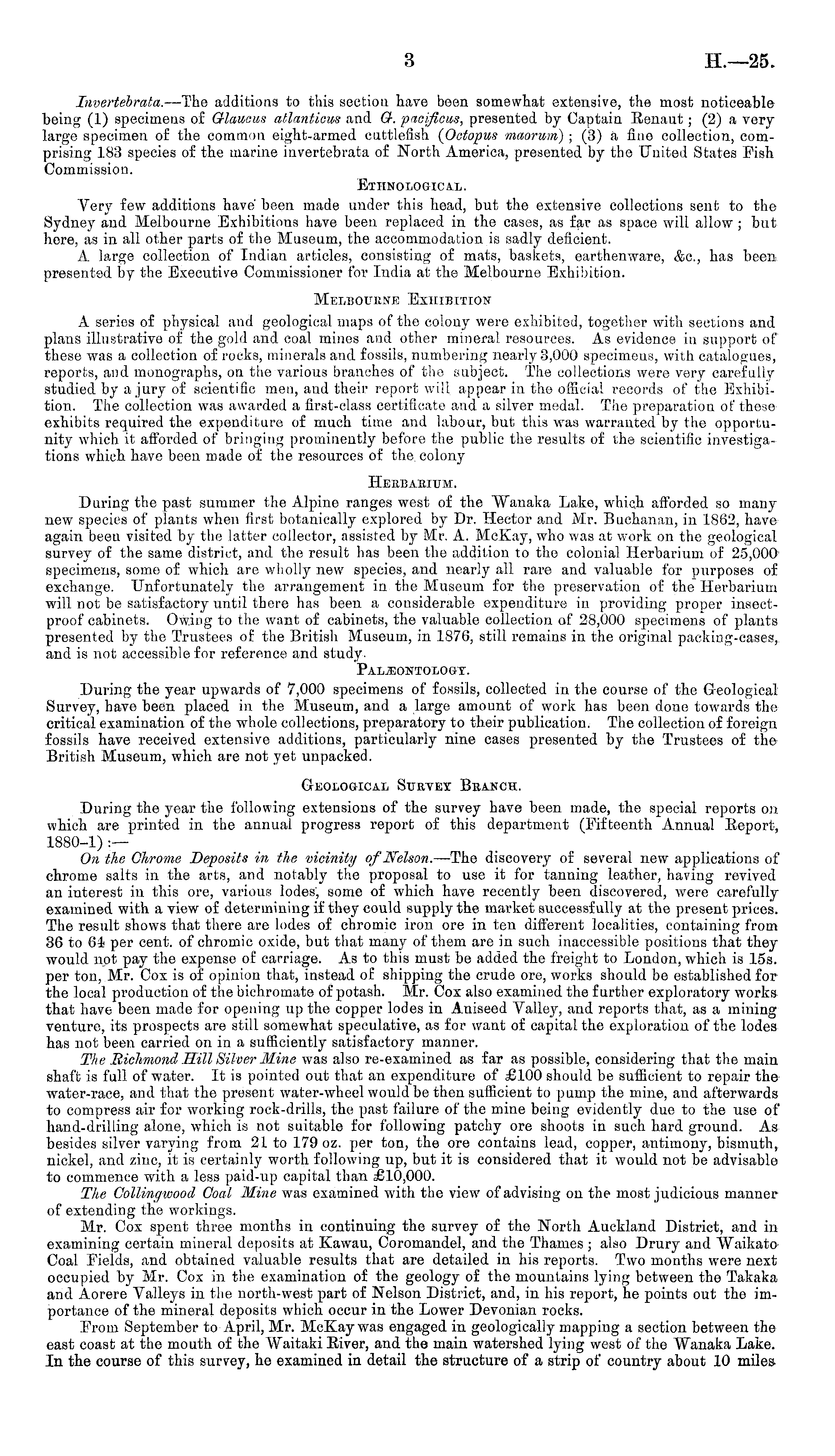 Invertebmta. —The additions to this section have been somewhat extensive, the most noticeable being (1) specimens of Glatteu,? atlantious and G. pacificus, presented by Captain Renaut; (2) a very large specimen of the common eight-armed cuttlefish (Octopus maorwm) ; (3) a fine collection, comprising 183 species of the marine invertebrata of North America, presented by the United States Fish Commission. Ethnological. Very few additions have' been made under this head, but the extensive collections sent to the Sydney and Melbourne Exhibitions have been replaced in the cases, as far as space will allow ; but here, as in all other parts of the Museum, the accommodation is sadly deficient. A large collection of Indian articles, consisting of mats, baskets, earthenware, &c, has been presented by the Executive Commissioner for India at the Melbourne Exhibition. Melbourne Exhibition A series of physical and geological maps of the colony were exhibited, together with sections and plans illustrative of the gold and coal mines and other mineral resources. As evidence in support of these was a collection of rocks, minerals and fossils, numbering nearly 3,000 specimens, with catalogues, reports, and monographs, on the various branches of the subject. The collections were very carefully studied by a jury of scientific men, and their report will appear in the official records of the Exhibition. The collection was awarded a first-class certificate and a silver medal. The preparation of these exhibits required the expenditure of much time and labour, but this was warranted by the opportunity which it afforded of bringing prominently before the public the results of the scientific investigations which have been made of the resources of the. colony Herbarium. During the past summer the Alpine ranges west of the "Wanaka Lake, which afforded so many new species of plants when first botanically explored by Dr. Hector and Mr. Buchanan, in 1862, have again been visited by the latter collector, assisted by Mr. A. BfcKay, who was at work on the geological survey of the same district, and the result has been the addition to the colonial Herbarium of 25,000 specimens, some of which are wholly new species, and nearly all rare and valuable for purposes of exchange. Unfortunately the arrangement in the Museum for the preservation of the Herbarium will not be satisfactory until there has been a considerable expenditure in providing proper insectproof cabinets. Owing to the want of cabinets, the valuable collection of 28,000 specimens of plants presented by the Trustees of the British Museum, in 187G, still remains in the original packing-cases, and is not accessible for reference and study. Palaeontology. During the year upwards of 7,000 specimens of fossils, collected in the course of the Geological Survey, have been placed in the Museum, and a large amount of work has been done towards the critical examination of the whole collections, preparatory to their publication. The collection of foreign fossils have received extensive additions, particularly nine cases presented by the Trustees of the British Museum, which are not yet unpacked. Geological Survey Branch. During the year the following extensions of the survey have been made, the special reports on which, are printed in the annual progress report of this department (Fifteenth Annual Eeport, 1880-1) :— On the Chrome Deposits in the vicinity of Nelson. —The discovery of several new applications of chrome salts in the arts, and notably the proposal to use it for tanning leather, having revived an interest in this ore, various lodes, some of which have recently been discovered, were carefully examined with a view of determining if they could supply the market successfully at the present prices. The result shows that there are lodes of chromic iron ore in ten different localities, containing from 36 to 6i per cent, of chromic oxide, but that many of them are in such inaccessible positions that they would not pay the expense of carriage. As to this must be added the freight to London, which is 15s. per ton, Mr. Cox is of opinion that, instead o£ shipping the crude ore, works should be established for the local production of the bichromate of potash. Mr. Cox also examined the further exploratory works that have been made for opening up the copper lodes in Aniseed Valley, and reports that, as a mining venture, its prospects are still somewhat speculative, as for want of capital the exploration of the lodes has not been carried on in a sufficiently satisfactory manner. The Richmond Hill Silver Mine was also re-examined as far as possible, considering that the main shaft is full of water. It is pointed out that an expenditure of £100 should be sufficient to repair the water-race, and that the present water-wheel would be then sufficient to pump the mine, and afterwards to compress air for working rock-drills, the past failure of the mine being evidently due to the use of hand-drilling alone, which is not suitable for following patchy ore shoots in such hard ground. As besides silver varying from 21 to 179 oz. per ton, the ore contains lead, copper, antimony, bismuth, nickel, and zinc, it is certainly worth following up, but it is considered that it would not be advisable to commence with a less paid-up capital than £10,000. The Collinqwood Coal Mine was examined with the view of advising on the most judicious manner of extending the workings. Mr. Cox spent three months in continuing the survey of the North Auckland District, and in examining certain mineral deposits at Kawau, Coromandel, and the Thames ; also Drury and Waikato Coal Fields, and obtained valuable results that are detailed in his reports. Two months were next occupied by Mr. Cox in the examination of the geology of the mountains lying between the Takaka and Aorere Valleys in the north-west part of Nelson District, and, in his report, he points out the importance of the mineral deposits which occur i