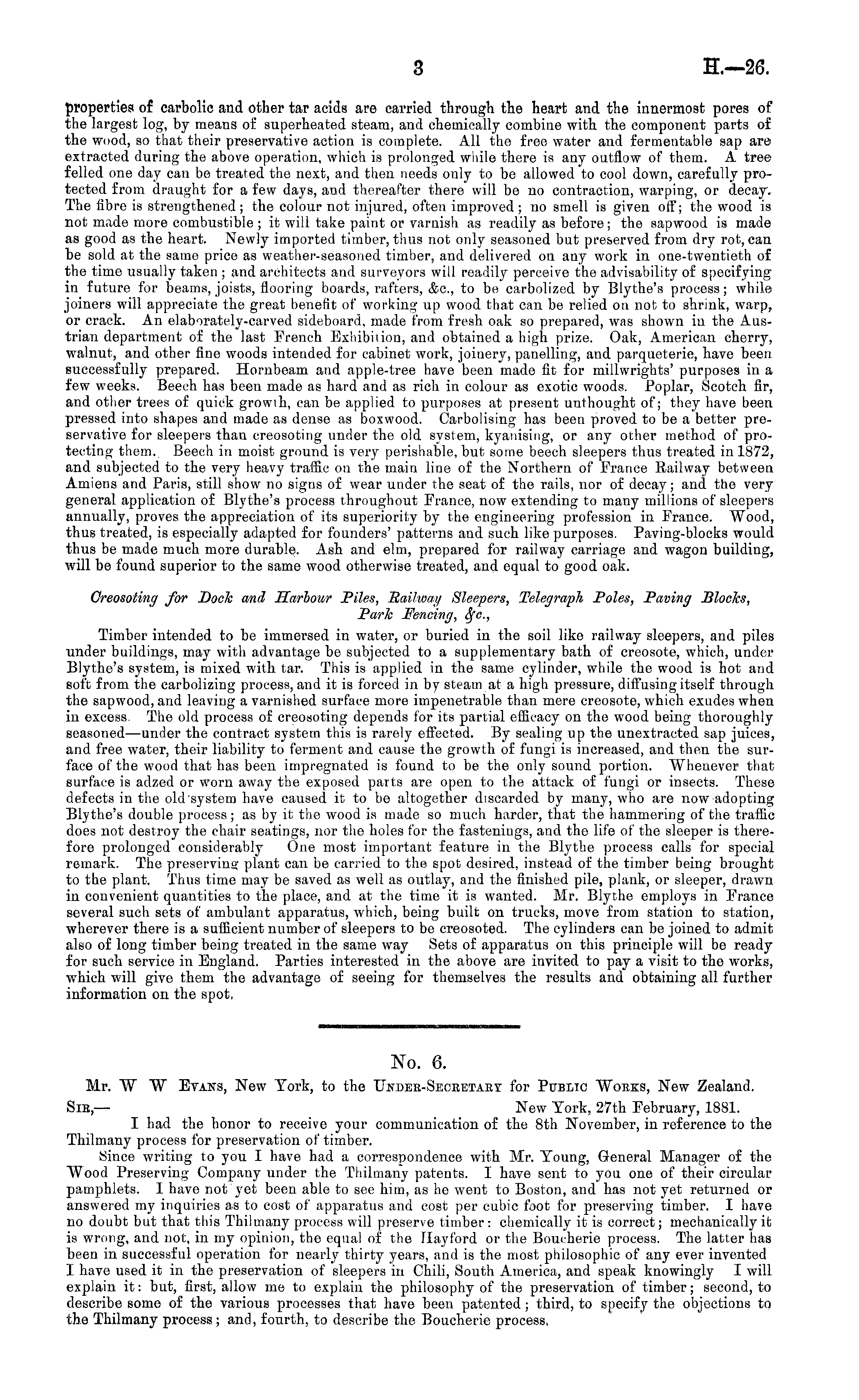 No. 6. Mr. W W Evans, New York, to the Undee-Seceetaey for Public Woeks, New Zealand. Sib,— New York, 27th February, 1881. I had the honor to receive your communication of the Bth November, in reference to the Thilmany process for preservation of timber. Since writing to you I have had a correspondence with Mr. Young, General Manager of the Wood Preserving Company under the Thilmany patents. I have sent to you one of their circular pamphlets. I have not yet been able to see him, as he went to Boston, and has not yet returned or answered my inquiries as to cost of apparatus and cost per cubic foot for preserving timber. I have no doubt but that this Thilmany process will preserve timber : chemically it is correct; mechanically it is wrong, and not, in my opinion, the equal of the Ilayford or the Boucherie process. The latter has been in successful operation for nearly thirty years, and is the most philosophic of any ever invented I have used it in the preservation of sleepers in Chili, South America, and speak knowingly I will explain it: but, first, allow me to explain the philosophy of the preservation of timber; second, to describe some of the various processes that have been patented; third, to specify the objections to the Thilmany process; and, fourth, to describe the Boucherie process,