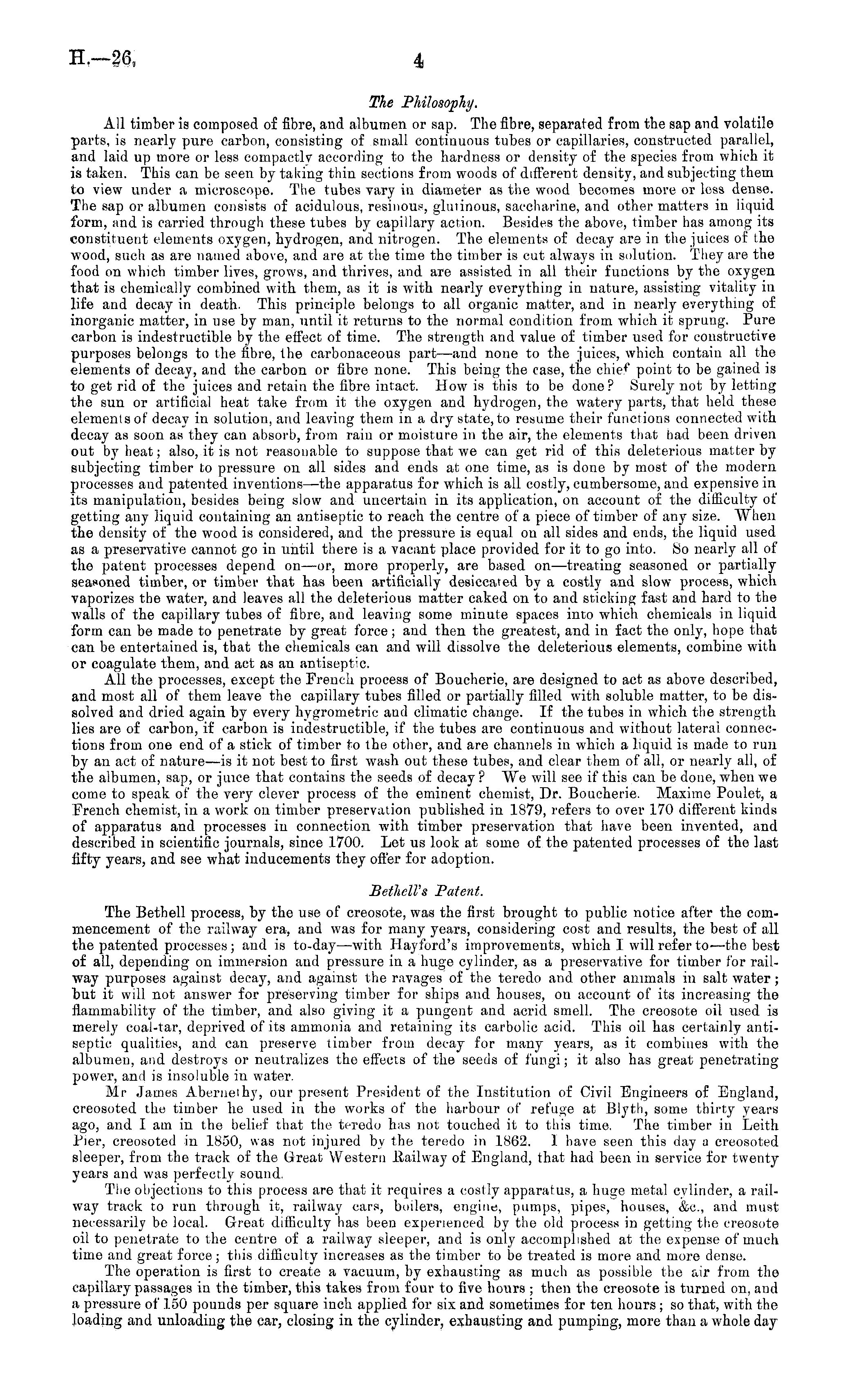 The Philosophy. All timber is composed of fibre, and albumen or sap. The fibre, separated from the sap and volatile parts, is nearly pure carbon, consisting of small continuous tubes or capillaries, constructed parallel, and laid up more or less compactlv according to the hardness or density of the species from which it is taken. This can be seen by taking thin sections from woods of different density, and subjecting them to view under a microscope. The tubes vary in diameter as the wood becomes more or less dense. The sap or albumen consists of acidulous, resinous, glutinous, saccharine, and other matters in liquid form, and is carried through these tubes by capillary action. Besides the above, timber has among its constituent elements oxygen, hydrogen, and nitrogen. The elements of decay are in the juices of the wood, such as are named above, and are at the time the timber is cut always in solution. They are the food on which timber lives, grows, and thrives, and are assisted in all their functions by the oxygen that is chemically combined with them, as it is with nearly everything in nature, assisting vitality in life and decay in death. This principle belongs to all organic matter, and in nearly everything of inorganic matter, in use by man, until it returns to the normal condition from which it sprung. Pure carbon is indestructible by the effect of time. The strength and value of timber used for constructive purposes belongs to the fibre, the carbonaceous part —-and none to the juices, which contain all the elements of decay, and the carbon or fibre none. This being the case, the chie*' point to be gained is to get rid of the juices and retain the fibre intact. How is this to be done? Surely not by letting the sun or artificial heat take from it the oxygen and hydrogen, the watery parts, that held these elements of decav in solution, and leaving them in a dry state, to resume their functions connected with decay as soon as they can absorb, from rain or moisture in the air, the elements that had been driven out by heat; also, it is not reasonable to suppose that we can get rid of this deleterious matter by subjecting timber to pressure on all sides and ends at one time, as is done by most of the modern processes and patented inventions —the apparatus for which is all costly, cumbersome, and expensive in its manipulation, besides being slow and uncertain in its application, on account of the difficulty of getting any liquid containing an antiseptic to reach the centre of a piece of timber of any size. When the density of the wood is considered, and the pressure is equal on all sides and ends, the liquid used as a preservative cannot go in until there is a vacant place provided for it to go into. So nearly all of the patent processes depend on —or, more properly, are based on —treating seasoned or partially seasoned timber, or timber that has been artificially desiccated by a costly and slow process, which vaporizes the water, and leaves all the deleterious matter caked on to and sticking fast and hard to the walls of the capillary tubes of fibre, and leaving some minute spaces into which chemicals in liquid form can be made to penetrate by great force; and then the greatest, and in fact the only, hope that can be entertained is, that the chemicals can and will dissolve the deleterious elements, combine with or coagulate them, and act as an antiseptic. All the processes, except the French process of Boucherie, are designed to act as above described, and most all of them leave the capillary tubes filled or partially filled with soluble matter, to be dissolved and dried again by every hygrometric and climatic change. If the tubes in which the strength lies are of carbon, if carbon is indestructible, if the tubes are continuous and without lateral connections from one end of a stick of timber to the other, and are channels in which a liquid is made to run by an act of nature—is it not best to first wash out these tubes, and clear them of all, or nearly all, of the albumen, sap, or juice that contains the seeds of decay ? We will see if this can be done, when we come to speak of the very clever process of the eminent chemist, Dr. Boucherie. Maxime Poulet, a French chemist, in a work on timber preservation published in 1879, refers to over 170 different kinds of apparatus and processes iu connection with timber preservation that have been invented, and described in scientific journals, since 1700. Let us look at some of the patented processes of the last fifty years, and see what inducements they offer for adoption. Bethell's Patent. The Bethell process, by the use of creosote, was the first brought to public notice after the commencement of the railway era, and was for many years, considering cost and results, the best of all the patented processes ; and is to-day —with Hayford's improvements, which I will refer to —the best of all, depending on immersion and pressure in a huge cylinder, as a preservative for timber for railway purposes against decay, and against the ravages of the teredo and other animals in salt water; but it will not answer for preserving timber for ships and houses, on account of its increasing the flammability of the timber, and also giving it a pungent and acrid smell. The creosote oil used is merely coal-tar, deprived of its ammonia and retaining its carbolic acid. This oil has certainly antiseptic qualities, and can preserve timber from decay for many years, as it combines with the albumen, and destroys or neutralizes the effects of the seeds of fungi; it also has great penetrating power, and is insoluble in water. Mr James Abernethy, our present President of the Institution of Civil Engineers of England, creosoted the timber he used iu the works of the harbour of refuge at Blyth, some thirty years ago, and lam in the belief that the teredo has not touched it to this time. The timber in Leith Pier, creosoted in 1850, was not injured by the teredo in 1