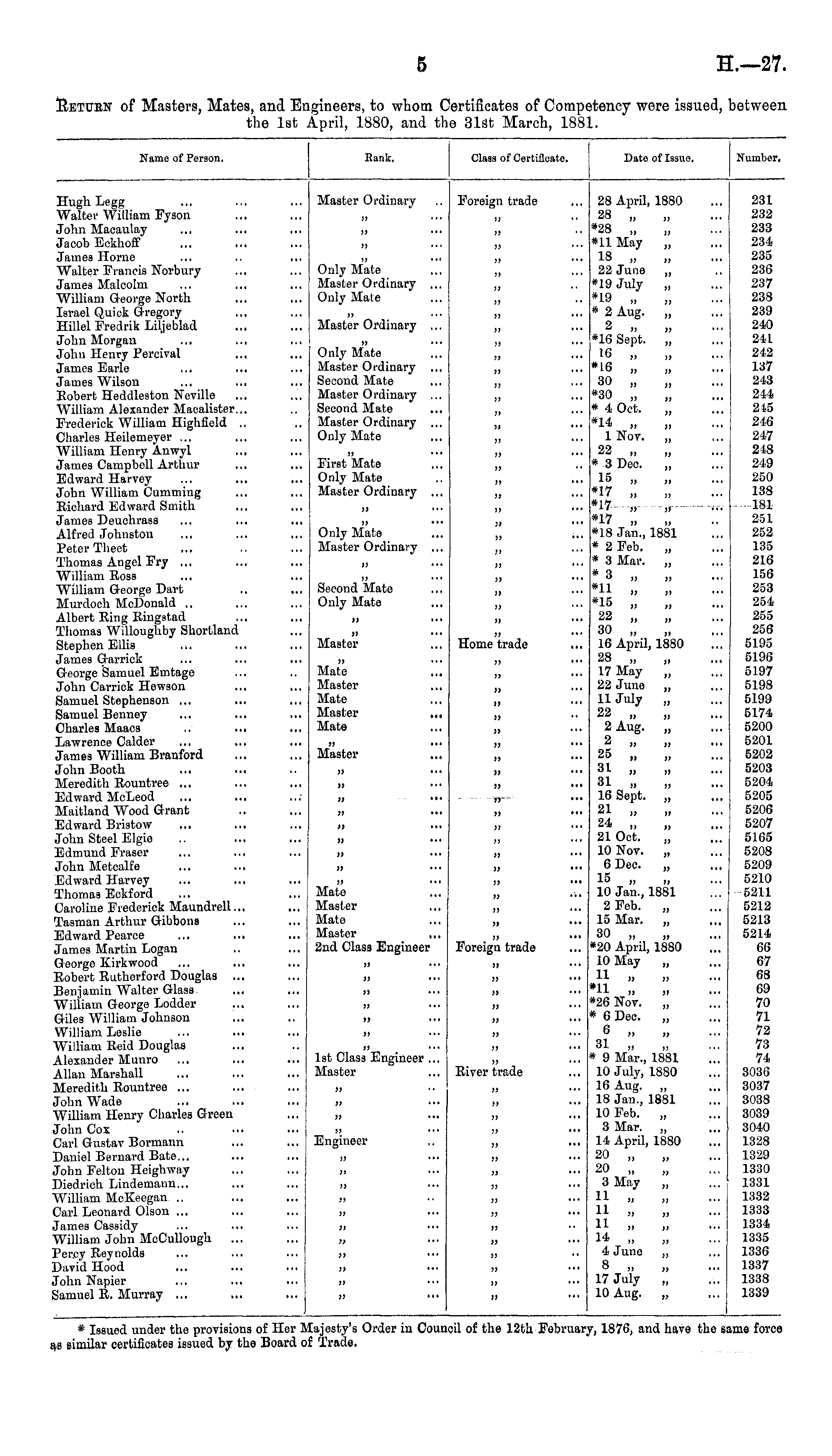 Return of Masters, Mates, and Engineers, to whom Certificates of Competency were issued, between the 1st April, 1880, and the 31st March, 1881.