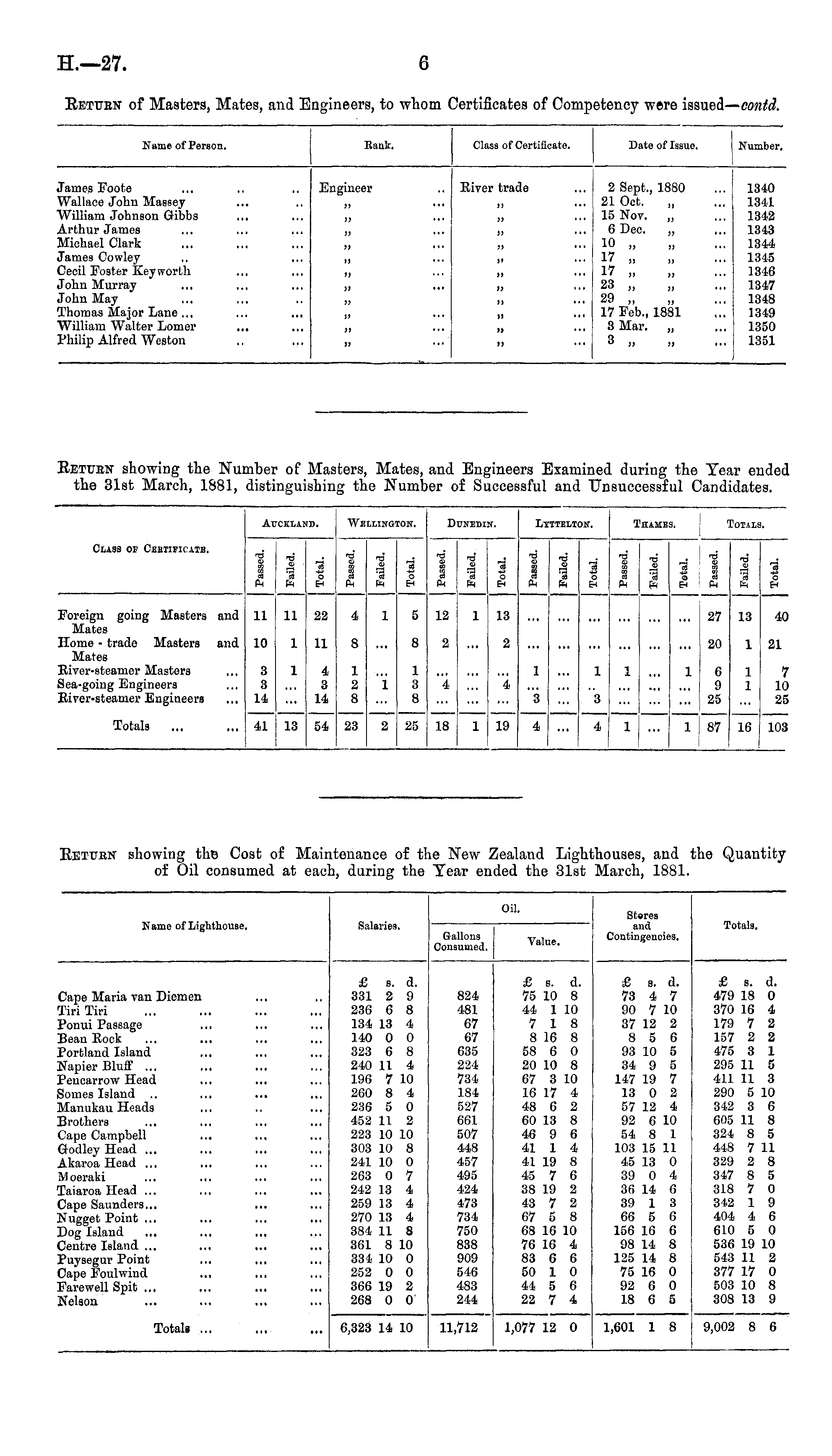 Oil. Name of Lighthouse. Salaries. Stores and Contingencies. Totals. Gallons Consumed. Value. 3ape Maria van Diemen Piri Tiri 'onui Passage Bean Rock 'ortland Island Napier Bluff ... 5encarrow Head lomes Island ilanukau Heads Brothers Jape Campbell j-odley Head ... Lkaroa Head ... A oeraki Jaiaroa Head ... Jape Saunders... ■Jugget Point ... )og Island .,. Jentre Island ... 'uysegur Point Jape Eoulwind farewell Spit ... kelson £ s. d. 331 2 9 236 6 8 134 13 4 140 0 0 323 6 8 240 11 4 196 7 10 260 8 4 236 5 0 452 11 2 223 10 10 303 10 8 241 10 0 263 0 7 242 13 4 259 13 4 270 13 4 384 11 8 361 8 10 334 10 0 252 0 0 366 19 2 268 0 0 824 481 67 67 635 224 734 184 527 661 507 448 457 4-95 424 473 734 750 838 909 546 483 244 £ s. d. 75 10 8 44 1 10 7 18 8 16 8 58 6 0 20 10 8 67 3 10 16 17 4 48 6 2 60 13 8 46 9 6 41 1 4 41 19 8 45 7 6 38 19 2 43 7 2 67 5 8 68 16 10 76 16 4 83 6 6 50 1 0 44 5 6 22 7 4 £ s. d. 73 4 7 90 7 10 37 12 2 8 5 6 93 10 5 34 9 5 147 19 7 13 0 2 57 12 4 92 6 10 54 8 1 103 15 11 45 13 0 39 0 4 36 14 6 39 1 3 66 5 6 156 16 6 98 14 8 125 14 8 75 16 0 92 6 0 18 6 5 £ s. d. 479 18 0 370 16 4 179 7 2 157 2 2 475 3 1 295 11 5 411 11 3 290 5 10 342 3 6 605 11 8 324 8 5 448 7 11 329 2 8 347 8 5 318 7 0 342 1 9 404 4 6 610 5 0 536 19 10 543 11 2 377 17 0 503 10 8 308 13 9 Totali ... 6,323 14 10 11,712 1,077 12 0 1,601 1 8 9,002 8 6