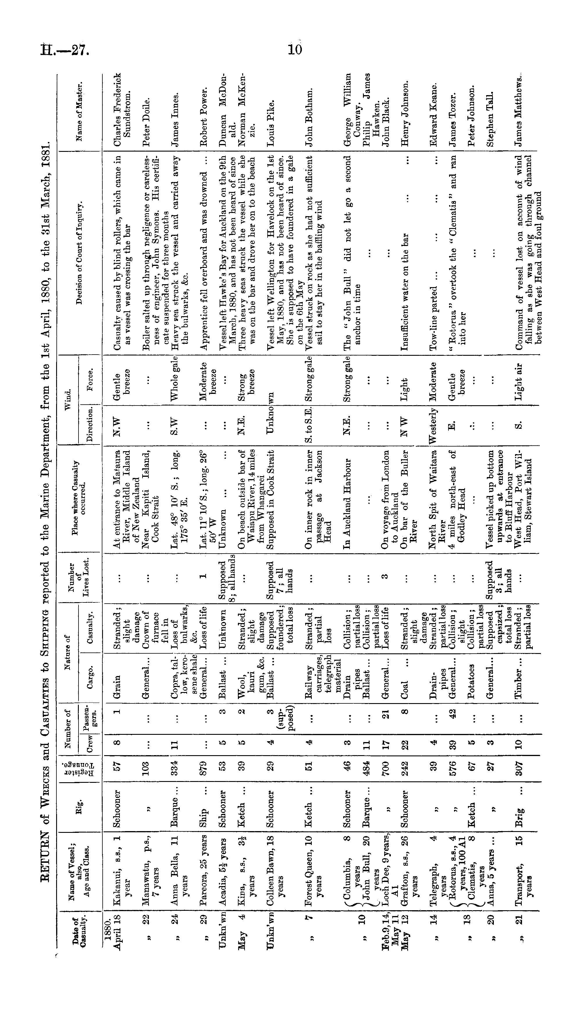 RETURN of Wrecks and Casualties to Shipping reported to the Marine Department, from the 1st April, 1880, to the 31st March, 1881.