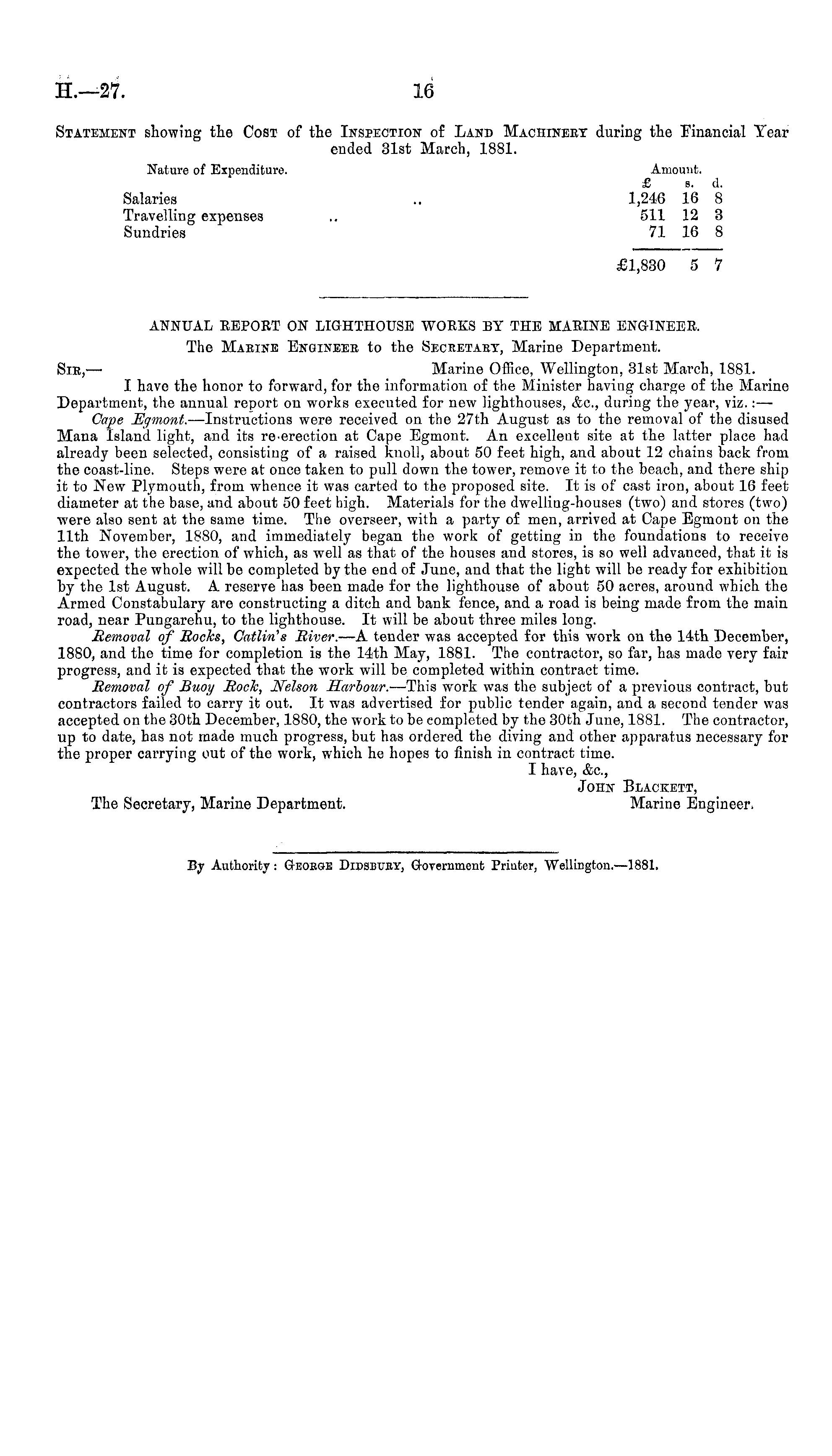 ANNUAL REPORT ON LIGHTHOUSE WORKS BY THE MARINE ENGINEER. The Maeine Engineek to the Secbetaby, Marine Department. Sib,— Marine Office, Wellington, 31st March, 1881. I have the honor to forward, for the information of the Minister having charge of the Marine Department, the annual report on works executed for new lighthouses, &c, during the year, viz.: —- Cape JSgmont. —lnstructions were received on the 27th August as to the removal of the disused Mana Island light, and its re-erection at Cape Egmont. An excellent site at the latter place had already been selected, consisting of a raised knoll, about 50 feet high, and about 12 chains back from the coast-line. Steps were at once taken to pull down the tower, remove it to the beach, and there ship it to New Plymouth, from whence it was carted to the proposed site. It is of cast iron, about 1G feet diameter at the base, and about 50 feet high. Materials for the dwelling-houses (two) and stores (two) were also sent at the same time. The overseer, with a party of men, arrived at Cape Egmont on the 11th November, 1880, and immediately began the work of getting in the foundations to receive the tower, the erection of which, as well as that of the houses and stores, is so well advanced, that it is expected the whole will be completed by the end of June, and that the light will be ready for exhibition by the Ist August. A reserve has been made for the lighthouse of about 50 acres, around which the Armed Constabulary are constructing a ditch and bank fence, and a road is being made from the main road, near Pungarefiu, to the lighthouse. It will be about three miles long. Removal of Rocks, Oatlin's River. —A tender was accepted for this work on the 14th. December, 1880, and the time for completion is the 14th May, 1881. The contractor, so far, has made very fair progress, and it is expected that the work will be completed within contract time. Removal of Buoy Rock, Nelson Harbour. —This work was the subject of a previous contract, but contractors failed to carry it out. It was advertised for public tender again, and a second tender was accepted on the 30th December, 1880, the work to be completed by the 30th June, 1881. The contractor, up to date, has not made much progress, but has ordered the diving and other apparatus necessary for the proper carrying out of the work, which he hopes to finish in contract time. I have, &c, John BiACKETT, The Secretary, Marine Department. Marine Engineer.