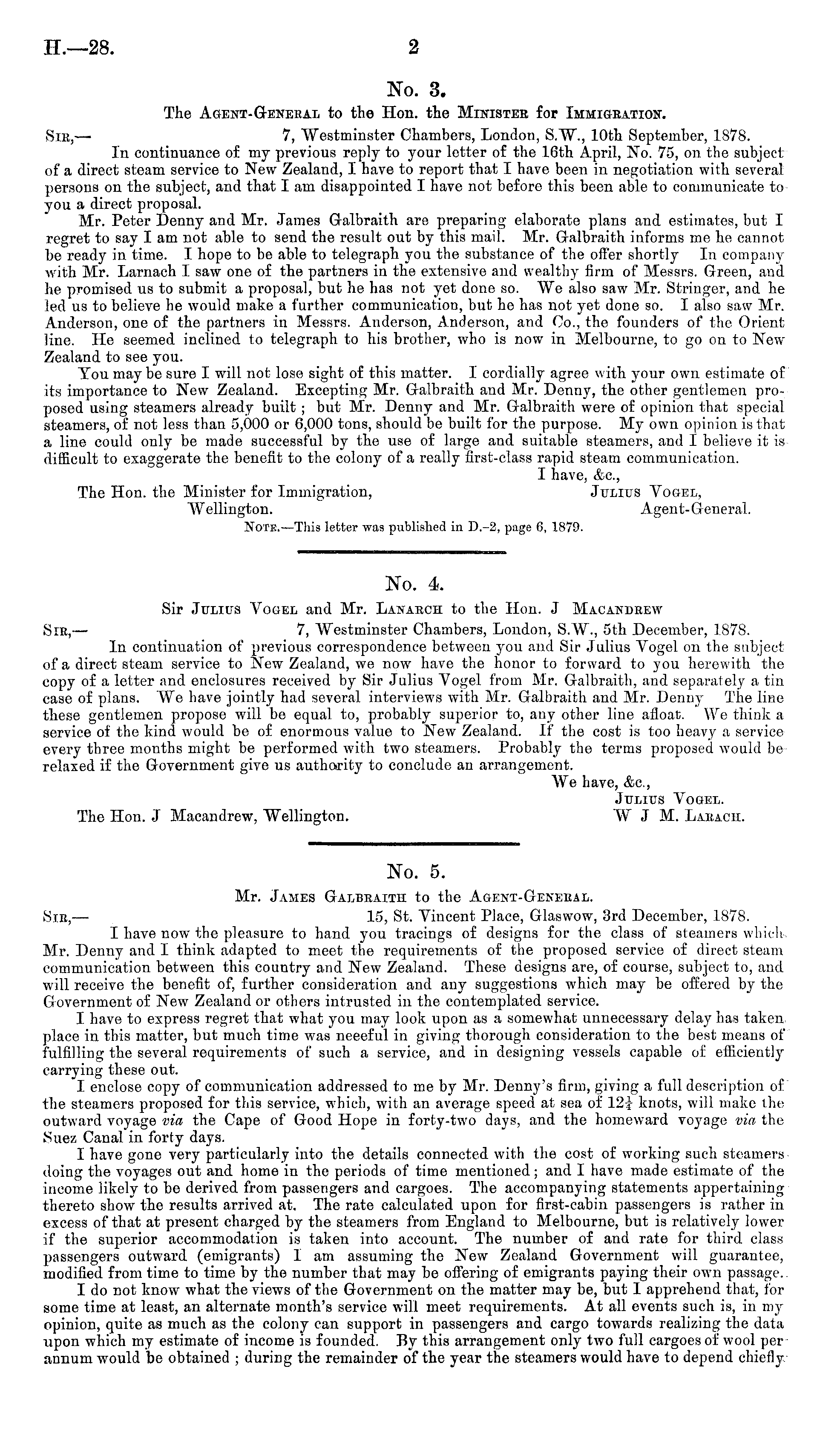 No. 4. Sir Julius Vogel and Mr. Lanabch to the Hon. J Macandrew Sir, — 7, Westminster Chambers, London, S.W., sth December, 1878. In continuation of previous correspondence between you and Sir Julius Vogel on the subject of a direct steam service to New Zealand, we now have the honor to forward to you herewith the copy of a letter and enclosures received by Sir Julius Vogel from Mr. Galbraith, and separately a tin case of plans. We have jointly had several interviews with Mr. Galbraith and Mr. Denny The line these gentlemen propose will be equal to, probably superior to, any other line afloat. We think a service of the kind would be of enormous value to New Zealand. If the cost is too heavy a service every three months might be performed with two steamers. Probably the terms proposed would be relaxed if the Government give us authority to conclude an arrangement. We have, &c, Julius Vooel. The Hon. J Macandrew, Wellington. W J M. Laeach.