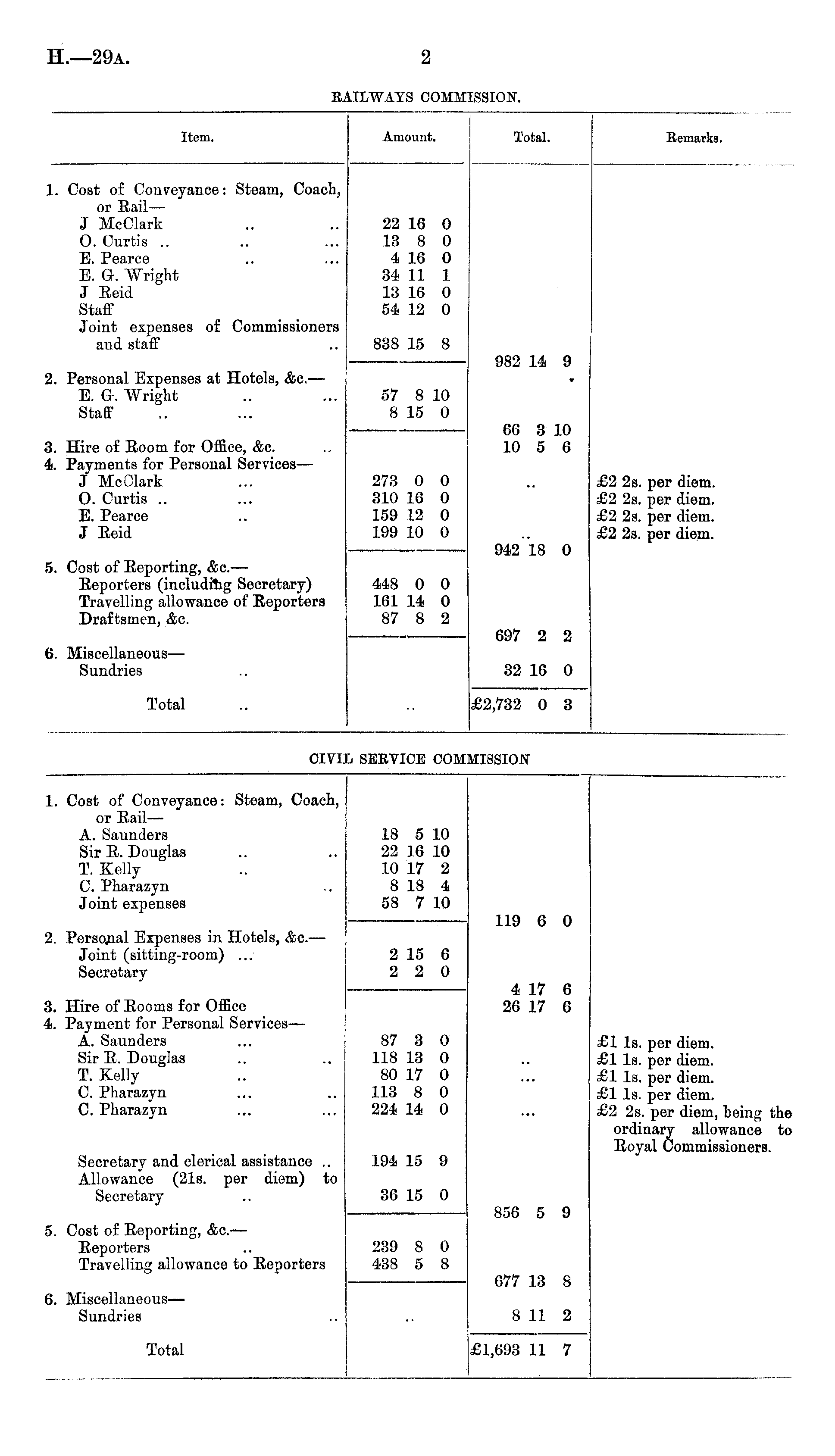 Item. Amount. Total. Remarks. 1. Cost of Conveyance: Steam, Coach, or Eail — J McClark O. Curtis .. E. Pearce B. G-. Wright J Eeid Staff Joint expenses of Commissioners and staff 22 16 13 8 4 16 34 11 13 16 54 12 0 0 0 1 0 0 838 15 8 1. Personal Expenses at Hotels, &c. — E. G-. Wright Staff 982 14 9 * 57 8 10 8 15 0 66 3 10 10 5 6 i. Hire of Eoom for Office, &c. L Payments for Personal Services— J McOlark O. Curtis .. E. Pearce J Eeid 273 0 310 16 159 12 199 10 0 0 0 0 £2 2s. per diem. £2 2s. per diem. £2 2s. per diem. £2 2s. per diem. 5. Cost of Eeporting, &c. — Eeporters (including Secretary) Travelling allowance of Eeporters Draftsmen, &c. 942 18 0 448 0 161 14 87 8 0 0 2 697 2 2 S. Miscellaneous — Sundries 32 16 0 Total £2,732 0 3