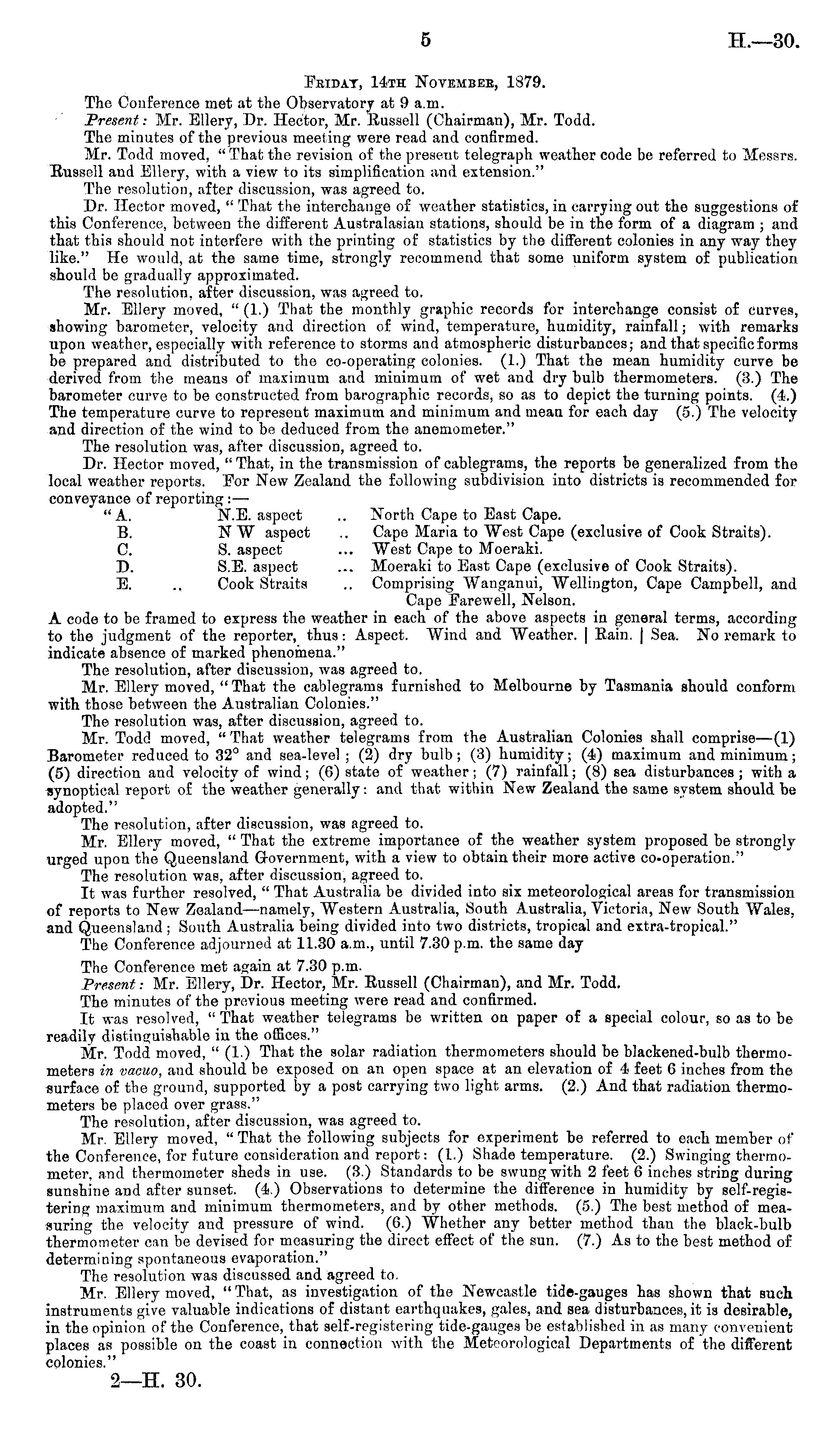 Feidat, 14th November, 1879. The Conference met at the Observatory at 9 a.m. Present: Mr. Ellery, Dr. Hector, Mr. Eussell (Chairman), Mr. Todd. The minutes of the previous meeting were read and confirmed. Mr. Todd moved, " That the revision of the preseut telegraph weather code be referred to Messrs. Eussell and Ellery, with a view to its simplification and extension." The resolution, after discussion, was agreed to. Dr. Hector moved, " That the interchange of weather statistics, in carrying out the suggestions of this Conference, between the different Australasian stations, should be in the form of a diagram ; and that this should not interfere with the printing of statistics by the different colonies in any way they like." He would, at the same time, strongly recommend that some uniform system of publication should be gradually approximated. The resolution, after discussion, was agreed to. Mr. Ellery moved, " (1.) That the monthly graphic records for interchange consist of curves, showing barometer, velocity and direction of wind, temperature, humidity, rainfall; with remarks upon weather, especially with reference to storms and atmospheric disturbances; and that specific forms be prepared and distributed to the co-operating colonies. (1.) That the mean humidity curve be derived from the means of maximum and minimum of wet and dry bulb thermometers. (3.) The barometer curve to be constructed from barographic records, so as to depict the turning points. (4.) The temperature curve to represent maximum and minimum and mean for each day (5.) The velocity and direction of the wind to be deduced from the anemometer." The resolution was, after discussion, agreed to. Dr. Hector moved, " That, in the transmission of cablegrams, the reports be generalized from the local weather reports. For New Zealand the following subdivision into districts is recommended for conveyance of reporting : — "A. N.E. aspect .. North Cape to East Cape. B. N W aspect .. Cape Maria to West Cape (exclusive of Cook Straits). C. S. aspect ... West Cape to Moeraki. D. S.E. aspect ... Moeraki to East Cape (exclusive of Cook Straits). E. ~ Cook Straits .. Comprising Wanganui, Wellington, Cape Campbell, and Cape Farewell, Nelson. A code to be framed to express the weather in each of the above aspects in general terms, according to the judgment of the reporter, thus: Aspect. Wind and Weather. | Bain. | Sea. No remark to indicate absence of marked phenomena." The resolution, after discussion, was agreed to. Mr. Ellery moved, " That the cablegrams furnished to Melbourne by Tasmania should conform with those between the Australian Colonies." The resolution was, after discussion, agreed to. Mr. Todd moved, " That weather telegrams from the Australian Colonies shall comprise—(1) Barometer reduced to 32° and sea-level ; (2) dry bulb; (3) humidity; (4) maximum and minimum; (5) direction and velocity of wind; (6) state of weather; (7) rainfall; (8) sea disturbances ; with a synoptical report of the weather generally: and that within New Zealand the same system should be adopted." The resolution, after discussion, was agreed to. Mr. Ellery moved, " That the extreme importance of the weather system proposed be strongly urged upon the Queensland Government, with a view to obtain their more active co-operation." The resolution was, after discussion, agreed to. It was further resolved, " That Australia be divided into six meteorological areas for transmission of reports to New Zealand—-namely, Western Australia, South Australia, Victoria, New South Wales, and Queensland ; South Australia being divided into two districts, tropical and extra-tropical." The Conference adjourned at 11.30 a.m., until 7.30 p.m. the same day The Conference met again at 7.30 p.m. Present: Mr. Ellery, Dr. Hector, Mr. Eussell (Chairman), and Mr. Todd. The minutes of the previous meeting were read and confirmed. It was resolved, "That weather telegrams be written on paper of a special colour, so as to be readily distinguishable in the offices." Mr. Todd moved, " (1.) That the solar radiation thermometers should be blackened-bulb thermometers in vacuo, and should be exposed on an open space at an elevation of 4 feet 6 inches from the surface of the ground, supported by a post carrying two light arms. (2.) And that radiation thermometers be placed over grass." The resolution, after discussion, was agreed to. Mr. Ellery moved, " That the following subjects for experiment be referred to each member of the Conference, for future consideration and report: (1.) Shade temperature. (2.) Swinging thermometer, and thermometer sheds in use. (3.) Standards to be swung with 2 feet 6 inches string during sunshine and after sunset. (4.) Observations to determine the difference in humidity by self-regis-tering maximum and minimum thermometers, and by other methods. (5.) The best method of measuring the velocity and pressure of wind. (6.) Whether any better method than the black-bulb thermometer can be devised for measuring the direct effect of the sun. (7.) As to the best method of determining spontaneous evaporation." The resolution was discussed and agreed to. Mr. Ellery moved, " That, as investigation of the Newcastle tide-gauges has shown that such instruments give valuable indications of distant earthquakes, gales, and sea disturbances, it is desirable, in the opinion of the Conference, that self-registering tide-gauges be established in as many convenient places as possible on the coast in connection with the Meteorological Departments of the different colonies."