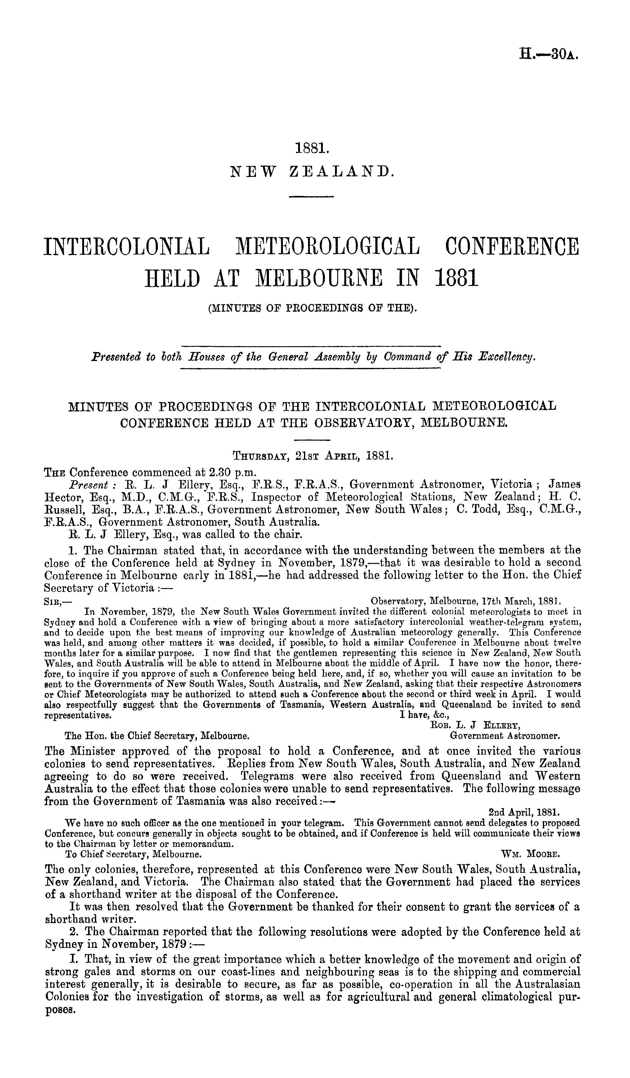 Thursday, 21st Apeil, 1881. The Conference commenced at 2.30 p.m. Present : E. L. J Ellery, Esq., F.E.S., F.E.A.S., Government Astronomer, Victoria ; James Hector, Esq., M.D., C.M.G., F.E.S., Inspector of Meteorological Stations, New Zealand; H. C. Eussell, Esq., 8.A., F.E.A.S., Government Astronomer, New South Wales; C. Todd, Esq., C.M.G., F.E.A.S., Government Astronomer, South Australia. E. L. J Ellery, Esq., was called to the chair. 1. The Chairman stated that, in accordance with the understanding between the members at the close of the Conference held at Sydney in November, 1879, —that it was desirable to hold a second Conference in Melbourne early in 1881, —he had addressed the following letter to the Hon. the Chief Secretary of Victoria :— SIK, — Observatory, Melbourne, 17th March, 1881. In November, 1879, the New South Wales Government invited the different colonial meteorologists to meet in Sydney and hold a Conference with a view of bringing about a more satisfactory intercolonial weather-telegram system, and to decide upon the best means of improving our knowledge of Australian meteorology generally. This Conference was held, and among other matters it was decided, if possible, to hold a similar Conference in Melbourne about twelve months later for a similar purpose. I now find that the gentlemen representing this science in New Zealand, New South Wales, and South Australia will be able to attend in Melbourne about the middle of April. I have now the honor, therefore, to inquire if you approve of such a Conference being held here, and, if so, whether you will cause an invitation to be sent to the Governments of New South Wales, South Australia, and New Zealand, asking that their respective Astronomers or Chief Meteorologists may be authorized to attend such a Conference about the second or third week in April. I would also respectfully suggest that the Governments of Tasmania, Western Australia, and Queensland be invited to send representatives. I have, &c., Hob. L. J Elleey, The Hon. the Chief Secretary, Melbourne. Government Astronomer. The Minister approved of the proposal to hold a Conference, and at once invited the various colonies to send representatives. Ee plies from New South Wales, South Australia, and New Zealand agreeing to do so were received. Telegrams were also received from Queensland and Western Australia to the effect that those colonies were unable to send representatives. The following message from the Government of Tasmania was also received:—• 2nd April, 1881. We have no such officer as the one mentioned in your telegram. This Government cannot send delegates to proposed Conference, but concurs generally in objects sought to be obtained, and if Conference is held will communicate their views to the Chairman by letter or memorandum. To Chief Secretary, Melbourne. Wm. Moobe. The only colonies, therefore, represented at this Conference were New South Wales, South _lustralia, New Zealand, and Victoria. The Chairman also stated that the Government had placed the services of a shorthand writer at the disposal of the Conference. It was then resolved that the Government be thanked for their consent to grant the services of a shorthand writer. 2. The Chairman reported that the following resolutions were adopted by the Conference held at Sydney in November, 1879 :— I. That, in view of the great importance which a better knowledge of the movement and origin of strong gales and storms on our coast-lines and neighbouring seas is to the shipping and commercial interest generally, it is desirable to secure, as far as possible, co-operation in all the Australasian Colonies for tbe investigation of storms, as well as for agricultural and general climatological purposes.