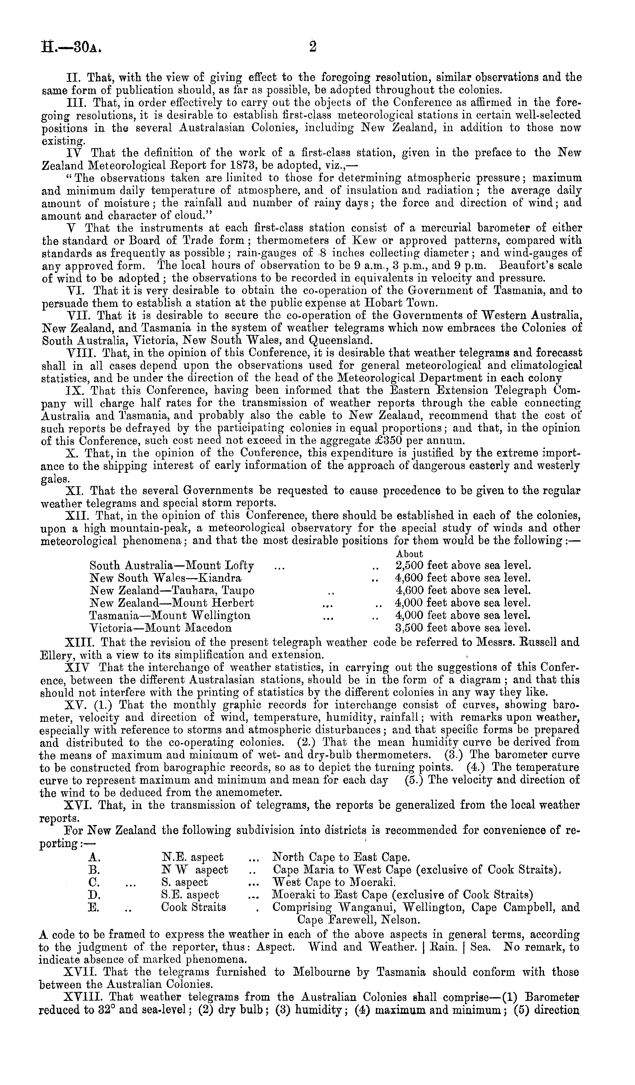 11. That, with the view of giving effect to the foregoing resolution, similar observations and the same form of publication should, as far as possible, be adopted throughout the colonies. 111. That, in order effectively to carry out the objects of the Conference as affirmed in the foregoing resolutions, it is desirable to establish first-class meteorological stations in certain well-selected positions in the several Australasian Colonies, including New Zealand, in addition to those now existing. IV That the definition of the work of a first-class station, given in the preface to the New Zealand Meteorological Eeport for 1873, be adopted, viz., — "The observations taken are limited to those for determining atmospheric pressure; maximum and minimum daily temperature of atmosphere, and of insulation and radiation; the average daily amount of moisture ; the rainfall and number of rainy days; the force and direction of wind; and amount and character of cloud." V That the instruments at each first-class station consist of a mercurial barometer of either the standard or Board of Trade form ; thermometers of Kew or approved patterns, compared with standards as frequently as possible ; rain-gauges of 8 inches collecting diameter ; and wind-gauges of any approved form. The local hours of observation to be 9 a.m., 3 p.m., and 9 p.m. Beaufort's scale of wind, to be adopted ; the observations to be recorded in equivalents in velocity and pressure. VI. That it is very desirable to obtain the co-operation of the Government of Tasmania, and to persuade them to establish a station at the public expense at Hobart Town. VII. That it is desirable to secure the co-operation of the Governments of Western Australia, New Zealand, and Tasmania in the system of weather telegrams which now embraces the Colonies of South Australia, Victoria, New South Wales, and Queensland. VIII. That, in the opinion of this Conference, it is desirable that weather telegrams and forecasst shall in all cases depend upon the observations used for general meteorological and climatological statistics, and be under the direction of the head of the Meteorological Department in each colony IX. That this Conference, having been informed that the Eastern Extension Telegraph Company will charge half rates for the transmission of weather reports through the cable connecting Australia and Tasmania, and probably also the cable to New Zealand, recommend that the cost of such reports be defrayed by the participating colonies in equal proportions; and that, in the opinion of this Conference, such cost need not exceed in the aggregate £350 per annum. X. That, in the opinion of the Conference, this expenditure is justified by the extreme importance to the shipping interest of early information of the approach of dangerous easterly and westerly gales. XL That the several Governments be requested to cause precedence to be given to the regular weather telegrams and special storm reports. XII. That, in the opinion of this Conference, there should be established in each of the colonies, upon a high mountain-peak, a meteorological observatory for the special study of winds and other meteorological phenomena; and that the most desirable positions for them would be the following : — About South Australia —Mount Lofty ... .. 2,500 feet above sea level. New South Wales—Kiandra .. 4,600 feet above sea level. New Zealand —Tauhara, Taupo .. 4,600 feet above sea level. New Zealand—Mount Herbert ... .. 4,000 feet above sea level. Tasmania —Mount Wellington ... .. 4,000 feet above sea level. Victoria —Mount Macedon 3,500 feet above sea level. XIII. That the revision of the present telegraph weather code be referred to Messrs. Eussell and Ellery, with a view to its simplification and extension. XIV That the interchange of weather statistics, in carrying out the suggestions of this Conference, between the different Australasian stations, should be in the form of a diagram ; and that this should not interfere with the printing of statistics by the different colonies in any way they like. XV. (1.) That the monthly graphic records for interchange consist of curves, showing barometer, velocity and direction of wind, temperature, humidity, rainfall; with remarks upon weather, especially with reference to storms and atmospheric disturbances ; and that specific forms be prepared and distributed to the co-operating colonies. (2.) That the mean humidity curve be derived from the means of maximum and minimum of wet- and dry-bulb thermometers. (3.) The barometer curve to be constructed from barographic records, so as to depict the turning points. (4.) The temperature curve to represent maximum and minimum and mean for each day (5.) The velocity and direction of the wind to be deduced from the anemometer. XVI. That, in the transmission of telegrams, the reports be generalized from the local weather reports. For New Zealand the following subdivision into districts is recommended for convenience of reporting :— A. N.E. aspect ... North Cape to East Cape. B. NW aspect .. Cape Maria to West Cape (exclusive of Cook Straits). C. ... S. aspect ... West Cape to Moeraki. D. S.E. aspect ... Moeraki to East Cape (exclusive of Cook Straits) E. .. Cook Straits . Comprising Wanganui, Wellington, Cape Campbell, and Cape Farewell, Nelson. A code to be framed to express the weather in each of the above aspects in general terms, according to the judgment of the reporter, thus: Aspect, Wind and Weather. | Eain. j Sea. No remark, to indicate absence of marked phenomena. XVII. That the telegrams furnished to Melbourne by Tasmania should conform with those between the Australian Colonies. XVIII. That weather telegrams from the Australian Colonies shall comprise—(l) Barometer reduced to 32° and sea-level; (2) dry bulb; (3) humidity; (4) maximum and minimum; (5) direction