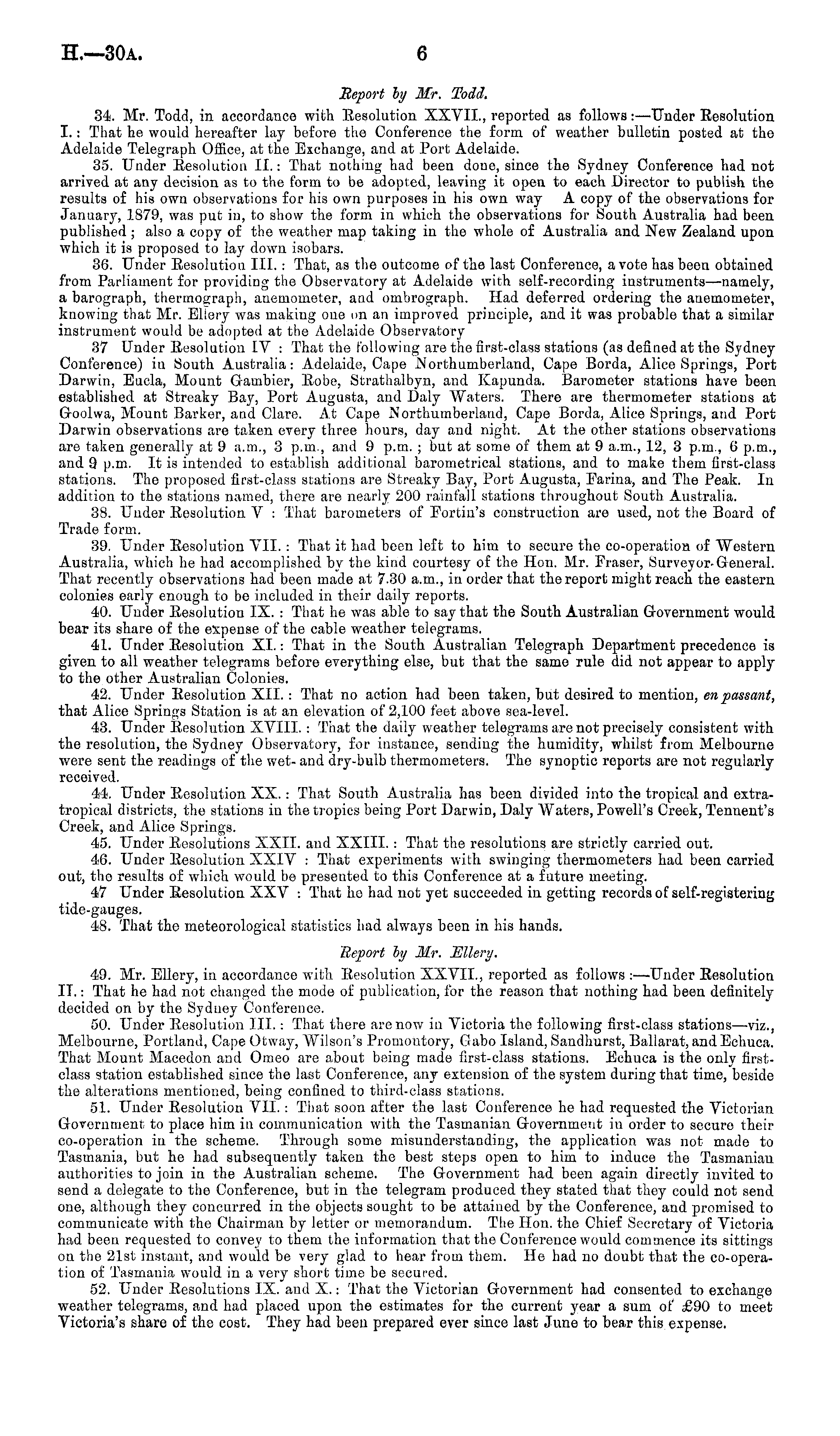 Report by Mr. Todd. 34. Mr. Todd, in accordance with Eesolution XXVII., reported as follows:—Under Eesolution I.: That he would hereafter lay before the Conference the form of weather bulletin posted at the Adelaide Telegraph Office, at the Exchange, and at Port Adelaide. 35. Under Eesolution II.: That nothing had been done, since the Sydney Conference had not arrived at any decision as to the form to be adopted, leaving it open to each Director to publish the results of his own observations for his own purposes in his own way A copy of the observations for January, 1879, was put in, to show the form in which the observations for South Australia had been published ; also a copy of the weather map taking in the whole of Australia and New Zealand upon which it is proposed to lay down isobars. 36. Under Eesolution 111. : That, as the outcome of the last Conference, a vote has been obtained from Parliament for providing the Observatory at Adelaide with self-recording instruments —namely, a barograph, thermograph, anemometer, and ombrograph. Had deferred ordering the anemometer, knowing that Mr. Ellery was making one on an improved principle, and it was probable that a similar instrument would be adopted at the Adelaide Observatory 37 Under Eesolution IV : That the following are the first-class stations (as defined at the Sydney Conference) in South Australia: Adelaide, Cape Northumberland, Cape Borda, Alice Springs, Port Darwin, Eucla, Mount Gambier, Eobe, Strathalbyn, and Kapunda. Barometer stations have been established at Streaky Bay, Port Augusta, and Daly Waters. There are thermometer stations at Goolwa, Mount Barker, and Clare. At Cape Northumberland, Cape Borda, Alice Springs, and Port Darwin observations are taken every three hours, day and night. At the other stations observations are taken generally at 9 a.m., 3 p.m., and 9 p.m. ; but at some of them at 9 a.m., 12, 3 p.m., 6 p.m., and 9 p.m. It is intended to establish additional barometrical stations, and to make them first-class stations. The proposed first-class stations are Streaky Bay, Port Augusta, Farina, and The Peak. In addition to the stations named, there are nearly 200 rainfall stations throughout South Australia. 38. Under Eesolution V : That barometers of Fortiu's construction are used, not the Board of Trade form. 39. Under Eesolution VII. : That it had been left to him to secure the co-operation of Western Australia, which he had accomplished by the kind courtesy of the Hon. Mr. Fraser, Surveyor-General. That recently observations had been made at 7.30 a.m., in order that the report might reach the eastern colonies early enough to be included in their daily reports. 40. Under Eesolution IX. : That he was able to say that the South Australian Government would bear its share of the expense of the cable weather telegrams. 41. Under Eesolution XL: That in the South Australian Telegraph Department precedence is given to all weather telegrams before everything else, but that the same rule did not appear to apply to the other Australian Colonies. 42. Under Eesolution XII. : That no action had been taken, but desired to mention, en passant, that Alice Springs Station is at an elevation of 2,100 feet above sea-level. 43. Under Eesolution XVIII.: That the daily weather telegrams are not precisely consistent with the resolution, the Sydney Observatory, for instance, sending the humidity, whilst from Melbourne were sent the readings of the wet- and dry-bulb thermometers. The synoptic reports are not regularly received. 44. Under Eesolution XX.: That South Australia has been divided into the tropical and extratropical districts, the stations in the tropics being Port Darwin, Daly Waters, Powell's Creek, Tennent's Creek, and Alice Springs. 45. Under Eesolutions XXII. and XXIII. : That the resolutions are strictly carried out. 46. Under Eesolution XXIV : That experiments with swinging thermometers had been carried out, the results of which would be presented to this Conference at a future meeting. 47 Under Eesolution XXV : That he had not yet succeeded in getting records of self-registering tide-gauges. 48. That the meteorological statistics had always been in his hands. Report by Mr. Ellery. 49. Mr. Ellery, in accordance with Eesolution XXVII., reported as follows :—Under Eesolution IT.: That he had not changed the mode of publication, for the reason that nothing had been definitely decided on by the Sydney Conference. 50. Under Eesolution III.: That there are now in Victoria the following first-class stations—viz., Melbourne, Portland, Cape Otway, Wilson's Promontory, Gabo Island, Sandhurst, Ballarat, and Echuca. That Mount Macedon and Omeo are about being made first-class stations. Echuca is the only firstclass station established since the last Conference, any extension of the system during that time, beside the alterations mentioned, being confined to third-class stations. 51. Under Eesolution VII. : That soon after the last Conference he had requested the Victorian Government to place him in communication with the Tasmanian Government in order to secure their co-operation in the scheme. Through some misunderstanding, the application was not made to Tasmania, but he had subsequently taken the best steps open to him to induce the Tasmanian authorities to join in the Australian scheme. The Government had been again directly invited to send a delegate to the Conference, but in the telegram produced they stated that they could not send one, although they concurred in the objects sought to be attained by the Conference, and promised to communicate with the Chairman by letter or memorandum. The Hon. the Chief Secretary of Victoria had been requested to convey to them the information that the Conference would commence its sittings on the 21st instant, and would be very glad to hear from them. He had no doubt that the co-opera-tion of Tasmania would in a very short time be secured. 52. Under Eesolutions IX. and X.: That the V